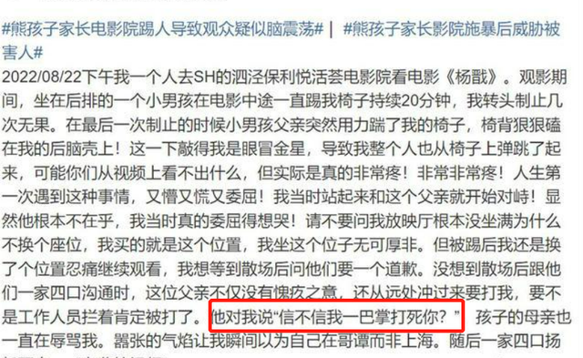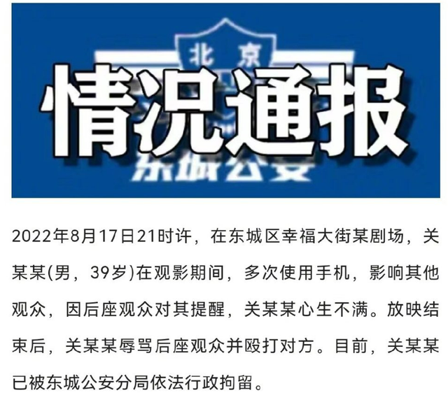 影院观影乱象,又双叒叕登上热搜了。 这次是咋回事呢? 上海某影院内。 一女子在观影过程中,反复遭受后座熊孩子连环踢。 熊孩子是家长带过来的。 于是,女子转头提示大人,让孩子收敛一下。 可谁知,熊孩子父亲不光不听劝,还恶狠狠地踹了女子座椅,导致她顿时头晕眼花。 暴力行径发生后,熊孩子父亲不光没有感到愧疚,反而对女子发出人身威胁。 无辜遭受暴力的女性观众,只好报警处置惩罚。 令人气愤的是,熊孩子父亲到了警员眼前,依然不以为自己做错。 哗闹着问对方,“我打你哪儿了?” 乃至说出“我只给200”的话,就操持发迹脱离。 竟然他不明白错在那里。 那扒姐就来掰扯掰扯。 起首,这位父亲在孩子犯错时,不光没有实时克制辅导,反而放任不良举动滚雪球。 其次,在女性观众劝阻之后,他非但没故意识到错误,反而直接拳脚相向,导致整个影厅的观众都陷入恐慌中。 教导缺位,放纵乱象,暴力横行,就是他的不对。 截图来自当事人微博自述 在父亲的眼里,这件事用200块就能办理。 但那位女性观众呢? 颠末医院开端诊断,该女子头部软构造挫伤,存在脑震荡大概。 她不光身材受到伤害,乃至大概出现心田阴影,以后都不敢走进影戏院。 不足为奇,北京迩来也发生了雷同变乱。 8月17日,东城区某剧场。 某夫君在观影期间,多次利用手机,影响其他观众。 在后座观众提示后,他心生不满。 于是,在影片放映竣过后,该夫君唾骂并暴力殴打了后座观众。 报警后,该夫君已被东城公安分局依法行政拘留。 如许令人寒心的消息,着实每年都在发生。 根本离不开这几大要素: 屏摄、打电话、踢座椅、划幕布...... 说到这里,大概有人要说了,“我都费钱了啊,屏摄怎么了?剧透怎么了?” 影戏院简直是放松身心、消遣娱乐的地方。 但它也是须要服从礼仪的公共场所。 进入公共场所的那一刻起,就要有规则意识。 想想我们去超市付款的时间,为啥要列队?过马路的时间,为啥要看红绿灯?去图书馆的时间,为啥要闭嘴? 都是一个原理。 由于我们知道,在公共场所做出不文明举动的结果是什么。 怎么到影戏院,就开始不管掉臂不文明白呢? 说白了,当影戏院灯光熄灭后,有些人就开始揣着明白装糊涂。 只要身边乌漆嘛黑的,脱鞋抖腿就没人望见。 只要身边乌漆嘛黑的,谈天接电话就没人管我。 只要身边乌漆嘛黑的,我想干什么就夺目什么。 不文明观影,纯粹是自发举动。 别说你不懂观影礼仪。 每张影戏票背后,都写着: 克制吸烟、拍摄、灌音录影。 将手机调至静音状态。 自发服从影院的观影条例,维护观影环境。 除此之外,影院还会用广告牌以及取票呆板来提示观众,要维护观影秩序。 在已经得知观影礼仪的环境下,依然要做不文明举动,只能说是规则意识短缺的体现。 那要怎么做,才华淘汰影院不文明乱象呢? 这须要个人、影院以致社会共同监视。 起首,观众须要进步对文明观影的器重。 像遍及垃圾分类、交通规则一样来服从。 其次,影院要增强观影礼仪的宣传力度。 根据《影戏产业促进法》第三十三条规定: 影戏院应当服从治安、消防、公共场所卫生等法律、行政法规,维护放映场所的公共秩序和环境卫生,保障观众的安全与康健。 除了在影票印上文明须知外,影戏院还可以拍摄视频物料,在观影前举行会合提示。 像百老汇影院,就做了一支可爱的视频,来先容了文明观影的告急性。 第三,社会层面的话,干系部门可以公布更多乱象整治案例,起到警示作用。 像开头提到的上海北京两起乱象变乱,施暴者都受到了行政拘留的处罚。 信任只要这三方面共同发力,影院不文明举动就会越来越少。 不得不说,确实有人由于秩序乱象,淘汰了去影戏院的次数。 乃至以为流媒体可以取代它。 但扒姐想说,影戏院依然无法被取代。 去影院观影,有种仪式感。 你无法停息或快进,必须全神贯注的盯着它,才华在得到最极致的视觉感受。 去影院观影,能感受到影像技能革新。 卡梅隆用《阿凡达》,让影戏从2D期间迈入3D期间。 李安《比利·林恩的中场战事》,证明了120帧极致沉醉感的魅力。 这些震撼的视听武艺,依然只能在影院里感受。 另有一部门去影戏院,是为了得到感情体验。 通过看爱情片,得到感情支持。通过看笑剧,劳绩欢声笑语。 以是影戏院,是不能被取代,更不应灭亡的。 应该灭亡的,是影戏院里的失德乱象。 为了保卫这个光影编织的梦境之地,请杜绝不文明的观影举动。 只要如许,才华让爱影戏的人,继承爱影戏。 |