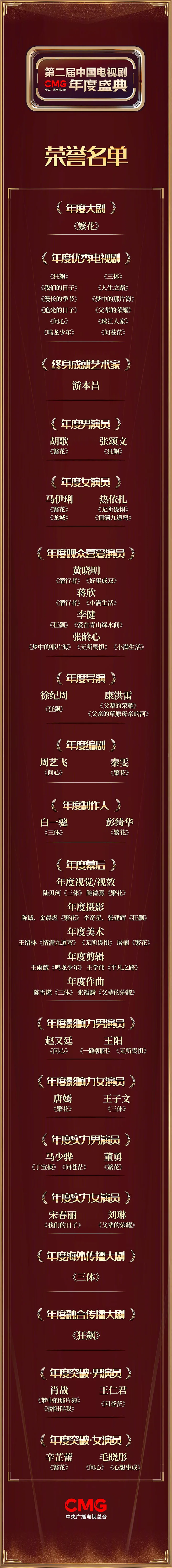 潮消息客户端 记者 何晓婷 2月10日(大年代朔)晚,CMG第二届中国电视剧年度盛典在总台央视综合频道(CCTV-1)播出,18项年度荣誉发表。盛典还发布了2024年中国电视剧发展趋势关键词、中国电视剧佳构制播同盟系列筹划。 盛典现场发表了“年度大剧”“年度精良电视剧”“年度男女演员”“终身成绩艺术家”“年度观众喜欢演员”“年度导演”“年度编剧”“年度外洋流传大剧”“年度融合流传大剧”等18项荣誉。 深受观众喜欢的电视剧创作者、业界着名流士欢聚一堂,共同回顾2023年的佳作,等候2024年的精彩。 已往一年,大批佳构电视剧涌现荧屏,《狂飙》《三体》《我们的日子》《人生之路》《漫长的季候》《梦中的那片海》《追光的日子》《父辈的光彩》《问心》《珠江人家》《鸣龙少年》《问迷茫》12部各具风格的作品得到了“年度精良电视剧”荣誉。 依附张力十足的群像塑造和风雅深厚的期间形貌,“十年磨一剑”的《繁花》将备受瞩目的“年度大剧”荣誉收入囊中。 别的,实现巨细屏联动破圈流传的由浙江文化艺术发展基金扶持的《狂飙》和深受环球观众喜欢的《三体》分获“年度融合流传大剧”“年度外洋流传大剧”荣誉。 在《繁花》《狂飙》《情满九道弯》中塑造了鲜活形象的演员胡歌、张颂文、马伊琍、热依扎得到“年度男女演员”荣誉。 马少骅、董勇、宋春丽、刘琳依附博识风雅的演技,劳绩“年度力气男女演员”荣誉。 赵又廷、王阳、唐嫣、王子文以朴拙的表达与大众产生猛烈的感情毗连,得到“年度影响力男女演员”荣誉。 在差别范例脚色中突破自我的肖战、王仁君、辛芷蕾、毛晓彤得到了“年度突破男女演员”荣誉。 描绘出大众喜欢脚色的黄晓明、蒋欣、李健、张龄心则劳绩了“年度观众喜欢演员”荣誉。 带给无数观众欢笑与感动的演员游本昌得到了“终身成绩艺术家”荣誉。 当游本昌登场时,全场高朋起立,鼓掌致敬。 30多年前,游本昌塑造的“鞋儿破、帽儿破”的济公形象给观众留下深刻影象。 耄耋之年的他再登荧屏,以极高的热情和专注精神投入到演出中,在电视剧《繁花》中塑造出运筹帷幄的“爷叔”形象,贡献了不少精彩瞬间。 手握沉甸甸的荣誉,游本昌不禁感慨道:“我好幸福!” 他将荣誉视作一面镜子,鼓励本身活到老、学到老、改到老、干到老、乐到老,并鼓励子弟:“要耐住性子,要有对峙性,我们一起积极向前!” CMG第二届中国电视剧年度盛典还发布了2024年中国电视剧发展趋势关键词:“新期间”“讲好中国故事”“精良传统文化”“人民美学”“文明互鉴”“经典文学改编”“中国式科幻”“文旅融合”“国际流传”“实际主义”。 十大关键词“剧透”着电视剧创作的发展态势与未来方向,再次拉满了观众对于中国电视剧的信心与等候。 每部剧作的背后,也都凝聚着幕后工作者的心血和积极。 《三体》总制片人白一骢,《繁花》总制片人彭绮华、编剧秦雯,《问心》编剧周艺飞,《狂飙》导演、编剧徐纪周,《父辈的光彩》《父亲的草原母亲的河》导演康洪雷分别得到了“年度制作人”“年度编剧”“年度导演”荣誉。 《三体》视觉导演陆贝珂,《繁花》视觉总监鲍德熹,拍照引导陈诚、金晨煜,美术总监屠楠,《狂飙》拍照引导李奇星、张建辉,《情满九道弯》《当仁不让》美术引导王绍林,《鸣龙少年》剪辑引导王雨薇,《平常之路》剪辑引导王学伟,《三体》音乐总监、作曲陈雪燃,《父辈的光彩》音乐总监张镒麟得到了“年度幕后”荣誉。 末了附上完备获奖名单—— “转载请注明出处” |