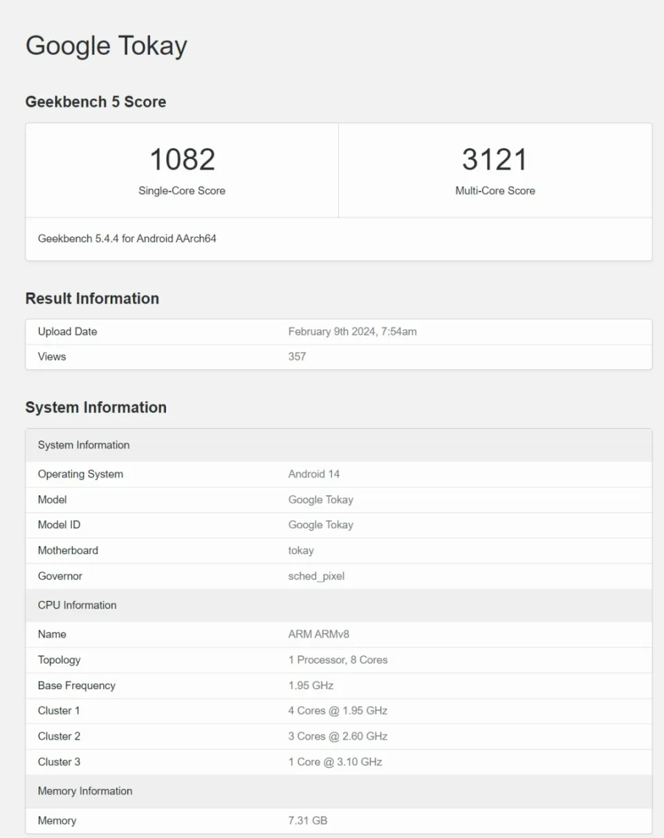 客岁10月,谷歌推出了全新的Pixel 8系列手机。 据悉,这一系列手机新品中搭载了谷歌自研的Tensor G3芯片。该芯片基于三星4nm工艺,配有1个Cortex-X3焦点、4个Cortex-A715焦点、4个Cortex-A510焦点。 如今,随着时间的推进,关于下一代谷歌自研芯片Tensor G4的消息也多了起来。 克日,一款代号为Tokay的谷歌手机现身Geekbench跑分网站。 根据Geekbench 5跑分网站体现,这款装备搭载的是谷歌Tensor G4芯片,单核效果为1082分,多核效果为3121分,拥有8GB内存。 据悉,谷歌Tensor G4芯片接纳8焦点计划,包罗1颗3.1GHz超大核、3颗2.6GHz大核和4颗1.95GHz小核,集成Mali-G715 GPU。 按照如今的消息来看,谷歌Tensor G4芯片将会由谷歌Pixel 9系列手机首发搭载。 此前,网上出现了谷歌Pixel 9和谷歌Pixel 9 Pro的表面渲染图,并公布了尺寸细节等信息。 消息爆料源称,谷歌Pixel 9将配备一块6.1英寸的直屏,相较于前代产物谷歌Pixel 8的6.2英寸屏幕,新机在尺寸上略有缩减。不外,新机的正面依然保存了居中打孔计划。 别的,谷歌Pixel 9的中框由圆角弧度造型改为直角中框方案,机身右侧配备有电源键和音量按键,底部则配备了USB-C 端口、扬声器以及SIM卡托盘。 联合渲染图还可以看出,新机背部的后摄模组接纳了全新的药丸状计划,而且初次在尺度版机型上配备了3个摄像头,预计新增长焦摄像头。 据先容,谷歌Pixel 9的机身尺寸为152.8x 71.9 x 8.5毫米,若算上摄像头的凸起部门,则厚度为12.0毫米。 同时,谷歌Pixel 9 Pro接纳了和谷歌Pixel 9相似的计划语言。 爆料称,谷歌Pixel 9 Pro将配备一块6.5英寸的直屏,机身尺寸为162.7x 76.6 x 8.5毫米,若算上摄像头的凸起部门,则厚度为12.0毫米。新机大概配备潜望式长焦传感器,主摄另有望支持可变光圈。 关于谷歌Pixel 9系列的更多消息暂时还没有出现,不外可以大抵参考前代产物。 作为参考,前代谷歌Pixel 8配备了一块6.2英寸LTPO屏幕,分辨率1080 x 2400,支持60-120Hz自顺应革新率,2000nit峰值亮度;谷歌Pixel 8 Pro接纳6.7英寸LTPO屏幕,分辨率1344 x 2992,支持 1-120Hz自顺应革新率,2400nit峰值亮度。 影像方面,谷歌Pixel 8后置5000万像素主摄+1200万像素超广角双摄组合;谷歌Pixel 8 Pro后置5000万像素主摄+4800万像素超广角+4800万像素潜望式长焦(5倍光学变焦)三摄组合。 电量快充方面,谷歌Pixel 8内置4575mAh电池,支持27W有线充电和18W无线充电;谷歌Pixel 8 Pro内置5050mAh电池,支持30W有线充电和23W无线充电。 其他方面,谷歌Pixel 8系列运行安卓14体系,支持7年安卓大版本软件更新,支持人脸辨认、指纹辨认、IP68防水防尘。 尚有爆料体现,谷歌Pixel Fold 2折叠屏手机也有望搭载谷歌Tensor G4芯片。不外,现实情况怎样还须要官方后续的公布,感爱好的朋侪可以保持关注。 |