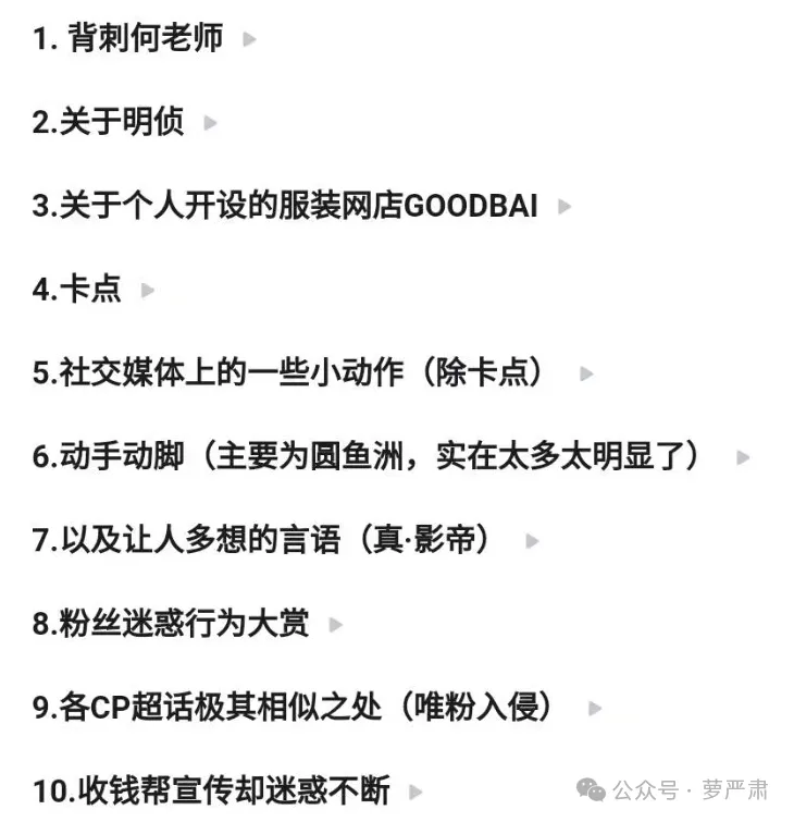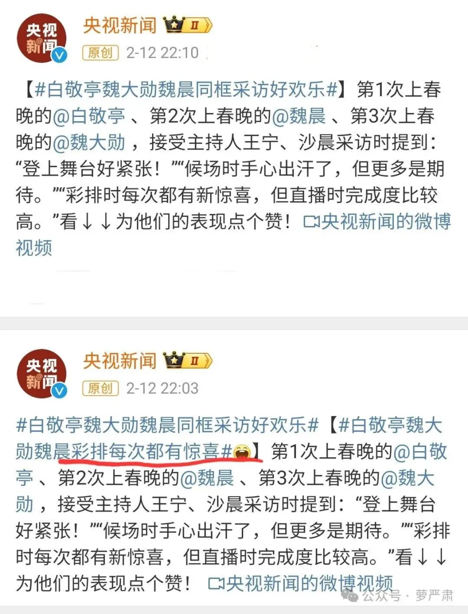 闲着也是闲着再来发点乐子吧。 春晚看似一个不起眼的节目《上春山》(白敬亭、魏大勋、魏晨合唱)引发网络破案:白敬亭有没有抢C位和故意易服服? 先看节目画面。 最初站位是白敬亭、魏大勋、魏晨依次站台阶从高到低。 白敬亭唱完后原地不动,魏大勋唱的时间只好各人都原地不动。 但这个台阶是个对称的外形,三个人只站在一侧不是有点希奇吗? 魏大勋唱完自己部门后上台阶,和白敬亭一起下台阶,魏晨才站上最高台阶。 因此网友猜疑最初安排应该是白敬亭唱完下台阶,魏大勋上,唱完再下。每个人轮着站在最高位置,才符合这首歌的标题《上春山》。也只有如许才气表明初始站位不对称的标题。 一个近间隔直拍中魏大勋的脚动了几下,被解读为欲上台阶而不得,是“无处安放的脚”。 别的整个舞台都有点紊乱,舞者和歌手经常在相反方向,但三个歌手不是编排好精准定点跟群舞相反以突出重点,只是恣意走走的感觉。以是更令人疑惑是不是整个走位都乱了节奏。 开头的视频在这里,过细看还能发现白敬亭第一句唱错了口型没对上。(支持真唱反对假唱!) 再来看衣服标题。白敬亭正式演出服装为玄色,别的两个人是白色,显得白敬亭最突出,但是和舞台完全不搭,黑衣服配白鞋也不悦目。 但之前的三人彩排背景照片和春晚海报图是全白服装(能看出来魏晨衣服也在变更和调解但始终是白色系。 小红书有一位筹划师“张突然”说白敬亭上春晚穿了自己做的衣服。批评:“老师是这件事之后改名叫突然的吗?” 央视频发布的大年月朔破晓发布了一个“春晚演员候场做什么”的视频,候场视频里白敬亭穿的照旧春晚海报里那件衣服 这个视频里魏大勋穿的是直播的衣服,魏晨白敬亭穿的不是。 春晚后的直播里谢娜提出易服服标题也被以为是个侧面证据:“你们彩排和本日穿的一样吗,有人变了吗?” 魏大勋站起来说:“我没变,他们变了。” 白敬亭说:“我们两个的服装是变了。”魏晨颔首。(别的演出完白敬亭又赶紧换了一身红衣服。) 谢娜不依不饶问:“是突然变的?”被魏大勋开打趣“这是不是直播”拦下。 别的一个央视消息的采访视频更被盘包浆了。白敬亭演出完换了红衣服,显得三个人里特别突出,猛一看以为是主持人。 魏大勋:“彩排的时间会出现各种各样的,(停顿),事儿……” 主持人:“跟我们说说,就喜好听如许的事儿。” 魏晨接话说:“有一次彩排的时间我跟大勋就先说好左边拜年,左边拜完了一转头小白一个人在右边,先给右边的朋侪拜完了。他准备往回走我们又把他推归去。”“每次反正都有新惊喜。” 主持人:“每次都不一样。” 之后又要现场回看演出段落。 白敬亭:“啊?” 魏大勋:“别别别……” 主持人:“你是第一个定调的人,你是起范儿的人,你假如要是塌了这个肩膀那哥哥们就很难接了呀。”“(第一次上春晚的人)……以为这个舞台特别大,特别空,你似乎用尽了力气都不知道怎么样让各人看到你和听到你,你有这种感受吗?” 主持人问他们上场前怎么鼓劲儿。魏大勋看起来有点嫌弃似的。 总结陈词的时间魏晨突然摸魏大勋:“大勋出汗啦?”之后演播室给他魏大勋拿纸擦汗他还真擦上了 央视还出了一个殊效轮换位置的《上春山》版本,被称为“手动上春山”。 从昨天到本日,B站和抖音上涌现了多个“春山学”视频,从各个角度分析白敬亭应该是抢位置了,其角度包罗但不限于:能不能听到白敬亭轻声说“差不多行了”;逐帧分析舞台走位不正常;“上春山”来自宋朝诗歌《望春山》;修改视频假如轮着登上最高台阶会怎么样…… 最受关注的“逐帧分析”《上春山》,昨天晚上播放量就有300万了。夜里都同时有三万人在线,本日视频没了。 我力荐一个修改视频的技能流大作,截动图看一下。假如三个人轮着站上最高位,歌手位置的运动是匹配舞者“爬山”动作的,共同背后山的厘革,运动的爬山感就出来了。 第一次假如换位置,歌手团体往左,舞者同时释?往左抡。 第二次假如再换位置,三个歌手站位团体在左侧,舞者同时往左边出脚爬山。 (△viaB站:BV1A2421F7Rv) 民间分析风起云涌的时间央视也在积极加入,昨晚十点央视消息突然发布了上文谁人三人采访,一开始带了话题“白敬亭魏大勋魏晨彩排每次都有惊喜”,厥后又删了。 本日央视消息又发布一个53分钟记录片带话题“春晚每一个走位都经心筹划并被精确出现”,被视作央视侧面亮相白敬亭走位没错。 连影戏频道播了有魏大勋的影戏《告抢救济》都被视作是不是央视在支持魏大勋。但看了一下影戏频道官方微博先容该片提的是辛芷蕾。 情况蜃楼海市之下本日终于出现了彩排视频!是抖音一个疑似加入春晚舞蹈演员发出来的,但是很快删除了,这则彩排视频体现就是三个人轮着登上最高台阶。 但是尚有一段据称是2月7日的彩排视频传播(非常正式,尚有完备的镜头切换),白敬亭穿白衣服、魏晨穿带金色衣服的版本,这内里就是和直播一样的走位。该视频发布者已删除。 客观来说,这两段视频可证明走位和衣服不绝在调解,不知道终极定的版本是什么。要么是舞台走位暂时错了产生演失变乱,要么是这个走位精确但舞美筹划不佳观众感觉不舒服。 然而经此一役白敬亭顺道被翻了旧账,在知乎乃至出现了这种目次合辑。 几个紧张的标题。 第一个是他跟宋轶被发如今谈爱情就说
