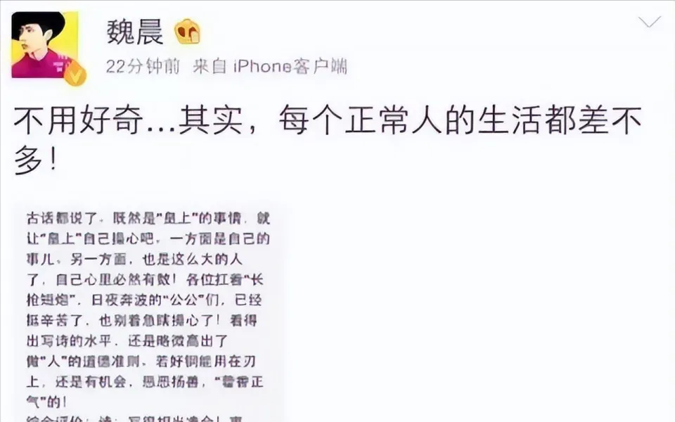 春晚第一热的《上春山》已经发酵好几天了,诸多网友将焦点关注到“男主角”白敬亭是否真的耍心机上,以致还开创了“春山学”,令吃瓜群众应接不暇。 在令人眼花缭乱的爆料中,事故的另一个主角魏晨却由于好听的嗓音,再度被观众热议。 网友纷纷喊话:“魏晨开口脆,能不能再单独录一版《上春山》?” 也有不少粉丝立刻出来力挺,并直言: “那但是当年“快男”季军,是歌手身世,也是我费钱投过票的男子……” 确实,假如将时间退回至17年前,19岁的魏晨简直是出道即顶峰——他不但是“快男”季军,还随即得到天娱力捧,演艺古迹一片光明。 但很快,在古迹最顶峰之际,魏晨因一张照片险些遭遇封杀,导致古迹高开低走。 而多年后已往,幸亏他从没放弃,而是不停低调积极,并渐渐将口碑彻底翻转,现在又因《上春山》这个节目,再度翻红。 1.出道即顶峰的“快男”除了这一次的《上春山》,魏晨迩来的热度着实并不低。 他刚刚因参演影戏《三大队》中的徐一舟一角,被网友力赞:演技进步。 同时,魏晨之前在《铁道好汉》《志愿军》等作品中扮演的“硬汉”形象也深入民气——毫无疑问,从歌手出道的他,已经乐成转型为一个合格的演员了。 而这统统,他用了近乎十年时间,期间也历经高峰低谷、险象环生。 魏晨于1986年出生于甘肃兰州的一个工人家庭,但母亲由于天生有一副好嗓子,年轻时曾在文工团工作过,还出演过《红灯记》中的小铁梅。 受她的影响,魏晨小时间也对文艺情有独钟,且很有悟性和天赋。 读初中时,妈妈曾给他买过一把吉他,他很快就学得像模像样了,因此也成为了班里的文艺骨干。 到了高中,魏晨的学习效果不算特殊抱负,于是在高二时便自动和父母提出想要走艺术生蹊径,去学音乐。 这个发起很快得到了父母的支持,他们还拿出积贮给儿子买了一架钢琴,又请了西北师大的老师来教他音乐知识。 2003年,17岁的魏晨到场了兰州市美声大赛,并取得了第一名的好效果。 同年底,他又到四川音乐学院举行强化学习。 次年,魏晨到场高考前,又被妈妈带去中心音乐学院强攻“西洋发声”。 那之后,他顺遂过关,进入“川音”盛行歌舞系学习。 而学校里很快就走出了李宇春、何洁等惊动天下的“超女”师姐,也让魏晨摩拳擦掌。 究竟上,在到场“快男”比赛前,他也先后得到CCTV青歌赛河南省二等奖、亚洲音乐影戏节亚洲新人奖等比力有重量级的奖杯。 2006年,魏晨信心满满地到场了“我型我秀”的比赛,却并没有同届的王啸坤、俞思远、戚薇等人的好运气,第一轮便被镌汰出局了。 次年,他不甘心,又开始打击“快男”比赛,但有了之前的失败履历,魏晨这次只抱着能进水平赛区50强的心态。 没想到,他却在比赛中异军突起,效果始终压倒统统。 不外估计许多观众都忘了,当年的魏晨的成名路也并没有想象中那么顺遂,由于比赛期间他曾因严峻跑调遭遇质疑。 尚有一次,去线下拉票时,他由于被安排到了张杰的故乡成都,而并非自己的故乡兰州,导致不少粉丝不能明白,还痛骂他“忘本”! 不但云云,比赛期间,魏晨还先后遭遇“果照袒露”“豪情师生恋”“涉嫌整容”等抹黑造谣,导致陷入巨大的压力之中。 但终极,他却由于“07快男”天下季军的好效果顺遂出道,随即便推出首支单曲《少年游》。 至今,不少歌迷仍记得这首歌。 魏晨从前走的蹊径就是阳光开朗大男孩,但其时鲜少有人知道,他在大学期间就和同砚于玮建立了爱情关系。 2.争议不停的“伪只身”于玮是山东姑娘,却性格温柔,两人由于对音乐的寻求走到一起。 女方还曾是国内首只少女偶像团体“爱朵女孩”组合的成员之一,代号“清香苹果”。 但这个组合尚未有什么水花,很快就糊了。 厥后尚有粉丝扒出,其时“快男”比赛期间,于玮也在现场。 以致他得到季军的高光时间,她也一起见证,还冒充粉丝跑上台送了一束花。 坊间听说,经纪公司其时对于他的这段恋情极为不满,以致还要求两人分手过,但魏晨在和于玮分手一段时间后,又复合了。 而那之后,他也曾为了节目效果,过了很长“伪只身”的日子: 好比魏晨对粉丝许下答应,假如自己是只身,就会在演唱会上唱一首《一个人睡》。 而这首歌一唱,就是快要10年。 此歌是2008年魏晨推出的个人首张EP《乐天派》中的一首,而这张专辑上市后,10天的销量便破了12万张,也革新了2008年唱片的销量记录。 不外也是这一年,由于赶上了汶川地动,天下人民都在为灾区牵肠挂肚,他却由于晒出了自己的一张照片引起网友的愤怒。 只管事变发酵后,魏晨立刻出头致歉,但路因缘一度跌入谷底。 幸亏这时芒果台伸出援手,让他进入《一起来看流星雨》剧组,扮演H4成员叶烁一角。 这部作品日后只管出现南北极分化的反响,但不能否认的是实打实的爆款,收视率稳居第一。 魏晨的古迹也渐渐开始回弹,又接连推出新专辑,还录制了不少综艺节目。 不外本来以为,他的演艺古迹会逐步回到极点,却不意又一件不测事故发生了。 2013年,刚留学归国的魏晨被网友指出多个造型撞衫权志龙。 大概是重压之下,他亲身发文狂怼网友,以致还爆了粗口,和以往给人的阳光印象大相径庭。 此言一出,两边粉丝撕得头破血流。 也正是因此,魏晨的古迹又陷入了焦灼阶段,只管仍在前台且作品不少,但仿佛就是离“大红大紫”差一口吻。 也是这一年,已经在魏晨死后“岑寂隐蔽”了6