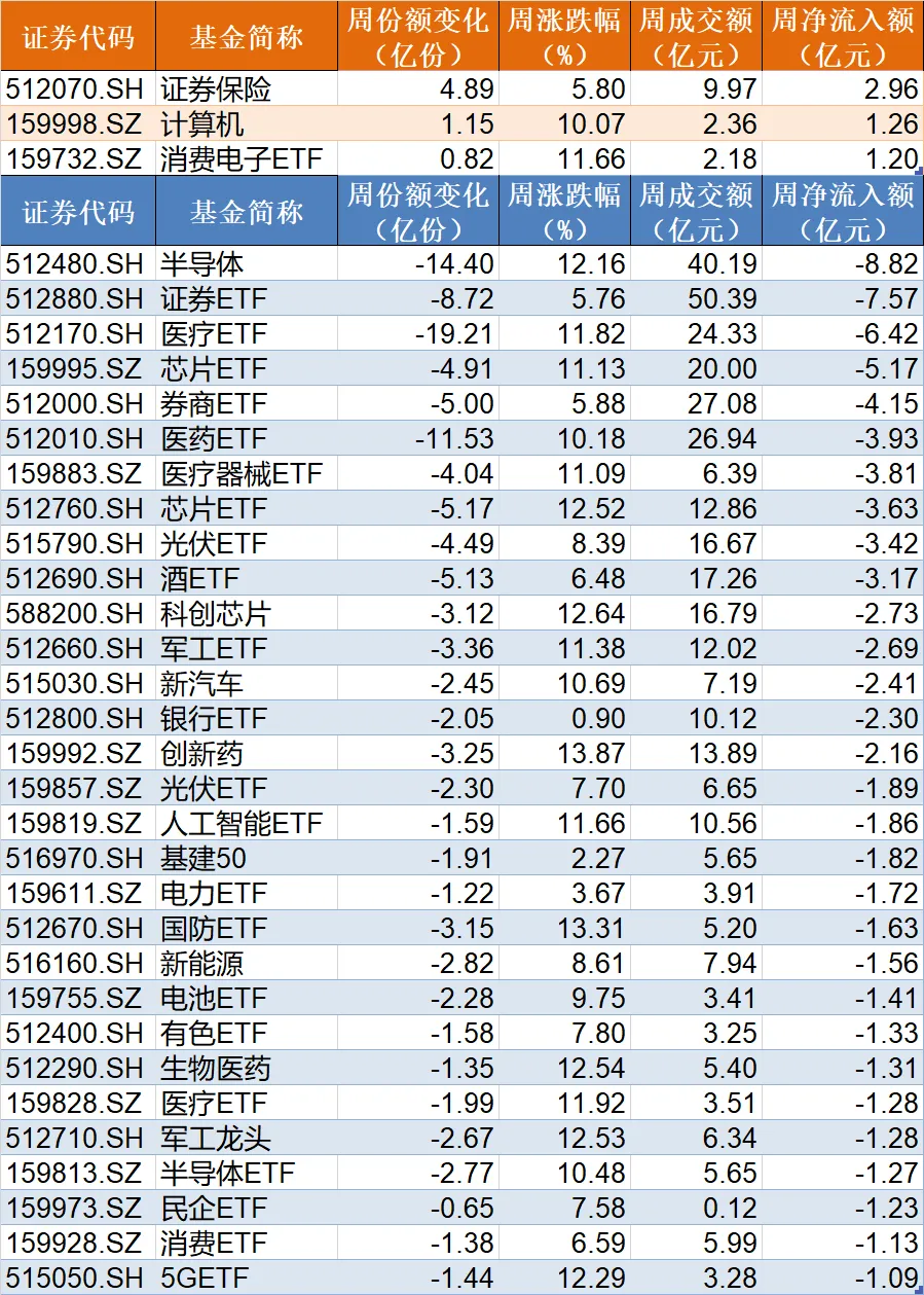 每经记者:叶峰每经编辑:彭水萍 节前股指团体走强,场外资金积极进场。沪深两市股票型ETF和跨境型ETF节前一周合计份额增长约500亿份,合计净流入约1511亿元。 行业主题上看,证券保险、盘算机干系ETF被资金看好,而半导体、医疗干系ETF被资金抛售。 ETF节前一周份额增长约500亿份,净流入约1511亿元 节前一周沪深两市成交3.85万亿元,此中沪市成交1.85万亿元,深市成交2万亿元。克制最新收盘,沪指报收于2865.9点,全周上涨4.97%,深证成指报收于8820.6点,全周上涨9.49%。 节前一周重要指数干系ETF表现 节前市场重要股指团体上涨,5只重要指数ETF中,科创50ETF、中证500ETF、创业板ETF涨超11%。 资金动向上,节前资金借ETF进场抄底迹象显着,创业板ETF、中证500ETF、沪深300ETF和上证50ETF,份额分别增长了72.84亿份、54.09亿份、40.91亿份和21.99亿份;而科创50ETF则镌汰了39.11亿份。 上述5只指数ETF节前一周合计净流入551.8亿元,此中沪深300ETF净流入260亿元。 总体而言,节前股指团体走强,场外资金积极进场。沪深两市股票型ETF和跨境型ETF节前一周合计份额增长约500亿份,合计净流入约1511亿元。 值得留意的是,沪深300ETF份额突破529亿份创新高,规模达1779.61亿元。 对于近期的市场,有券商表现,近期稳固资源市场政策的会合发力,有用改善了年初以来市场的运动性风险,短期指数具备肯定的修复预期,春节前后A股市场有望进入安稳反弹窗口。别的,在履历了1月份充实调解之后中证500、中证1000等中小发展估值处于汗青低位,性价比凸显。 半导体ETF节前一周净流出逾8亿元 在行业主题ETF方面,节前一周份额增长高出1亿份的基金有3只,此中证券保险ETF、盘算机ETF和消耗电子ETF份额分别增长了4.89亿份、1.15亿份和0.82亿份,分别净流入资金2.96亿元、1.26亿元和1.2亿元。 在资金流出方面,节前一周有30只行业主题ETF份额镌汰高出了1亿份,半导体ETF、证券ETF和医疗ETF基金份额分别镌汰了14.4亿份、8.72亿份和19.21亿份,分别净流出资金8.82亿元、7.57亿元和6.42亿元。 值得留意的是,半导体ETF节前一周大涨逾12%,但部分资金却在落袋离场,基金份额降至301.75亿份。 有券商表现,如今半导体行业处于下行周期底部地区,卑鄙需求出现结构分化趋势,消耗类需求在渐渐复苏中,新能源汽车需求相对较好,如今半导体行业估值低于近十年中位值。 13只ETF周成交额破百亿 ETF节前一周活泼度有所提升,有13只ETF周成交额突破百亿元。 从单个ETF来看,南边中证500ETF、华泰柏瑞沪深300ETF周成交额突破300亿元。 别的,在成交额排名前13的宽基ETF中,有4只ETF跟踪沪深300指数,来自华泰柏瑞、嘉实基金、易方达和中原基金。 从市场表现看,中证500ETF大涨13.2%,创业板ETF、科创50ETF等涨超11%。 别的值得留意的是,科创50ETF虽在节前创汗青新低后出现大幅反弹,但基金份额仍降落了39.11亿份。 10只中证A50ETF节后会合发行 基金重仓股向来是投资者关注的热门,但是自动管理型基金的重仓股浮出水面,通常都有肯定的滞后性,而ETF结构的标的却黑白常明白的,通过跟踪新上市ETF,通常可以发现近期热门个股,新上市ETF带来的增量资金也值得关注。 如今暂无ETF披露下周上市。 发行方面,如今有13只ETF披露节后一周发行,此中有10只ETF跟踪中证A50指数。 有机构表现,中证A50指数基于中国经济发展的新阶段,引入可一连发展的新理念,从行业均衡的新视角举行体例,有望成为A股宽基指数的新代表。随着中国经济转型升级的不绝深化,中证A50指数将有助于投资者发掘中国经济新的增长点,成为境表里资金设置A股核心资产的又一紧张标的。 逐日经济消息 |