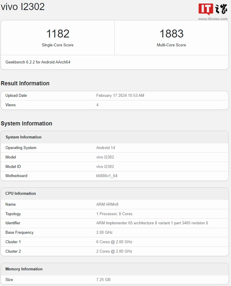 IT之家 2 月 18 日消息,日前有一款型号为 I2302 的 vivo 手机现身跑分平台 Geekbench,预计为 iQOO Z9 手机。 在 Geekbench 6.2.2 版本中,这款测试机型取得了单核 1182 分,多核 1883 分的结果,搭载安卓 14 体系,CPU 由 2 个 2.80 GHz 核心和 6 个 2.00 GHz 核心构成,内存为 8GB,预计搭载天玑 7200 处置惩罚器。 必要注意的是,此前博主@数码闲聊站 爆料称 iQOO Z9 搭载 SM7550 处置惩罚器(骁龙 7 Gen 3),显然与本次跑分机型的处置惩罚器有收支,也大概是同一型号的差别版本。 综合多方爆料来看,iQOO Z9手机暂定三月发布,配备 6000mAh 大电池、双摄模组,配备 1.5K OLED 体现屏。 ▲IT之家图赏:iQOO Z8 作为参考,iQOO Z8搭载了联发科天玑8200芯片、LPDDR5内存、UFS 3.1闪存,厚8.75mm,重201.5g,提供月瓷白、星野青、曜夜黑3种配色。 屏幕方面,这款手机采取了6.64英寸2388×1080分辨率120Hz革新率LCD打孔直屏,拥有240Hz游戏触控采样率,亮度范例值达480nit,峰值亮度达500nit,引发亮度650nit,通过HDR10认证,支持全局DC调光。 其他方面,该机内置5000mAh电池,支持1460次深度充放电循环,支持120W快充,10分钟充电50%,支持30W融合快充协媾和65W PD快充。 |