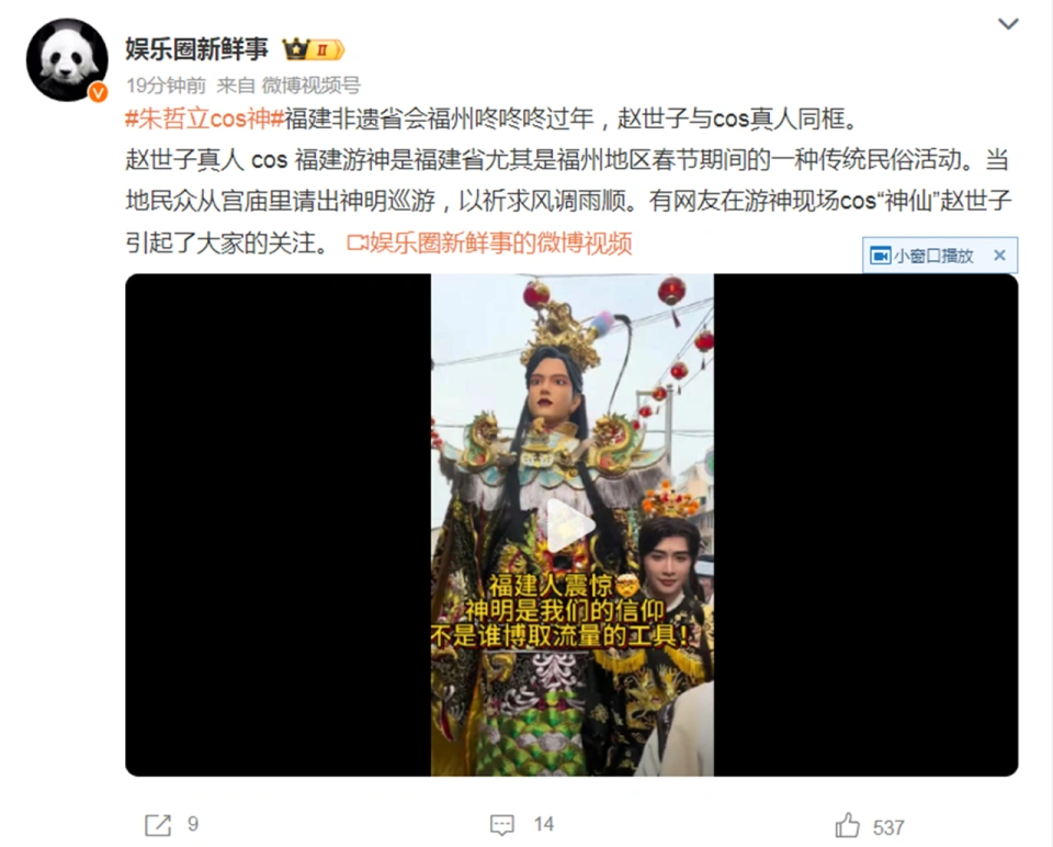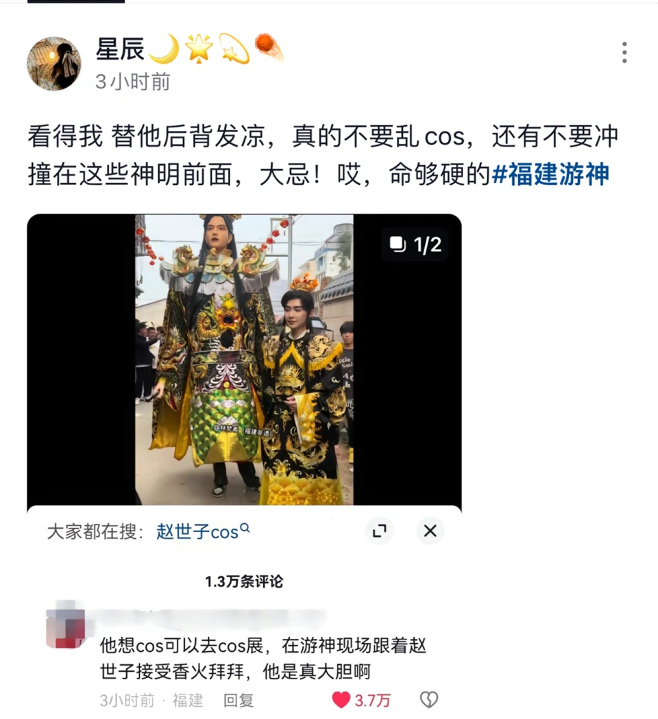 哈喽,各人好,我是木子。 在这段时间里信赖不少网友应该也都看过了不少明星网红纷纷举行cos,比如说古力娜扎cos的王者光彩貂蝉、赵露思cos的好汉同盟格温等等,不外在这些明星网红的cosplay内里有好有坏,迩来又有一位明星cos被骂惨了,尤其是福建人看了之后更是暴怒,那么究竟是怎么一回事呢?接下来就跟着木子一起来看看吧。 朱哲立cos神被骂惨了这次被骂惨了的显着是一个叫作朱哲立的人,这位明星是一位演员,不外人气和作品并不算多,紧张是以拍摄短剧为主。朱哲立之以是被骂惨了的缘故原由也很简单,并不是由于朱哲立cos不敷还原,而是朱哲立cos的脚色选错了,而且包罗场合和活动全都错了,由于朱哲立cos的脚色并不是动漫大概脚色,而是一位神明。 朱哲立cos的这位人物叫作赵世子,如果是福建人的话应该不会对这个人感到陌生,由于这是在福建本地非常著名的一位神明,而且逢年过节都会有着各种各样的游神活动。这次朱哲立cos的就是赵世子这位神明,而且朱哲立cos的所在也不是在漫展这些地方,而是在本地的游神活动上面,乃至还专门为此发布了视频。 在这次朱哲立cos神的事故被曝光之后,不少网友纷纷吐槽咒骂朱哲立,缘故原由也很简单,那就是朱哲立cos神的活动非常不符合。为什么这么说呢?紧张就是由于朱哲立cos的人物并非是动漫大概游戏脚色,而是神明,而且出现的所在也不是在漫展,而是在游神活动的现场,这在不少网友看来简直就是犯了大忌。 固然说如许的想法大概会有些封建迷信的性子,但是这却也是本地大众的一种信奉,朱哲立的活动毫无疑问就是对本地文化的一种藐视,以是自然是被骂惨了。在木子个人看来朱哲立cos的场合也不太对,显着在本地非常器重这种游神活动,结果却被朱哲立当成烈?人秀场,如果是去漫展等场合大概没太大的标题。 福建人暴怒:你这人怎么敢的啊!在这次朱哲立cos神的事故传到了网上之后,不少网友纷纷吐槽朱哲立的活动,此中尤其是福建人更是暴怒无比,乃至另有不少福建人直接怒骂朱哲立的这种活动。在不少福建人看来游神活动是一种不容玷污不容粉碎的活动,但是朱哲立却是cos赵世子,而且还走在前面继续香火跪拜,如许的活动毫无疑问被骂惨了。 于是朱哲立cos神的事故也是灵敏被骂上了热搜,不少的福建人纷纷责怪朱哲立的这种活动,乃至就连一些外地人都感觉到了严肃的冒犯。在木子个人看来朱哲立的这种活动显着是一种错误的活动,这不但对于福建人是一种严肃的伤害,而且更是一种无知且大胆的活动,这是一种不恭敬本地文化的错误活动。 我是木子,一个喜欢动漫的二次元宅,关注木子相识更多动漫资讯。【文/木子】 |