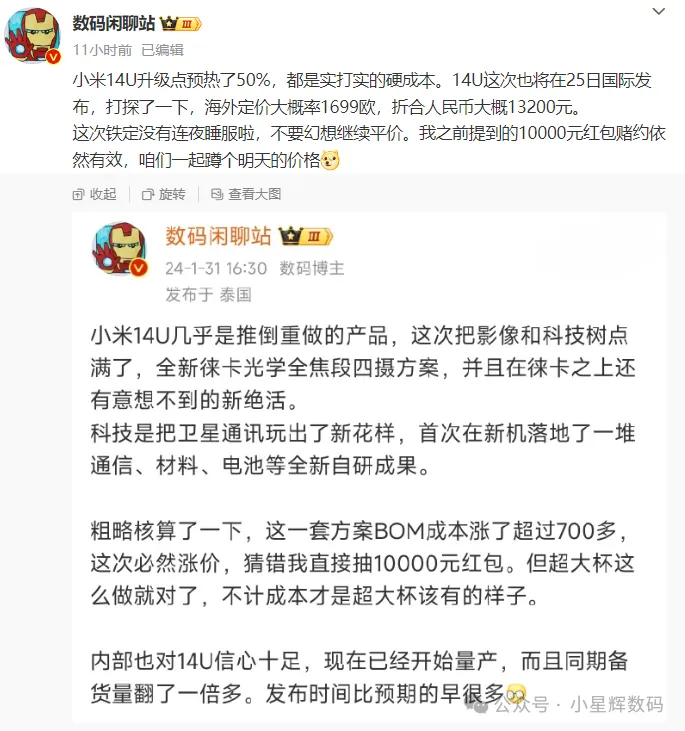各人还记得“安卓之光”这个词吗,在小米11 Ultra发布的时间,小米曾经用“安卓之光”这个词来形容它,寓意比“安卓机皇”还要强横。固然有几分浮夸的怀疑,但也足以证明,小米死磕高端机的刻意。如今的小米在高端机市场也算站稳了脚跟,客岁上市的小米14和14 Pro都得到了不错的销量,如今正在给小米14 Ultra预热,正式官宣了该机支持双向卫星通讯的功能。 这也是继华为、光彩之后,小米旗下的首款支持卫星通讯的手机,如今,小米官方也公布了14 Ultra和Mate 60 Pro的卫星通讯本事对比视频。从这个视频我们发现,小米在卫星通讯范畴,也是下了狠功。 此中,探求卫星信号方面,小米14 Ultra耗时2秒,Mate 60 Pro则续航5秒,对比之下,小米快了3秒钟。 卫星毗连速率方面,小米14 Ultra耗时25秒,Mate 60 Pro则耗时35秒,对比之下,小米14 Ultra也快了10秒。 接通速率方面,小米14 ultra花了20秒,Mate 60 Pro则花了23S,相比之下,小米也快了3秒。 而且,从小米官方公布的数据来看,小米14 Ultra可以实现双向语音功能,支持短信,在没有网络的环境下,也不会断联。相比隔壁友商的竞品,寻星速率提升了60%,卫星毗连速率提升了29%,在发送位置信息的同时,还可以携带可穿着装备装备的生命体征数据。这么优质的功能,为一样平常应急,确实提供了不少资助。 卫星通讯功能的参加,确实会给小米14 Ultra添色不少。作为小米2024年的全新力作,它的定位天然要比14 Pro更高,影像体系也会是这款手机的重点,如今根本确定,它会搭载全新的索尼LYT900主摄,拥有1英寸大底,而且还会有三颗索尼IMX858镜头作为辅助,实现3.2倍、5倍光学变焦功能,120倍数码变焦,带来全新的徕卡算法。 而且,从数码闲聊站曝光的资料我们知道,小米14 Ultra的BOM资本涨了700多,本次小米14 Ultra很有大概会涨价。由于按照上代机型的设置战略,小米14 Pro身上的2K屏幕,IP68防水,高功率有线充电和无线充电,以及小米全新的金沙江电池,都会让这款手机的设置变得更加顶。这么一来,小米14 Ultra又将成为全新的“安卓之光”,各人对这款手机等待吗? |