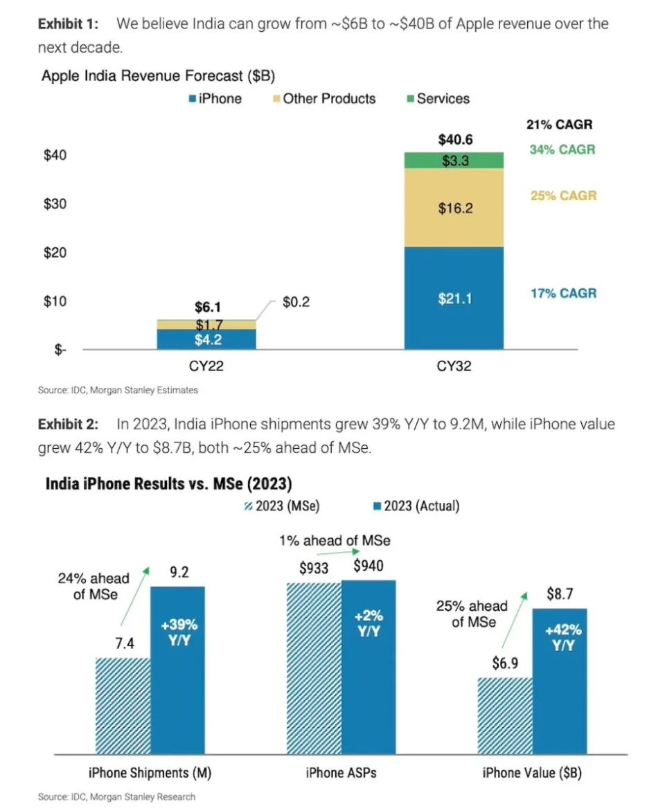 IT之家 2 月 23 日消息,苹果公司对印度市场的长期投资开始取得回报。据摩根士丹利周五发布的一份陈诉,苹果公司在印度的收入在 2023 年同比增长 42%,到达 87 亿美元(IT之家备注:当前约 626.4 亿元人民币)。 陈诉指出,2023 年印度 iPhone 出货量同比增长 39%,到达 920 万台,使其成为苹果公司第五大智能手机市场。摩根士丹利增补说,印度的 iPhone 业务如今已经高出了任何一个单一的欧友邦家。 分析师写道:“这意味着在 2023 年,印度占 iPhone 出货量和收入的 4%,高于 2022 年的 3% 和 5 年前的 1%。相比之下,中国 iPhone 出货量占 2023 年 iPhone 出货量和收入的 20%(分别同比降落 1-2 个百分点)。如果印度继续保持同样的增长轨迹,而中国 iPhone 出货量持平,那么到 2027 年,印度将成为比中国更大的 iPhone 市场。” 推动印度 iPhone 增长的紧张因素是消耗者对具有更大存储容量的高端装备的需求增长,而非最新款机型。摩根士丹利体现,客岁在印度售出的 iPhone 匀称存储容量约为 260GB,比 2022 年增长了 26%。印度 iPhone 的匀称售价 (ASP) 在 2023 年同比增长 2%,到达 940 美元。 摩根士丹利援引研究公司 IDC 的数据称,在印度出货量排名前五的 iPhone 机型是 iPhone 13、iPhone 14、iPhone 14 Plus、iPhone 14 Pro 和 iPhone 15,它们占总销量的 86%。印度 iPhone 的匀称售价为 940 美元,比环球匀称售价 1045 美元低约 10%。 苹果将印度视为未来的紧张增长引擎,客岁在该国初次开设了两家零售店。该公司还在将 iPhone 制造业徐徐转移到这个南亚国家。摩根士丹利估计,到 2032 年,苹果公司在印度的收入将到达 400 亿美元。 |