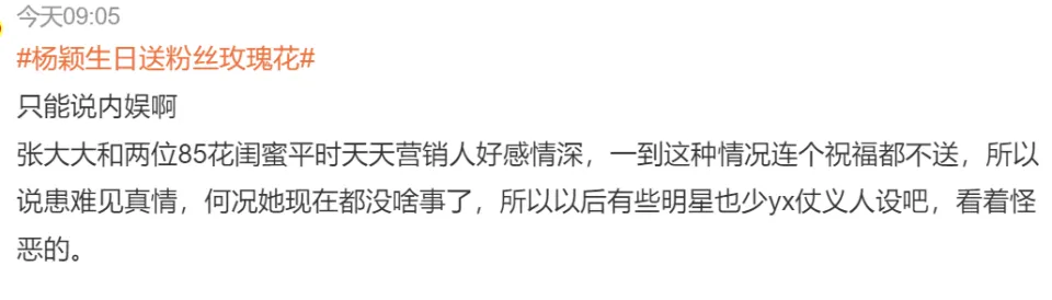 自“疯马秀”事故之后,杨颖迎来了一次高调的时间,那就是她的35岁生日,由于交际帐号已经全面解封,这次她的35岁生日颇为器重。 痛惜的是“热闹”的外貌却袒露了她现在在内娱的“人走茶凉”。 这次杨颖的工作室了和她本身都在交际平台发了生日文案。 在杨颖的生日动态的品评区里,从人气上来看依然风光,转发高达100万,点赞超66万,品评也有7.8万,但品评区里险些都是杨颖的粉丝。 看得出来,杨颖的粉丝对偶像还黑白常支持的,不外本年杨颖的生日,至今还未看到有圈内明星为她奉上祝福。 杨颖曾是红极一时的内娱“85花”顶流,往年她的生日曾风光无穷,不提别人,她在圈内公认的“85花”好姐妹就有杨幂和倪妮,再加一个张大大。 往年杨颖和杨幂都会相互奉上生日祝福,乃至杨颖此中一年为杨幂庆生的时间,不吝把合照中的倪妮裁掉了。 哪怕到了客岁,在“疯马秀”事故之前,杨幂和杨颖好像已经“感情生变”,两人在对方生日时并没有发动态祝福,但还是会在品评区为对方庆生。 客岁杨颖生日的时间,倪妮和张大大也都发文为她庆生了。 但本年,不管是杨幂,倪妮还是张大大,都“消散”在了杨颖的交际圈子中,令人感慨,明星之间友好的脆弱。 要知道,杨颖和杨幂在“疯马秀”之前算是娱乐圈著名的“好闺蜜”,两人在各种公开场合上都是形影相随,不但座位坐在一起,背景上更是会一起合照。 不外别提杨幂了,杨颖现在在内娱的职位和影响力也确实大不如前了。比如前年的微博之夜上,杨颖还和杨幂,刘诗诗等人坐在一起。 而到了客岁的微博之夜,杨颖已经“消散”了。 固然杨颖还顶着“85花”的头衔,但她现在在内娱的资源和其他85花可以说是天差地别,但也有网传说,杨颖这次“解封”之后,大概会上《浪姐4》和新一季的《跑男》。 但能否依附作品再次回归“85花”顶流的位置,就要看杨颖的力气了,究竟其着实“疯马秀”之前,杨颖的资源已经降级不少,不但在《跑男》和其他综艺上沦为“配景板”。 相助的男星也从原来的梁朝伟,钟汉良变成了宋威龙,马天宇等二三线男星,而现在在杨颖的待播作品中,有和宋威龙相助的《相思令》。 娱乐圈的“新旧更替”非常快,曾经自大说出本身值8000万片酬的杨颖,现在也不得不继承“人走茶凉”的现实了。 但即便云云,杨颖在娱乐圈的10余年里,已经赚到了平凡人一辈子都难以到达的财产。有媒体发出的两张明星收入排行榜可以看到。 杨颖在2017年的时间身家累积已经高出14亿元,在2017年之后,她又在短短4年期间赚到了12亿元的,加起来她的身家已经近27亿元了。 之前杨颖被拍到外出的时间,曾拿过两个百万级的名牌包,一个代价200万,一个代价100万。 她在上海和儿子所住的豪宅据传代价4个亿。 云云看来,即便娱乐圈对杨颖再“无情”,杨颖未来的生存在物质上至少已经比很多平凡人富足很多了。 |