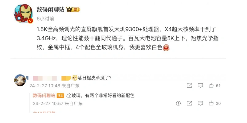 近期关于蓝厂将发布多款新机的消息越来越多,此中除了已经曝光将于本月在外洋发布的iQOO Z9系列之外,另有听说已久的vivo X Fold3、vivo X100 Ultra以及克日曝光率颇高的直屏版vivo X100s。日前,有数码博主更是曝出了疑似vivo X100s新机或将首发联发科天玑9300+处理处罚器、拥有两种悦目的新配色的消息。 日前,数码博主 @数码闲聊站 爆料称,“1.5K全高频调光的直屏旗舰首发天玑9300+处理处罚器,X4超大核频率干到了3.4GHz,理论性能叒干翻同代通子。百瓦大电池容量5K上下,短焦光学指纹,金属中框,4个配色全玻璃机身,本身最喜好白色。”而且在这条微博下,其与网友互动时还体现,该机四种配色全系玻璃材质,而且此中“有两个非常悦目的新配色”。联合近期网间的曝光来看,这些参数很大概来自vivo X100s新机。 根据此前爆料的信息来看,vivo X100s好像并非真正意义上的直屏,而很大概采取的是分辨率为1.5K的2.5D微曲面屏,并支持8T LTPO技能和120Hz革新率,不光拥有更风雅的视觉观感,还能更掩护用户双眼康健。别的,该机或将内置5400mAh大电池,续航有不小的提拔,固然快充从120W降到了80W,不外在一样寻常利用中,并不会有啥续航和充电压力。 上图为 vivo X100 Pro和X100 影像方面,据称vivo X100s也将采取5000万像素索尼IMX920主摄+5000万像素超广角+6400万像素潜望长焦后置三摄组合,可以说覆盖了现在一样寻常利用的全焦段。别的,此前有爆料称vivo X100S的代价将会带来肯定程度的惊喜,由此推测,其订价估计要比vivo X100低一些了。不外现在关于该机的消息还都停顿在爆料阶段,终极设置和表面信息还要以官宣为准。感爱好的小同伴不妨连续关注我们的后续报道。 |