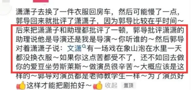 3月3日,网上流出一段郭敬明导演谴责演员程潇的视频,固然听不清楚郭敬明在讲什么,但是从身段语言不丢脸出,郭导非常气愤,谴责之余还不绝指手画脚。 当天,郭敬明穿着白色背心,戴着蓝色鸭舌帽,面色如灰,眼神狠狠地盯着程潇,嘴里不绝不绝地说着话。 程潇则穿着戏服背对镜头,对于郭敬明的谴责不敢吭声。 看到爱豆被郭敬明云云谴责,不少粉丝体现非常心疼,称看到小四咄咄逼人的样子,真想一巴掌甩已往,一个女孩子,怎么受得了在稠人广众之下被人云云羞耻。 实在,郭敬明导演是出了名的爱训人,此前录制综艺《演员请就位》的时间,就曾在片场骂孟子义网红脸,私自改装,还谴责孟子义偶像包袱太重。 拍《画皮》的时间,郭敬明不但骂了何昶希,也骂了丁程鑫,其时何昶希不绝喊“太难了”,郭敬明绝不留情面地教导他:“一个哭戏怎么叫难,你一个演员说出这种话也不怕别人笑话”? 以是这次在片场骂程潇,网友体现并不不测。 一位程潇的粉丝还原了事变的颠末,称当天程潇拍打戏的时间头套松了,她整理了一下,加上易服服统共花了20分钟时间,大概确实影响到拍摄进度。 以是郭敬明有点气愤,在片场痛骂程潇和助理:“做演员很辛劳的,如果这点苦都吃不了,还不如回家做你的爱豆,坐你的劳斯莱斯”。 对于外界说程潇故意偷懒这种说法,该粉丝体现绝对不存在,她陪程潇在大梦剧组无数个破晓,在敬业这一点上,非常信赖程潇。 据悉,程潇如今拍摄的是电视剧《大梦归离》,此剧由郭敬明执导,侯明昊、陈都灵、程潇等人领衔主演。 程潇饰演的裴思婧是女射手的人设,因此有许多的打戏,固然是女二,但是粉丝却非常看好,并信誓旦旦地体现,这部剧末了爆的很大概是程潇。 剧还没播,就由于被导演郭敬明谴责一事冲上热搜,对于郭敬明的严苛,网友品评南北极分化,有人以为头套松了固然要整理,也有人说剧组是个大工程,延误一分钟,整个团队都会晚收工,而且园地和东西都必要租金。 更有网友扒出,程潇不敬业已经不是第一次,此前录制综艺的时间,就多次在录制现场玩手机,乃至在台上睡觉。 不但云云,程潇还被爆性情很差,经常当众对助理甩表情,明显是本身的标题,却甩锅给工作职员。 2021年河南水患的时间,程潇由于捐钱金额太少被推上风口浪尖,程潇先是在本身的小号内在“真是笑吐了”! 之后又在大号怼网友:“捐也说,不捐也说,捐少了也说,捐多了也说,捐钱不是攀比,每个人尽本身一份心,关注在变乱本身欠好吗”? 网友发现,程潇一个包就代价十几万,捐钱却只有10万,以是这件事让网友吐槽好久。 郭敬明的严格是出了名的,不管程潇有没有做错,末了也想给这些爱豆一个告诫:想要在娱乐圈恒久地走下去,敬业是第一,还得时间注意本身的言行举止。 |