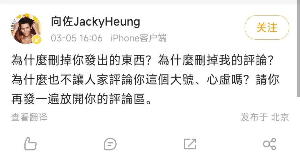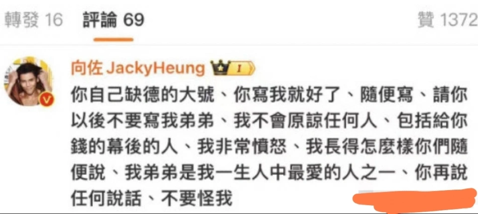 3月5日,娱乐圈再起风波,着名富二代、男演员向佐有数在网上公开爆粗口! 丝毫掉臂及本身明星的身份,了局痛骂网友缺德! 据悉,变乱的因由,是向佐的妈妈向太陈岚在网上分享了本身的最新造型。 向太一改昔日利落短发的边幅,居然接起了长发,以披肩金色假发的边幅表态,着实惊艳了不少网友。 很多人看到向太的长发造型后,都猛然想到了向太年轻的时间。 纷纷夸赞向太的长发造型有种当年的感觉。 以致有媒体剪辑出了一段视频。 说向太长发的边幅,有些和本身的儿媳妇,也就是郭碧婷像。 打开网友的视频,简直,从某些角度上看,向太的长发造型,简直很像郭碧婷。 两个人都是大玉人,气质和脸型五官本就差不多,再加上滤镜的关系,这对婆媳真的很有缘分。 但不知道怎么回事,有些网友却总爱“找事”,喜欢发一些阴阳怪气的话。 这不,有网友说了,难怪向太那么痛爱郭碧婷,原来郭碧婷真的很像向太年轻的时间。 只看这段笔墨,着实没题目,只是网友说向太和郭碧婷长得像的变乱。 但反面的几句话,就彻底有些太过了。 网友说,本身不绝搞不懂,为什么向佐的爸爸很帅,妈妈也很漂亮,可偏方向佐长得那么丢脸,另有向佐的弟弟向佑也不怎么样。 你听听这话,“杀人诛心”啊,所谓打人不打脸,骂人别揭短。 作为娱乐圈著名的公子哥,向佐不愁吃不愁穿,款项方面早就日进斗金,资源方面也有家里的财产,尤物方面更有郭碧婷,但唯独是长相方面,不怎么尽如人意。 早在向佐和郭碧婷刚爱情的时间,就有很多网友吐槽向佐的长相太“霸道”,有段时间,郭碧婷和向佐在一起的时间,媒体都说是“玉人与野兽”。 以是向佐的长相,可以说是向佐的“痛点”。 这次网友夸赞郭碧婷和向太也就算了,却非要“夸一踩一”,说向佐的长相。 假如网友只是说向佐也就算了,偏偏还带上了“向佑”,这下算是彻底把向佐给弄急眼了。 以是你看,向佐直接在网友的账号下留言,说网友是缺了大德了,想骂的话,骂本身就好了,恣意骂。 但千万不要骂本身的弟弟,假如谁伤害本身的弟弟,本身不会包容任何人,包罗这位网友幕后的人,由于弟弟是本身一生中最爱的人,要是网友再多说一句,就不要怪本身不客气! 看得出,向佐这话说得非常严肃了,不光点名了网友缺德,更是指出本身不会放过网友和幕后的人,假如网友再说本身弟弟的浮名,向佐不会部下包容。 这位网友大概也是被吓坏了,急遽把这条内容给删除了。 但向佐的性情已经上来,完全不控制本身的感情,在本身的账号上再次“表态”,让这个网友别心虚,别删除本身的批评,本身就想让各人评评理,让各人看看到底是怎么回事。 话说,我们娱乐圈里已经多久没看到一个明星这么破防骂街了。 在我看来,这个网友,大概说这个粉丝不少的大V,真的是本身找骂,该死被挂出来。 原来向太这个话题,就是让各人夸赞的,这个网友弄的视频上了热搜,好好夸就行了,干嘛非要挤兑人家儿子,而且还是一连挤兑了两个。 向佐是明星,有客气继承各品行评和发起的任务,以是平常网友骂他丑就骂了,可他弟弟是素人啊,一个娱乐圈大V,公开骂一个素人,还上了热门,这换成谁都要急。 替这哥们祷告吧,向太一家人可都不是好性情的,从前间向家也算是有头有脸的。 这大V假如是个人号就算了,要是机构号,估计要倒霉了,幕后的老板,表情要多丢脸就多丢脸。 |