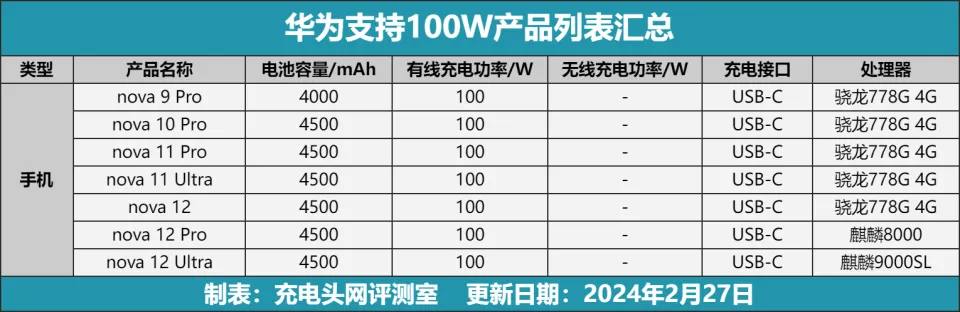 前言在移动通讯和智能装备范畴,快速充电技能的进步已经成为斲丧者最关注的焦点之一。华为作为环球领先的通讯装备和智能装备制造商,不绝处于快充技能的前沿。华为的超等快充技能,不但大大收缩了手机寂静板电脑的充电时间,而且还提拔了用户体验,引领了行业的发展趋势。 现在,华为的超等快充的功率从22.5W到100W不等。停止到现在华为已经推出了7款支持100W超等快充的手机,分别是nova 9 Pro、nova 10 Pro、nova 11 Pro、nova 11 Ultra、nova 12、nova 12 Pro、nova 12 Ultra。 华为支持100W产物电池容量统计(2024年2月27日) 从图表可以看出,现在华为支持100W超等快充的手机其电池容量重要为4500mAh,共计6款产物,别的也有一款产物的电池容量为4000mAh。 下面就简朴先容一下华为这七款支持100W超等快充手机,按照发布时间排序。 产物先容华为nova 9 Pro华为nova 9 Pro于2021年9月23日发布,官网售价3499元起。 华为nova 9 Pro接纳6.72英寸OLED环幕屏,支持120Hz革新率,反面接纳星耀工艺,后摄模组的主摄被象征着 nova 星的圆环所围绕。提供9号色、绮境森林、普罗旺斯、亮玄色四种配色,重量约为186克。搭载高通骁龙778G处置惩罚器,后置5000万像素主摄+800万像素超广角镜头+200万像素景深镜头+200万像素微距镜头,前置3200万像素+3200万像素双摄。搭载HarmonyOS 2操纵体系,支持屏幕指纹辨认、面部辨认等功能。 电池和充电方面,华为nova 9 Pro标配4000mAh电池,支持100W华为超等快充。 华为nova 10 Pro华为nova 10 Pro于2022年7月4日发布,官网售价3699元起。 华为nova 10 Pro接纳6.78英寸OLED环幕屏,支持120Hz革新率,300Hz触控采样率。提供10号色、绮境森林、普罗旺斯、曜金黑四种配色,重量为191g。搭载高通骁龙778G处置惩罚器,后置5000万像素超感知摄像头+800万像素超广角微距摄像头+200万人像虚化景深摄像头,前置6000万像素超广角追焦摄像头+800万像素人像特写摄像头。搭载HarmonyOS 2.0操纵体系。 电池和充电方面,华为nova 10 Pro标配4500mAh电池,支持100W华为超等快充Turbo。 华为nova 11 Pro2023年4月17日华为发布了华为nova 11 Pro,官网售价2999元起。 华为nova 11 Pro搭载6.78英寸FHD+的OLED环幕屏,120Hz高革新率,支持HDR10和1440Hz高频PWM调光。配有11号色(素皮)、耀金黑(素皮)、雪域白、晨曦金4种颜色,重量为188g或193g。搭载骁龙778G 4G处置惩罚器,拥有6000万像素前置摄像头和5000万像素后置主摄,支持前置0.7x-5x全焦段变焦、人像虚化、超广角自拍等多种拍摄模式,搭载鸿蒙操纵体系。 电池和充电方面,华为nova 11 Pro标配4500mAh电池,支持最高100W。 华为nova 11 Ultra2023年4月17日华为发布了华为nova 11 Ultra,官网售价3999元起。 华为nova 11 Ultra搭载6.78英寸120Hz全新臻彩环幕屏,支持HDR10和1440Hz高频PWM调光。配有11号色(素皮)、耀金黑(素皮)、雪域白、晨曦金4种颜色,重量为188g或193g。搭载骁龙778G 4G处置惩罚器,拥有6000万像素前置摄像头,支持前置0.7x-5x全焦段变焦、人像虚化、超广角自拍等多种拍摄模式;5000万像素后置主摄,搭载十档可变光圈。搭载HarmonyOS 3,支持隐私安全掩护、鸿蒙智慧相机等功能。 电池和充电方面,华为nova 11 Ultra标配4500mAh电池,支持100W超等快充Turbo2.0。 华为nova 122023年12月26日华为发布了华为nova 12,官网售价2999元起。 华为nova 12搭载6.7英寸FHD+的OLED直面屏,120Hz高革新率,高频PWM调光。配有12号色、曜金黑和樱语白三种颜色,重量为191g。搭载麒麟8000处置惩罚器,后置5000万超感知影像体系,搭载鸿蒙操纵体系4.0。 电池和充电方面,华为nova 12标配4600mAh电池,支持100W超等快充Turbo2.0。 华为nova 12 Pro华为nova 12 Pro于2023年12月26日发布,官网售价3999元起。 华为nova 12 Pro接纳6.76英寸1.5K的OLED四微曲屏,支持120Hz LTPO动态自顺应革新率,2160Hz高频PWM调光。提供12号色、樱语粉、樱语白、耀金黑三种配色,重量为201g。搭载麒麟8000处置惩罚器,后置5000万物理可变光圈主摄,支持十档光圈调治,辅以800万超广角微距镜头,前置6000万+800万人像双摄,支持前置变焦。搭载鸿蒙操纵体系4.0。 电池和充电方面,华为nova 12 Pro标配4600mAh电池,支持100W超等快充Turbo2.0。 华为nova 12 Ultra华为nova 12 Ultra于2023年12月26日发布,官网售价4699元起。 华为nova 12 Ultra接纳6.76英寸1.5K的OLED四微曲屏,支持120Hz LTPO动态自顺应革新率,2160Hz高频PWM调光,300Hz动态触控,AI HDR图片高动态体现。提供12号色、烟云灰、曜金黑三种配色,重量为198g。搭载麒麟9000SL处置惩罚器,后置5000万物理可变光圈主摄,支持十档光圈调治,辅以800万超广角微距镜头,前置6000万+800万人像双摄,支持前置变焦。搭载鸿蒙操纵体系 4.0,支持双向北斗卫星消息,隔白手势,智感付出等功能。 电池和充电方面,华为nova 12 Ultra标配4600mAh电池,支持100W超等快充Turbo2.0。 充电头网总结随着技能的不停进步和发展,将来的智能手机将会越来越依靠快充技能。而华为作为国内领先的智能手机制造商,其在快充技能方面的研发和应用也将不停取得新的希望。华为的100W快充技能也是华为在快充范畴的一项告急突破,也是智能手机的一项告急技能指标。 除了以上的100W超等快充技能,现在华为的旗舰手机上重要搭载了88W快充技能和66W快充技能,信赖在不久的将来,百瓦快充也会渐渐遍及到自家的Mate和P系列以致是其他的平板装备。 相干阅读: 1、华为迈入百瓦快充期间,首款100W充电器评测奇怪出炉 2、非常钟快速相识自成一派的华为Nova系列产物 |