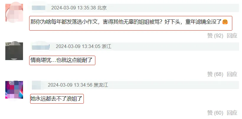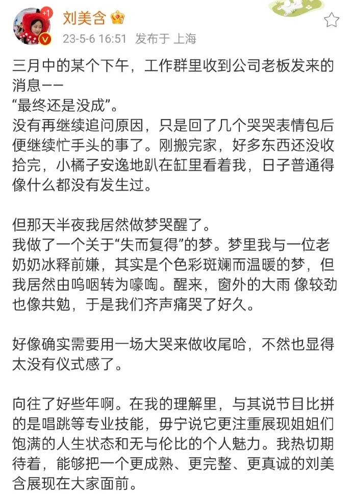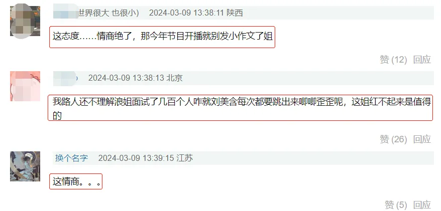 文 | 烤娱 随着初舞台完成录制,《浪姐5》的脚步越来越近,一年一度的内娱大龄女星综艺大赏也将如约而至! 作为芒果的一张综艺王牌,《浪姐》节目的影响力不问可知。自从节目阵容曝光后,交际媒体热搜榜就有姐姐轮番登场,节目也刷足了存在感。 对于30+的女艺人来说,《浪姐》节目确实吸引力非常大。可以或许拿到一张节目“入场券”,也就意味着离翻红又近了一步。 何洁、黄英、万妮达、蔡卓宜等姐姐纷纷自荐参加《浪姐5》,曹璐发了长视频回应落第《浪姐5》,可见节目的竞争非常剧烈,想要得到时机,没点真本事是千万不可的。 《浪姐5》36人的台甫单曝光后,很多人第一时间想到了她——刘美含。 这位姐姐和《浪姐》有着千丝万缕的接洽,她曾两次落第《浪姐》节目,发表“小作文”而火出圈,网友在替她痛惜的同时,也痛骂节目组选人有标题,一些姐姐也跟着遭殃。 《浪姐4》节目播出后,刘美含在交际媒体发表长文回应自己再次落第,她体现:“想要不丢人。积极图取不丢人。积极图取了结还是没有得到预想的结果,更不丢人。” 刘美含的这一篇“小作文”诚意满满、情真意切,也让她出圈了一把。 对于她的这一活动,网友们的评价驳倒不一,有人以为追梦的女孩值得鼓励,芒果该给刘美含一个时机。也有人以为刘美含有卖惨蹭热度的怀疑,使用舆论对节目组举行“道德绑架”,这反而会让自己失去时机。 刘美含发这一篇“小作文”的动机我们不做评价,但“小作文”自己确实让她有了热度,很多网友也记取了她,每季候目开播也会时常念叨刘美含的名字。 刘美含是通过《快乐女声》节目走红的,算是芒果自家人。她的长相甜蜜,又做过女团,夺目多门语言,综艺感也不错,还是出圈脚色“严莉莉”加持,完全符合《浪姐》节目的选人尺度。 刘美含上《浪姐》,可以说是一场双赢的相助,为什么芒果就不给她时机呢?直到看到刘美含的一番使用,小编才明确芒果的决定有多明智。 《浪姐5》名单公布后,很多人又开始替刘美含痛惜了,并质疑芒果选人的尺度有标题,连周扬青、范湉湉都有时机,为什么刘美含就不可? 网友都在等刘美含的落第“小作文”,没想到她提前脱手了,她在自己的广场和粉丝互动,让人逼真地感受到了什么是“情商堪忧”。 有粉丝体现,《别对我心动》内里,刘美含演技不错,很天然,多演演戏。听说去《浪姐5》了,加油加油。 这位粉丝又在品评区增补道:好像又没选上。刘美含直接复兴这位粉丝:嘻嘻,谢谢你喜好,不是没选上,是不去。 之前求着上节目,现在又不稀罕了,为什么刘美含态度会大变化呢?有网友指出,大概是《浪姐5》的阵容看了以为没意思,也有人直言刘美含要进组拍戏,时间上有辩论,权衡之下放弃了《浪姐5》。 不管出于什么缘故原由,刘美含在交际媒体上云云复兴网友确实不敷明智。而且这个复兴给人的感觉就是在内在《浪姐5》节目组:昨日你对我爱理不理,本日我让你高攀不起,话里话外都有倒油的怀疑。 果不其然,刘美含的这一番言论引发争议,很多网友以为她情商太低,举动很下头,对她的童年滤镜全都没了。 之前还心疼她的网友,这下子都开始心疼节目组了。节目组确实挺无辜的,每季都要被刘美含的“小作文”带起舆论,末了还要被踩一脚。 刘美含这一波使用,不但把《浪姐》的路堵死了,大概连芒果的资源也堵死了。32岁的刘美含,已经在娱乐圈摸爬滚打18年了,还能有云云迷幻的发言,也难怪不绝都红不起来。 究竟上,刘美含的低情商也不但体现在《浪姐》这件事上,此前她就由于在交际媒体怒怼粉丝而上热搜。 有粉丝发起刘美含多发自拍,没想到刘美含直接发起粉丝取关自己。粉丝直言刘美含发的照片是库存,刘美含也在品评区发起了性情,粉丝终究是错付了。 刘美含在2009年《快乐女声》进入天下15强,如许的结果说不上多耀眼。签约天娱传媒后,刘美含的古迹发展也并不顺遂。天娱其时规定全部签约艺人都不可以走,2023年出了个新政策,以艺人的收入为尺度,如果一年没到达12万的话,就可以自动解约。 刘美含在采访中也体现,自己到达了这个尺度,以是厥后就离开了。离开后她开始在电视剧范畴发力,拍了不少的作品,但始终没有什么代表作。 刘美含曾和张若昀、孙怡、张雪迎等携手主演的都市芳华偶像剧《十五年等候候鸟》,其他主演都飞黄腾达了,唯独她还是小透明。 刘美含固然没有乐成登上《浪姐》节目,但她实打实由于《浪姐》得到了红利。不管她由于什么缘故原由缺席《浪姐5》,但这一次的发言确实不敷理智。刘美含这么一闹,估计支持她的人都要反悔了。 对于刘美含,你们有什么要说的吗? |