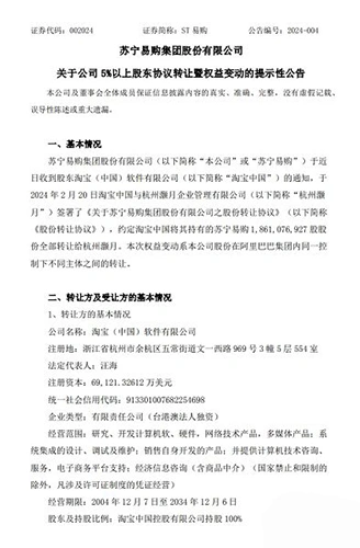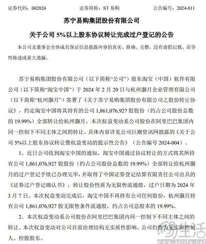 日前苏宁易购团体股份有限公司(以下简称为苏宁易购)方面发布公告,称淘宝(中国)软件有限公司(以下简称为淘宝)将其所持有公司18.61亿股股份(约占公司股份总数的19.99%)全部转让给杭州灏月企业管理有限公司(以下简称为杭州灏月)的过户登记手续已办理完毕,并取得中国证券登记结算有限责任公司出具的《证券过户登记确认书》,转让股份性子为无穷售流畅股,过户日期为2024年3月7日。 据公开资料表现,杭州灏月建立于2023年10月,法定代表人为胡晓,注册资源42.64亿美元,由淘宝持股57.5947%、浙江天猫技能有限公司持股35.7470%、Alibaba.com China Limited持股6.6583%,是阿里巴巴(中国)网络技能有限公司的划一办法人公司。自2023年12月以来,阿里方面已连续将所持的上市公司股份转让给杭州灏月,而这一计谋则是根据阿里巴巴团体设立六大业务团体,团结调解后构造主体相干性做出的调解。在此次权益变更前,杭州灏月并未持有苏宁易购股份。 苏宁易购方面在相干公告中也透露,此次权益变更系公司股份在阿里巴巴团体内同一控制下差别主体之间的转让,对于该公司如今的管理布局无实质性影响,公司仍为无实际控制人、控股股东。 此前,苏宁易购方面还公开了与阿里巴巴团体2024年度一样平常关联生意业务预计的公告。此中表现,苏宁易购预计2024年与阿里关联生意业务或将高出14亿元,此中包罗佣金、推广服务费、物流仓配服务等多个方面。同时,在上一年度苏宁易购与阿里一样平常关联生意业务预计为20.1亿元,未经审计实际发生金额约为12.98亿元。对此苏宁易购方面表现,关联生意业务实际发生总金额与预计总金额存在肯定差异,属于正常的策划举动,对公司一样平常策划及业绩影响较小。 不久前苏宁易购上线以旧换新百亿补贴专场,提供最高30%直降的大额补贴,而且线上线下均可加入。对此苏宁易购相干负责人表现,百亿补贴专场的目的是让斲丧者方便快捷“一键获取”以旧换新优惠,用户通过苏宁易购App百亿补贴页面,即可选购加入以旧换新运动的商品,“斲丧者在线上下单,可以直接享受百亿补贴一口价,并在提交接纳单后,领取额外的以旧换新补贴,只需付出差价即可期待上门送新收旧”。 对于到店选购的用户,则可在页面提交接纳单后领取百亿补贴券,到门店即可享受补贴直降。据官方相干人士透露,“以旧换新百亿补贴将为用户提供最高30%的直降优惠,斲丧者到店还可叠加套购优惠、付出立减,以及各地绿色斲丧券等运动,多重补贴下,得手价将更加实惠”。 据相识,苏宁易购方面还提出了“三不三免”的六大服务答应,此中各人电、数码3C可跨品类以旧换新,只要评估的旧机范例与实物划一,岂论品牌和利用年限均可享受一口价补贴。同时,送新收旧免上门费,除特别场景外,家电拆卸、搬运上楼均不额外收费。 【本文图片来自网络】 |