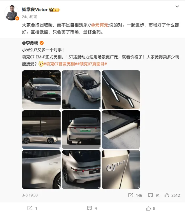 克日领克 07 EM-P 发布,有博主直呼“小米 SU7 又多一个对手”,但祥瑞控股团体高级副总裁杨学良在转发该博主的微博时发文号令,“以后各人只管不要把我们的新车跟小米 SU7 关联起来,更不要对立起来,要乐见别人乐成。” 昨天,杨学良再一次发文谈到上述话题:“各人要抱团取暖和,而不是自相残杀。”有博主品评体现,“一起进步,市场好了什么都好。相互诋毁,只会害了市场,终极全死。”(泉源:IT之家)