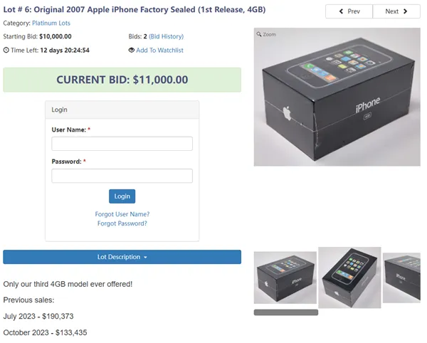 快科技3月12日消息,2007年,苹果第一代iPhone问世,该机在环球范围内引发科技革命,现在更成为收藏家的珍品。 日前,一台未拆封的初代iPhone上线拍卖平台LCG Auctions,起拍价为10000美元,拍卖将一连两周。 这台初代iPhone为稀有的4GB版本,将寻衅客岁7月另一台4GB版拍出的19万美元记录。 据悉,2007年苹果发布初代iPhone时推出了4GB和8GB两个版本,但由于8GB版本大受接待,4GB版本无人问津,后者便很快停产,这也导致其非常有数。 LCG Auctions首创人Mark Montero曾表现,4GB版本的初代iPhone比8GB版本有数20倍不止。 初代iPhone不但改变了苹果的运气,也改变了整个手机行业的格局。 乔布斯在Macworld大会上公布这款手机时,将其称之为“革命性的”,彼时,乔布斯说:“本日,苹果将重新发明手机。” |