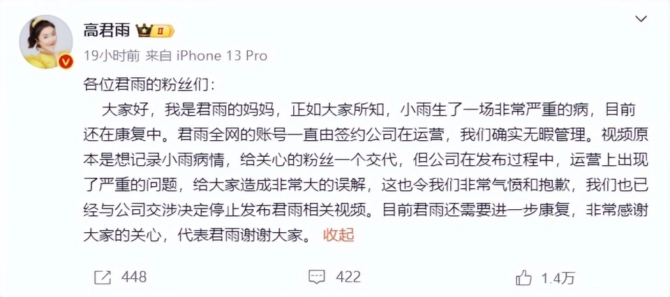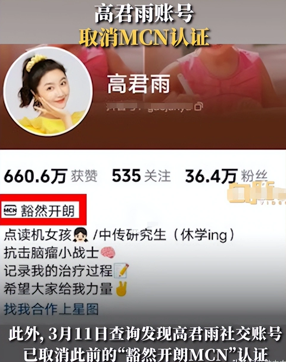 3月11日,“点读机女孩”高君雨视频造假一事连续发酵。 高君雨是一位童星,依附某点读机广告中的那句“那里不会点那里,so easy”一举成名,被网友密切地称为“点读机女孩”。 高君雨的发展过程没有令父母和喜欢她的观众扫兴。 从小学习效果精良,高考时以超出分数线一百多分的效果,顺遂考入中国传媒大学。之后通过本身的积极得到了保送研究生的名额,本硕连读共七年。 按照高君雨的发展轨迹,未来的目标很明确,就是像马凡舒、龙洋、冯琳等校友一样,成为一名精良的主持人,一位精彩的消息工作者。 大概连她本身也没有想到,这次公开分享抱病履历竟会让她本来光明的远景蒙上一层阴影。 十几天前,沉寂数月的高君雨,交际账号突然规复了更新,她对外透露本身患上了有数脑瘤,即将举行手术治疗。 视频中高君雨对着镜头剃掉了长发,直言无论效果怎样,都会把整个过程纪录下来。 高君雨的刚强和大胆感动了无数的网友,从她视频发布的那一刻起,网友们的心也跟着告急了起来。 这段时间,高君雨的账号不停在频仍更新,从推进手术室治疗,得手术乐成,确认肿瘤为良性,再到转入平常病房后状态欠好,重新住进ICU。 每一条视频内容都牵动着网友们的心,一边为她祈福,一边急着想知道高君雨病情的希望。 然而,令人没有想到的是,这些被冠以“本日”“如今”等举行时字眼的视频,却被扒出是库存视频。 先是有网友发现高君雨的视频中,医院通道内的患者和眷属都穿着短袖、短裙,北京天坛医院外的树木郁郁葱葱,和如今的季候不符。 别的,高君雨明显在北京住院治疗,视频的发布地点却是在浙江。 尚有仔细的网友发现,高君雨的短视频已经签约了mcn机构。 之后,不绝有知恋人出头证明,高君雨是客岁九月份住院手术,10月份已经全愈出院。 网友们同心协力为她祈福加油,有些粉丝以致由于担心她的病情彻夜难眠,如今却被告知视频为库存造假。 网络舆情不绝发酵后,高君雨的短视频账号开始不绝删除对本身倒霉的评价,眼看局面无法控制,末了直接关掉了批评功能。 3月11日晚,高君雨的母亲通过女儿的微博公开发声回应。 文中提到了高君雨确实生了一场非常严峻的病,现在正在全愈中。同时还透露,高君雨全网的账号不停都是由签约公司在运营。 发布视频本来是想纪录小雨的病情,给关心她的粉丝一个交代,效果在发布过程中,运营上出现了严峻的标题,给各人造成非常大的误解,这也令高君雨和家人非常气愤和歉仄。 事发后,高君雨的家人已经和视频运营公司会商,决定克制发布高君雨的干系视频。 有些事变虽没有明言,但字里行间的意思各人都懂,这段时间所发布的就是库存视频。 高君雨的母亲甩锅给MCN公司的做法显然不敷以平息公众的愤怒,视频造假的背后,其母亲难辞其咎。 高君雨的母亲在回应文案中提到“无暇管理账号”,但发布的病情希望视频根本都是她操刀拍摄的。 既然MCN机构运营上出现了标题,为什么不及时克制,而是揣着明确装糊涂,使用公众的怜悯心,心安理得享受着巨大的流量与曝光度。 而且,在本年的3月2日晚,高君雨全愈出院半年后还继承了别人一万元的捐款。 高君雨是传媒大学保送的研究生,日后是要从事消息专业的,假如消息人以如许的态度从业,显然是不合格的。 以高君雨的专业本领来看,本来可以有非常光明的前程,然而,她和家人照旧太心急了。 高考竣过后,高君雨使用童年时积攒的着名度,开始像一个知心姐姐一样,分享本身的学习心得。 进入大学后,高君雨把短视频当作本身的练习平台,常常出一些关注度比力高的选题,让粉丝和网友来查验她的学习效果。 客岁四月份,高君雨通过交际平台透露,本身的身段出现了状态,体重下滑严峻,满身提不起精力,整个人看上去特别疲惫。 可纵然连起床、洗浴都无比困难,她照旧不忘做视频、打广告。 小时间,高君雨在妈妈的要求下拍广告赢利,长大后使用儿时的名气接广告。 抱病以后,妈妈拍摄视频纪录,然后将素材提供给MCN机构运营账号。 总结下来就两个字——心急。 高君雨22岁,妈妈已经开始在为她结业以后做计划了,想着可以或许和其他童星一样,顺遂完成过渡,成为一名公众人物。 效果到头来却是竹篮打水一场空,还赌上了女儿的大好前程。 |