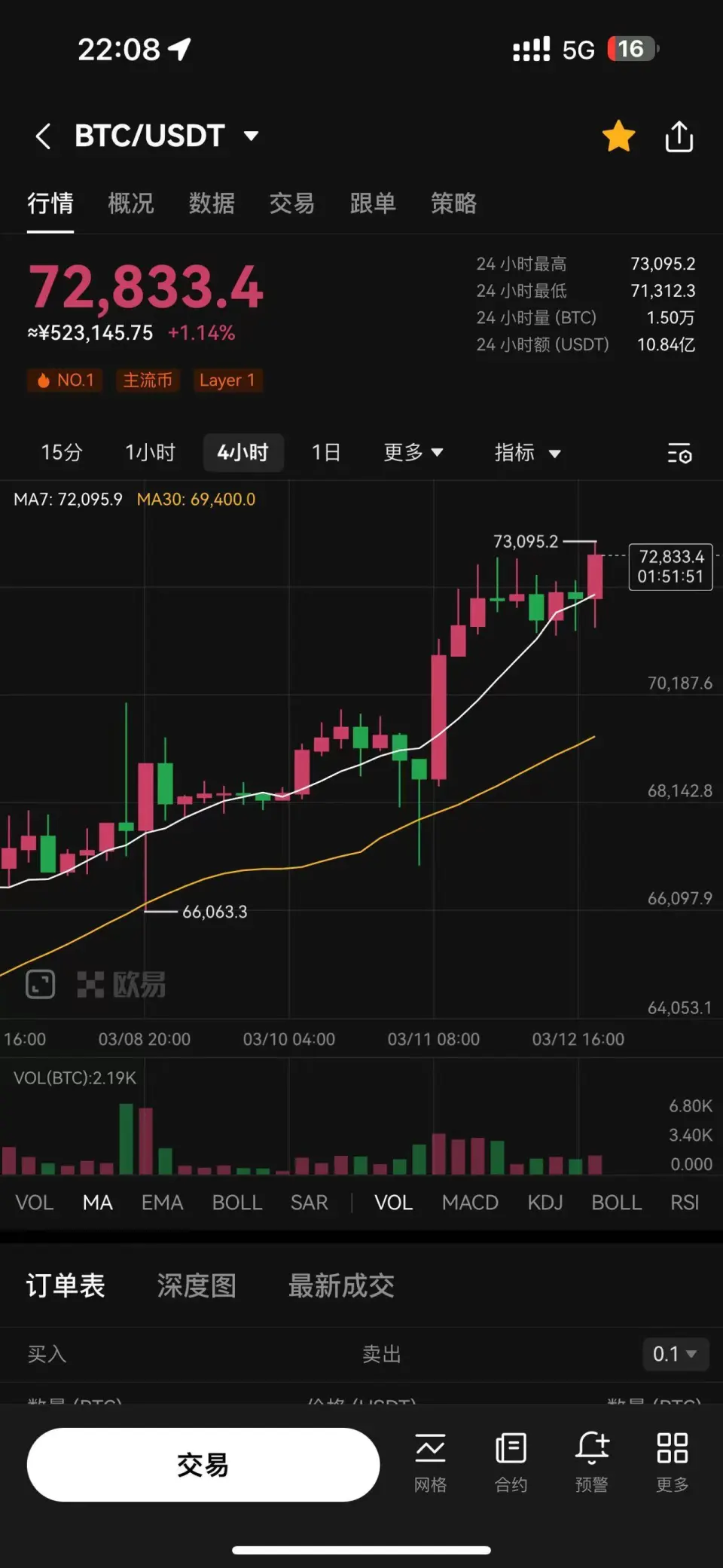 鞭牛士 3月12日消息,比特币突破73000美元/枚。 |
