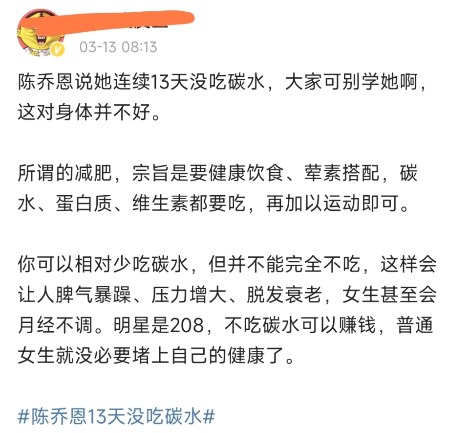 俗话说得好,开口神情散,意动火工寒。 明星没啥事就少语言吧。 3月13日,女明星陈乔恩又上热搜了,记得前次她出如今热搜上,是由于口无遮拦,说了什么女人为难女人的事变。 而这次上热搜,同样是嘴上没把门地,说了自己减肥的时间13天不吃碳水的事。 事变的因由,是陈乔恩把自己的交际账号当成了朋侪圈。 在上面发布自己减肥的事变。 此中有一句提到了自己一连13天没吃碳水减肥的办法。 所谓说者无心,听者故意,人红好坏多。 陈乔恩大概也没想到,自己就这么随口一说,就直接让这个话题冲上了热搜。 网友的争议的地方重要会合在几点: 1、每个人体质不一样,我们要为自己身材负责,不能胡瞎搅。 2、不吃碳水完满是错误的,平常人千万别学明星。 3、明星不应该轻易说一些误导大众的话。 这里必须说一下,大概很多人只听说过“碳水”这个词,但不明确详细是什么。 碳水的全称, 就是碳水化合物。 生物讲义上说过,碳水化合物是人体获取能量的重要泉源,重要是通过吃谷类、豆类和水果等等。 也就是说,我们平常吃的米饭、面条、馒头、土豆、红薯等等,都是高碳水的东西。 很熟悉对吧,险些都是我们中国人平常吃的东西。 这时间有人会问了,既然碳水这么平常和告急,陈乔恩怎么大概不吃碳水,照旧一连13天不吃,这不是要性命嘛! 确实,在正凡人看来,不让吃米面,完全就是自己找事,这也是为什么陈乔恩说这话的时间,能引发这么大争议。 由于很多人头脑里都有一个问号,不让吃碳水,那吃什么啊,明星有专门的营养药剂,平常人怎么办。 你还别说,我专门搜了一下,不吃碳水能不能活,答案很不测,能活,也能减肥! 这里就不得不提到别的一个汽车大V陈震。 同样是老陈家的人,陈震这年老比陈乔恩更狠,陈乔恩是13天不吃碳水了,而陈震已经是一年没吃碳水了。 用陈震自己的话说,自己这是“生酮饮食”,不吃碳水以后身材没标题,各种状态精良,除了最开始戒断时间有些感情暴躁以外,背面就风俗了。 在陈震2022年的这段视频里,他也详细表明确自己怎么做到的。 没我们想象中的那么玄乎,更不消什么专门的营养药剂,由于不吃碳水以后,能吃的东西有很多。 好比各种肉类,什么牛排啊,肘子啊,肉串啊等等。 断碳水只是不吃主食和高糖水果了,其他脂肪和卵白质照旧能吃的。 而且蔬菜里也有一些碳水,但不影响什么,做到0碳水不大概。 品评区里,也有很多网友说自己也不吃碳水了,对峙低碳一段时间后,皮肤变好了,整个人状态也不错。 以是你看,陈乔恩说自己13天不吃碳水,不算什么离谱的利用,各人不要一听说不吃主食就下意识以为明星在坑人。 平常人也能偶尔实行一下断碳,没那么可怕。 固然,末了也奉劝一下陈乔恩了。 所谓入乡随俗,既然想在当地发展,就要学会“闭嘴”。 明星的账号,除了发布广告和宣传以外,最好一点互动都不要发,哪怕发,也让工作职员利用。 什么都往表面发,往小里说是浪费公共资源,胡乱上热搜,往大里说,很大概哪句话被针对,明星直接被封杀…… |
