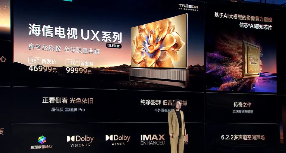 IT之家 3 月 15 日消息,海信本日发布全新 ULED X 电视,98 英寸首发价 46999 元,110 英寸首发价 99999 元,4 月 1 日开售。 IT之家获悉,这款新品具有 Mini LED 背光分区 40000+,搭载新一代 MiniLED 全阵列动态背光体系,通过超高密度布局的数万个双纳米 LED 芯片,精准调治地区背光。该产物具有 XDR Pro 10000nits 峰值亮度,液晶电视初次到达 90% BT.2020 立体色域。 该产物搭载全新升级的黑曜屏 Pro,接纳双液晶分子视角补偿布局,带来 178° 超广视角,侧看无漏光,通透不反光,观影角度不设限,更广视角、更低反射,支持 144Hz 革新率。 该产物还搭载基于 AI 大模子的信芯 AI 感知芯片,支持 AI 智能交互功能。别的,其配备共计 4.2.2 多声道 (16 个发声单元),获格菜美获奖团队连合调校。 |
