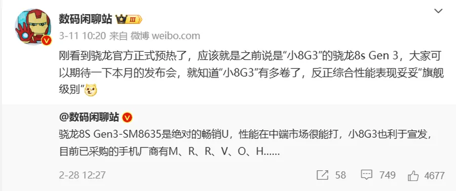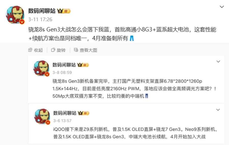 机友们都知道,高通骁龙作为移动平台的老大哥,在业内绝 对是占据半壁江山的存在!旗舰芯骁龙8 Gen3和骁龙8 Gen2向来统治着主流高端手机范畴,现在,高通要再添虎将,发布一款新王炸移动平台骁龙8S Gen3。 这颗全新的旗舰级芯片到底怎么样?哪些手机将要搭载其上线表态?本日咱们就来争先看一波: 高通官宣3月18号,将举行“智在芯中 有龙则灵”骁龙旗舰新品发布会,预计将在这场运动上发布骁龙8s Gen3。别的,预计还会有一颗骁龙7+ Gen3将在近期发布。 那么这颗芯片大抵是什么水平?下面就用个简图给各人比力下,应该会更清晰: 骁龙8 Gen3>骁龙8s Gen3>骁龙7+Gen3≥骁龙8 Gen2。 而在两款将要上市的芯片中,骁龙8s Gen3拥有更高的性能,同时也更受各人关注,下面咱们就偏重看看这颗芯片: 此前,博主@数码闲聊站 已经爆料了骁龙8s Gen3的参数规格,骁龙8S Gen3代号是SM8635,基于台积电4nm工艺打造,CPU部门包罗1*3.01GHz X4+4*2.61GHz A720+3*1.84GHz A520GPU为Adreno 735。 作为对比,咱们再看看之前的骁龙8 Gen3,其CPU包罗1*3.3GHz X4+3*3.15GHz A720+2*2.96GHz A720+2*2.27GHz A520,也是台积电4nm工艺制程。 不丢脸出,骁龙8s Gen3的CPU主频固然有所低落,少了一颗A720性能焦点,但却多了一颗A520能效焦点。它的的综合性能是在骁龙8 Gen2和骁龙8 Gen3之间,但频率的较低也大概带来更好的团体功耗控制,续航表现天然也会更好。 简朴点来说就是,骁龙8s Gen3作为一款全新的骁龙8系芯片,性能超等能打,是妥妥的旗舰级别了!而且这颗神U未发先火,固然在本月18号才发布,但是已经早早被机圈各大佬提前预定,是绝 对的脱销U。 据爆料,现在已经采购骁龙8s Gen3的手机厂商们有M、R、R、V、O、H……都是谁?各人懂的都懂: 那么,本年搭载骁龙8s Gen3的新时机有哪些呢?重头戏来了! 先来看小米,据传,小米本年依然拿到了高通的首发权,小米Civi 4将成为搭载骁龙8s Gen3的环球首发新机。 爆料称,小米Civi 4已经入网,型号为“24053PY09C”,将有两个版本,尺度版为直屏,顶配版为2.7D等深微曲屏;屏幕均为1.5K分辨率,支持徕卡影像,内置5000mAh超大电池+百瓦级快充;小米Civi 4高配版本还将支持卫星通讯。 这一代Civi在骁龙8s Gen3的加持下,性能大大增强。 同时,小米子品牌红米也将发布一款骁龙8s Gen3新机,它就是Redmi Note13 Turbo,将继续采取1.5K无塑料支架直屏+塑料中框+玻璃机身组合,新机值得等待。 别的,蓝厂也到场了中端大战,子品牌IQOO将发布一款焦点是骁龙8s Gen3,各方面都很平衡的中端机IQOO Neo9s,无塑料支架,屏幕规格为6.78"2800*1260p 1.5K+144Hz,采取50Mp大底双摄方案。 骁龙8s Gen3新机固然远不止这些,光彩、OPPO、vivo、真我等厂商也有不少新机待发。可以看出,本年中端手机的利用体验和市场格局,很大概由于高通新一代神U骁龙8s Gen3的到场,而彻底改变。 毕竟从影响手机体验的焦点CPU、GPU来看,骁龙8s Gen3的表现与骁龙8 Gen 2简直只在伯仲之间,乃至在能效控制上更加良好。在优化中端手机的利用体验方面,这颗芯片已经具备了富足潜力。 而对于我们这些机友来说,有了骁龙8s Gen3这个新选择,买手机只会以为更香了!由于对于很多机友的钱袋子来说,搭载骁龙8 Gen3的手机固然有着最 好的体验,但是代价确实会更贵些,而搭同样有着出色性能和万能体验的骁龙8s Gen3手机,代价大概只需中端价,妥妥的大福利呀。 总之,就让本年中端机的大乱斗来得更剧烈些吧,我们只要坐等骁龙8s Gen3新机发布就行了! |