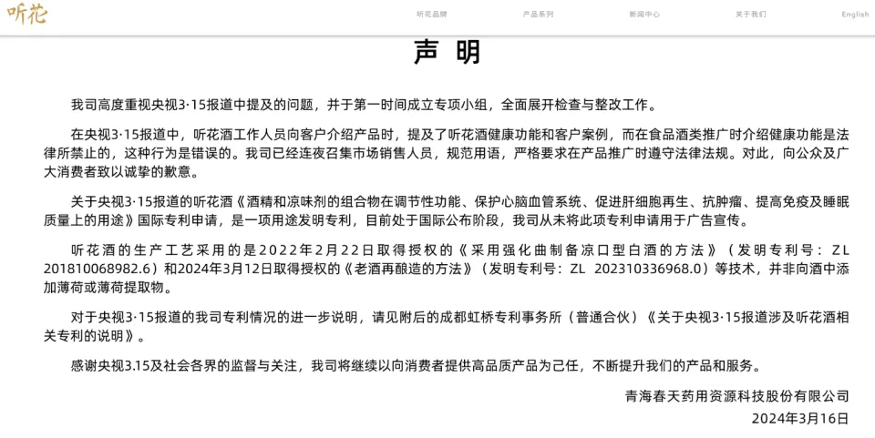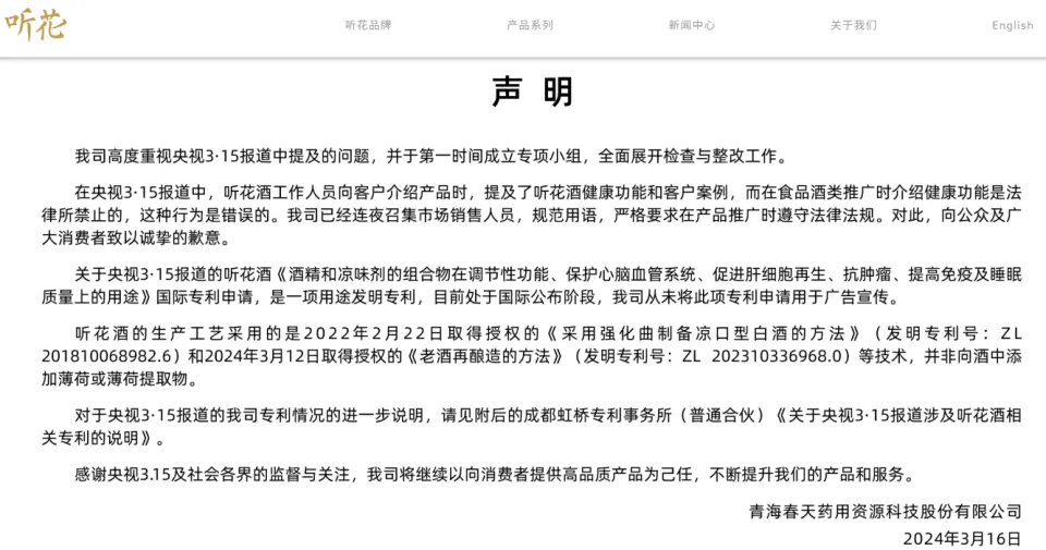 金融界3月16日消息 本日,听花酒在官网发布声明,向公众及广大消耗者致意,称已第一时间建立专项小组,全面睁开查抄与整改。不外,对于专利相干标题,听花酒则表现该“用途发明专利”处于国际公布阶段,公司从未将此项专利申请用于广告宣传,相干技能并外界报道中所提到的,向酒中添加薄荷或薄荷提取物。 对于听花酒《酒精和凉味剂的组合物在调治性功能、掩护心脑血管体系、促进肝细胞再生、抗肿瘤、进步免疫及就寝质量上的用途》国际专利申请,听花酒回应称,这是一项用途发明专利,现在处于国际公布阶段,公司从未将此项专利申请用于广告宣传。听花酒称,其生产工艺接纳的是2022年2月22日取得授权的《接纳强化曲制备凉口型白酒的方法》(发明专利号:ZL 201810068982.6)和2024年3月12日取得授权的《老酒再酿造的方法》(发明专利号:ZL 202310336968.0)等技能,并非向酒中添加薄荷或薄荷提取物。 与此同时,对于听花酒专利情况,听花酒互助专利事故所成都虹桥专利事故所(平常合资)发布了相干专利阐明。声明中表现,央视3·15报道中提及的关于凉味剂的相干技能,涉及我所署理的发明专利《接纳强化曲制备凉口型白酒的方法》(申请日期为2018年1月24日,授权公告日为2022年2月22日),该专利是《酒精和凉味剂的组合物在调治性功能、掩护心脑血管体系、促进肝细胞再生、抗肿瘤、进步免疫及就寝质量上的用途》专利申请的根本技能,也是听花酒系列技能之一,并非向酒中添加薄荷或薄荷提取物。央视3·15报道听花酒涉及功能的相干国际专利申请《酒精和凉味剂的组合物在调治性功能、掩护心脑血管体系、促进肝细胞再生、抗肿瘤、进步免疫及就寝质量上的用途》由我所署理,该专利申请已经处于国际公布阶段。 |