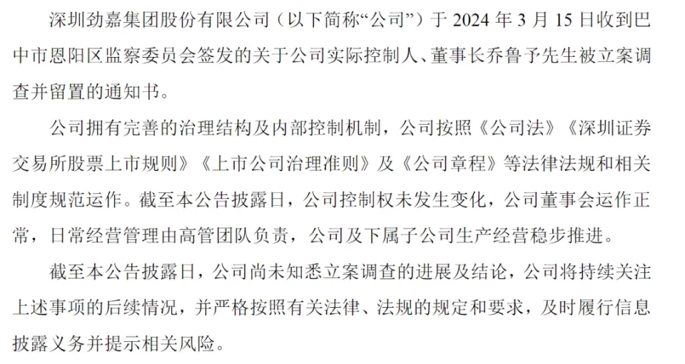 着名烟标龙头劲嘉股份(002191.SZ)实控人三年内第三次遭遇留置。 3月15日劲嘉股份晚间公告,公司当日收到巴中市恩阳区监察委员会签发的关于公司实控人、董事长乔鲁予被存案观察并留置的关照书。 资料表现,乔鲁予,1956年出生,中国籍,澳大利亚恒久居住权,高中学历,从前曾是山东菏泽卷烟厂的一名平常车间工人,上世纪90年代,乔鲁予赴深圳发展,随后开办了劲嘉股份,并一步步做大做强。其通过深圳市劲嘉创业投资有限公司控制劲嘉股份31.67%股权。2003年以来,其始终继承公司董事长一职,并在2006年至2010年兼任公司总司理。“乔鲁予在烟草及烟标印刷行业具有逾20年的从业履历和广泛的社会资源,善于于战略发展、企业管理、市场开辟。”劲嘉股份招股书曾云云先容。 乔鲁予是老牌亿万富豪,2009年,乔鲁予就已以31亿身家登上胡润百富榜,以后直到2022年,其不停在榜。此中,2015年其个人财产一度到达86亿元。 董事长近3年内3次被查并留置 外界推测大概与烟草反腐有关 劲嘉股份表现,克制该公告披露日,公司尚未知悉存案观察的盼望及结论,公司将连续关注上述事项的后续环境,并严酷按照有关法律法规的规定和要求,及时推行信息披露任务并提示相干风险。同时,公司控制权未发生变革,公司董事会运作正常,一样平常筹谋管来由高管团队负责,公司及下属子公司生产筹谋稳步推进。 值得关注的是,这已是近3年内,乔鲁予第3次被存案观察并留置。其曾在2022年4月和2023年5月,先后被上犹县监察委员会、于都县监察委员会存案观察并留置。 2022年4月15日,劲嘉股份就曾发布公告称,上犹县监察委员会对实际控制人、董事长乔鲁予举行存案观察并实行留置。消息一出,劲嘉股份连续遭遇三个跌停板。 值得注意的是,劲嘉股份总司理侯旭东早在2022年4月1日曾签收了上犹县监察委员会对乔鲁予老师举行存案观察并实行留置的关照书。但是该信息滞后了十多天才披露。滞后的缘故原由是,总司理侯旭东思量“因乔鲁予老师不到场公司具体筹谋管理,其个人判断乔鲁予老师被存案观察事项与公司无关且不影响董事长正常履职,故未向公司董事会陈诉。” 当年9月末,公司称收到上犹县监察委员会排除留置关照书,上犹县监察委员会已排除对乔鲁予的留置步调。 2023年6月1日,劲嘉股份盘前告急发布公告,官宣其董事长再次被存案观察的消息。当天,劲嘉股份股价又跌停。 劲嘉股份表现,公司于2023年5月31日收到于都县监察委员会签发的关于公司实际控制人、董事长乔鲁予被存案观察并留置的关照书。克制上述公告披露日,公司控制权未发生变革,公司董事会运作正常,公司财务及生产筹谋管理环境正常,公司管理层将增强管理,确保公司的稳固和业务正常举行。公司尚未知悉存案观察的盼望及结论,公司将连续关注上述事项的后续环境,并严酷按照有关法律、法规的规定和要求,及时推行信息披露任务并提示相干风险。 2023年7月6日,乔鲁予再次被排除留置。 这3次存案观察和留置,劲嘉股份均未披露具体存案缘由和案情。但据多家媒体及每经网此前报道,乔鲁予多次遭遇留置被外界推测或与烟草体系反腐密切相干。 被称为烟标龙头 客岁三季度净利润暴降近40% 公开信息表现,劲嘉股份公司是中国卷烟包装领军企业,被称为烟标龙头,其产物包罗卷烟包装、酒类包装、3C包装产物等,团体业务覆盖天下,与国内80%的省中烟公司恒久保持战略相助关系,约占天下烟标总量12%。 不外,劲嘉股份比年来烟标业务连续下滑,在2023年半年报中,公司就指出由于受行业竞争、招投标代价降落等影响,公司烟标订单量有所下滑,以及由于烟草企业全面推进卷烟产物改版增长二维码标识,公司需重新安排部门产物的生产筹划,业绩因此受到肯定水平的阶段性影响。 2023年三季报表现,公司主营收入29.55亿元,同比降落25.03%;归母净利润3.56亿元,同比降落39.25%;扣非净利润3.77亿元,同比降落25.4%。 为探求新的业绩增长点,劲嘉股份近期在新业务结构方面动作反复。 2023年9月,劲嘉股份发布系列公告,公布进军电子质料范畴,其先是拟出资人民币5亿元设立全资子公司深圳劲嘉新源科技团体有限公司(以下简称“劲嘉新源”),开展研发、投资、管理具有高附加值的半导体质料和功能性薄膜等范畴的电子质料相干业务。 以劲嘉新源为主体,一方面与深圳后浪实行室科技有限公司签署战略相助协议,双方围绕聚合物/金属复合质料产物用高功率磁控溅射装备开展相助。后者是一家专门从事真空薄膜技能与装备范畴研究的新型研发机构。 另一方面,拟以劲嘉新源主体,向深圳市唯亮光电科技有限公司(以下简称“唯亮科技”)增资1521.74万元,得到唯亮科技7%的股权,从而切入先辈半导体及光电器件封装质料等电子质料相干业务。 2023年11月,劲嘉股份再公布设立孙公司劲嘉聚能,负责复合铝箔的研发、生产、贩卖业务,以及将后浪实行室相助研发结果的落地、中试、小批量验证工作,到达用“一步法”生产复合铜箔的验收尺度及生产、贩卖条件。 本年1月9日,劲嘉股份在继承调研时表现,公司投资的唯亮科技,重要产物是基于环氧树脂质料的预注塑封装基板、引线框架以及先辈封装相干质料和整套产物技能办理方案,通过的认证包罗ISO9001体系认证、汽车IATF16949体系认证以及ISO14001环保体系认证等,已服务国内和国外高出50家客户;劲