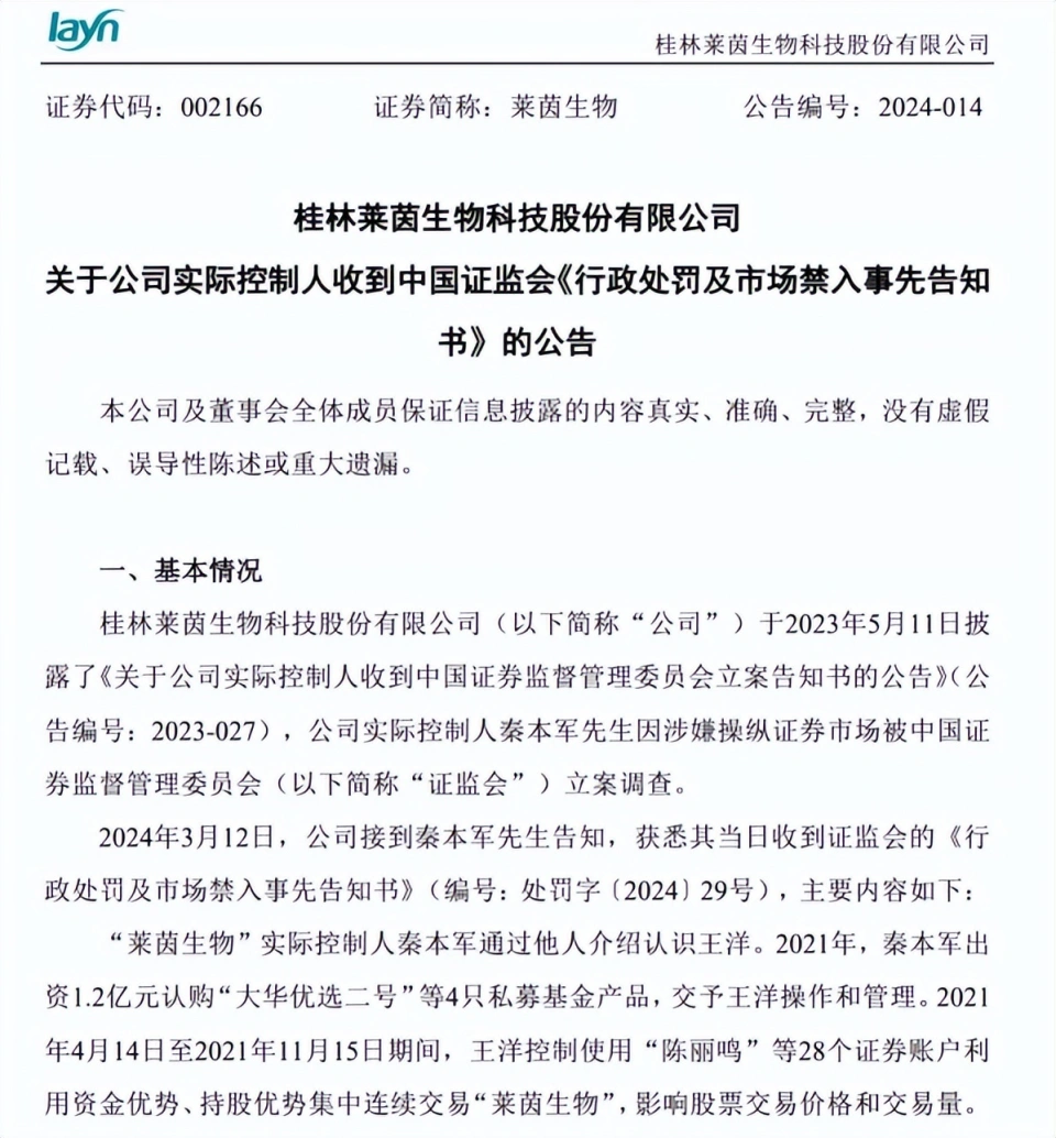投资者索赔正在举行中。 作者 | 徐长卿 编辑丨武丽娟 泉源 | 野马财经 动用1.2亿元坐庄自家股票,公司实控人被重罚。 3 月 13 日,莱茵生物(002166.SZ)公告体现,公司实控人、董事长秦本军因利用证券市场,与王洋二人处以414.56万元罚款,充公违法所得 138.18万元。同时,证监会还拟决定对王洋、秦本军分别采取 5 年市场禁入步调。 泉源:罐头图库 实在早在 2023 年 5 月 11 日,秦本军因涉嫌利用证券市场就被证监会备案观察。之后便立马引起市场的猛烈反响,公司股价在5月11日及越日连续两天遭受跌停重挫。此次或因靴子落地,莱茵生物股价并未受到太大影响。制止3月15日,报收6.92元/股,市值51.35亿元。 1.2亿+28个账户坐庄自家股票干了一票亏本的买卖业务?2021年,秦本军通过他人先容熟悉王洋,今后,秦本军出资1.2亿元认购“大华优选二号”等4只私募基金产物,交予王洋利用和管理。从2021年4月14日至2021年11月15日期间,王洋控制利用“陈丽鸣”等28个证券账户利用资金上风、持股上风,会合连续买卖业务“莱茵生物”,影响股票买卖业务代价和买卖业务量。买卖业务数据体现,在这段时间内莱茵生物股价由7.94元/股上涨至8.68元/股,区间涨幅为9.69%。 不外,令人不测的是直到被证监会发现,这笔投入了 1.2亿元的利用案,利润只有138.18万元。更具有玄色幽默意味的是,在他们卖出不久的2022年,莱茵生物就迎来了工业大麻的概念,股价一度拉升上涨50%。 证监会拟决定对王洋、秦本军分别采取5年市场禁入步调。由于被采取市场禁入步调后不得继承公司董事、监事、高级管理职员,这意味着,在莱茵生物继承董事长、总司理的秦本军,职务或将发生变更。 泉源:pexels网站 上述结果无论从哪个维度来看,似乎都是一场“亏本买卖”。但假如我们将时间线拉长,关注2022年莱茵生物股票暴涨后秦本军的利用,就能发现新的端倪。 早在2019年4月,在天然甜味剂等“甜蜜买卖”之外,莱茵生物涉足工业大麻范畴,公布将在美国投建年处理处罚质料本领5000吨的“工业大麻提取及应用工程建立项目”。因涉及工业大麻概念,这一消息发布后,莱茵生物的股价一起飙升。 2022年3月21日,莱茵生物披露了美国工业大麻建立项目渴望暨签署受托加工意向协议,提及“工业大麻提取及应用工程建立项目”预计将于2022年6月30日前告竣正式量产。受此利好刺激,莱茵生物股价直线涨停,在今后6个买卖业务日内劳绩4个涨停,乃至在当年7月到达年内高点14.73元/股。 面临公司股价暴涨,秦本军并未采取办法,但是作为公司十大股东的蒋安明、蒋俊、蒋小三却均减持套现。根据其财报体现,2022年一季度末,三人持股均为3.45%,而2022年三季报末,三人持股则分别低沉至2.55%、1.63%、1.04%,合计减持5.13%。彼时公司总股本约7.4亿股,若以此盘算,约莫减持超3700万股。固然2022年1月19日,秦本军与蒋安明、蒋小三、蒋俊签署了《扫除同等办法关系协议》,但秦本军与蒋安明、蒋小三、蒋俊为兄弟关系,也算是“肥水不流外人田”。 或被追究刑事责任投资者索赔正在举行中得罪法律一定会收到相应的处罚。此案中,王洋、秦本军不但被充公违法所得138.18万元,还被处以约415万元罚款(分别被罚207.28万元)以及5年市场禁入步调。 对此,有网友以为这一处罚并不重。北京商报批评员周科竞批评到:“莱茵生物实控人因利用证券市场收到预罚单,从处罚金额看属于没一罚三的顶格处罚。但对于实控人处罚,应该更为严厉,可以思量以涉案金额作为处罚依据,毕竟实控人利用证券市场更具伤害性。” 罚没的靴子固然落地,但后续影响仍在。 作为莱茵生物的实控人,秦本军涉嫌利用证券市场的活动,不但影响上市公司估值体系的公平公正,而且还会对其他投资者的投资决定作出误导,从而给以散户投资者为主的其他投资者造成巨大经济丧失。制止2023年第三季度末,莱茵生物拥有的登记在册股东人数高达6.07万户,均匀每户股东所持股份对应的市值约为6.38万元。若以此时间节点的数据估算,均匀每位股东在厥后的市场颠簸中遭遇的账面亏损靠近1万元。 现行《证券法》第五十五条规定,“利用证券市场活动给投资者造成丧失的,应当依法负担赔偿责任。”据此,莱茵生物的受损股票投资者可以主张民事赔偿。 客岁秦本军因涉嫌利用证券市场被证监会备案观察不久,新浪股民维权平台就收到过39件针对莱茵生物的维权。 北京时择状师变乱所臧小丽状师体现,最高人民法院、最高人民查察院于2019年7月1日施行《关于办理利用证券、期货市场刑事案件实用法律多少标题的表明》(下称《表明》)。根据这个《表明》,利用证券、期货市场罪的治罪量刑尺度此中有一条是,利用市场活动人违法所得高出一百万元,即可入刑。而上市公司的控股股东大概实际控制人以及高管实行利用证券、期货市场活动的,赢利大概制止丧失数额在五十万以上的,便到达了刑事备案追诉尺度。对照两高的这个《表明》,莱茵生物的实控人存在被追究刑事责任的风险。 臧小丽状师开端以为,符合以下两个范围之一者有获赔渴望:一是在2021年4月14日至2021年11月15日期间买入过莱茵生物股票的受损投资者;大概是在2021年4月14日至2023年5月10日期间买入过莱茵生物股票的受损投资者。(终极由法院讯断认定为准) 关于利用证券市场活动的索赔,早有乐成先例,2019年12月27日,成都中院对天下