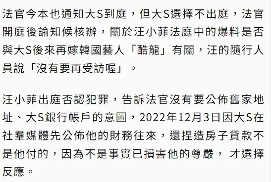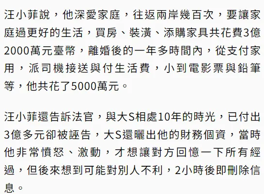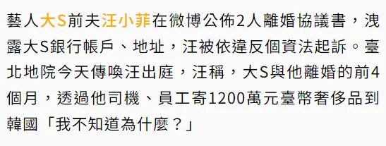 3月19日,大S与前夫汪小菲的官司在台北法院开打,男方又爆出大瓜。 大S告状汪小菲两项罪名,一项是拖欠抚养费,一项是泄漏大S的个人资料。 3月19日开打的是第二项,汪小菲涉嫌泄漏大S个人信息,汪小菲亲身出庭,大S只派了状师应对,事先告知媒体不会出席。 汪小菲的状态不错,被问及台湾女友的状态笑了一笑没有答复,在法院逗留一个小时后离开,开口表现很喜欢台湾,会常常来。 汪小菲离开之后,台媒立即拿到他在法院上的发言,汪小菲否认泄漏大S的隐私,表现本身不是故意没有公布大S地点及银行账户,因由是大S在22年12月3日公布了他的财务往来,捏造房子贷款不是他付的,陵犯他的尊严才选择反映。 此处帮各人回首一下,两人当时在网络上对峙,大S突然吐槽汪小菲卖酸辣粉,然后晒出银行贷款,声称房子的首付和贷款都是她给的。 汪小菲随即在微博公布两人仳离协议,表明要付出共计1.8亿台币的抚养费,房子归大S全部,期间也曝光了大S的地点。 汪小菲表现,银行账号不是大S的,全部资金都是他在付出,他没有动机及目标陵犯大S的权益,只是为了自证明净。 别的,汪小菲还说本身婚内往返两岸几百次,为了让家人的生存变好,买房、装修、增加家具共计花了3.2亿台币,仳离一年多,又给家里付出了5000万台币。 汪小菲以为本身很冤,显着为这个家花了逾3.7亿台币(折合人民币8376万元)还被大S诬告,拊膺切齿才晒出单子,让大S回想一下,2个小时后删除。 期间最劲爆的内容,是汪小菲爆料在和大S仳离前的四个月,大S通过汪小菲的司机及员工,刷他的光荣卡向韩国寄送了1200万台币的奢侈品,折合人民币271万,他在法庭上反问“我不知道为什么?” 检方指出,由于汪小菲在微博贴出大S仳离协议时,未掩藏大S的隐私导致外泄,大S才告状汪小菲,法官也关照大S到庭,不外大S选择不出庭,只能谕知候查究 现在,台媒尚未曝光大S方面在法庭上的供词,审判效果亦尚未出炉。 |