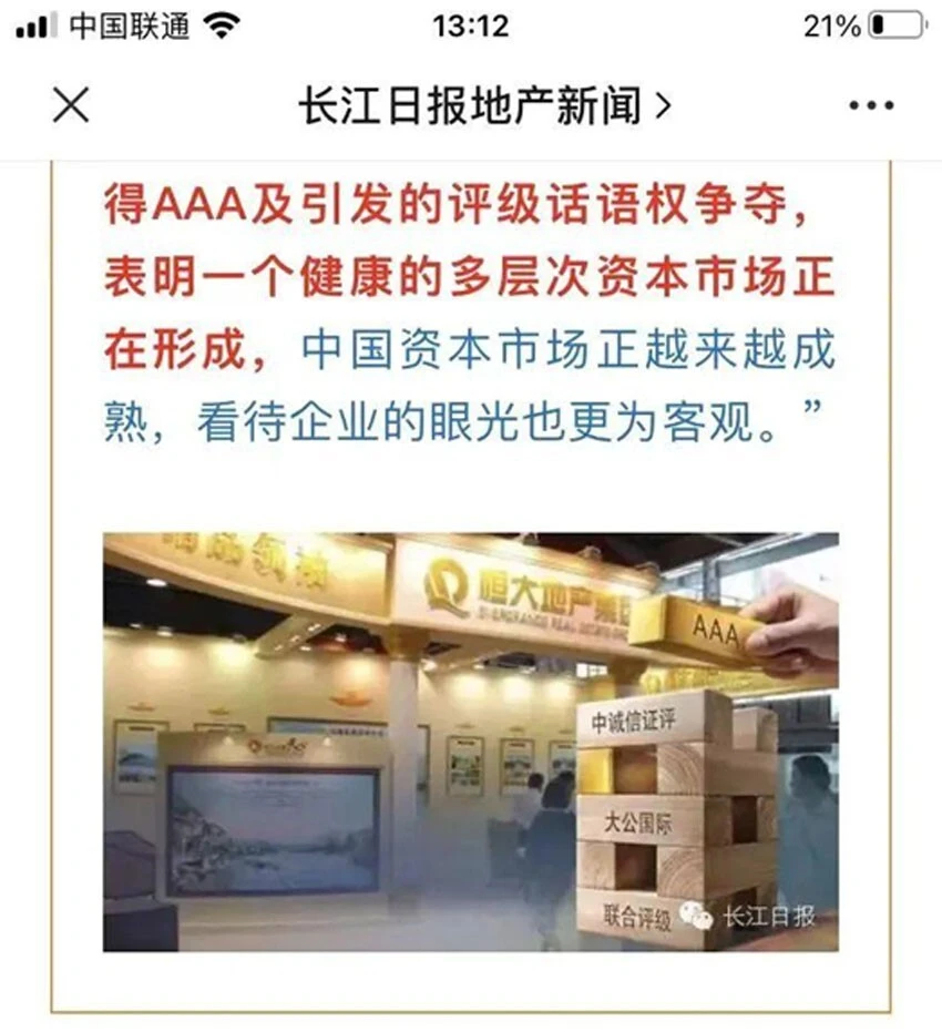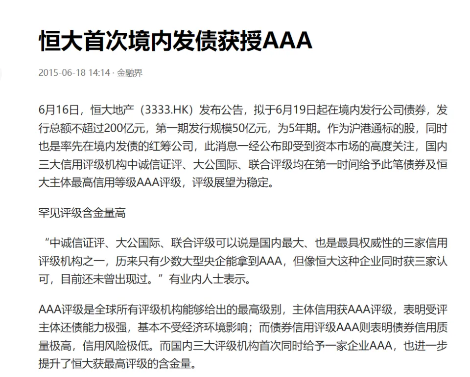 内容提要: 因恒大在倒闭前的几年里严肃夸大了其贩卖额,恒大、许家印和其他几个高管被证监会处罚。但恒大的风险早已有人吹哨,却被国内的相干机构视为异见,为恒大站台,助力恒大一起造假,一起推高债务。对这些机构,岂非不应追责吗? 3月18日,中国证券羁系机构对曾经是中国最大房地产开发商之一的恒大团体处以41.75亿元的重罚,并永世克制其首创人进入资源市场,缘故因由是恒大在倒闭前的几年里严肃夸大了其贩卖额5640亿元人民币。 同时,恒大地产六位高管及前高管也受到相应处罚。此中,许家印决定并构造实验财务造假,夏海钧构造安排体例卖弄财务陈诉,证监会拟对二人采取终身证券市场禁入步伐,分别处以4700万元及1500万元的罚款;对潘大荣、潘翰翎给予告诫,并分别处以900万元的罚款;别的,对柯鹏、甄立涛、钱程分别给予告诫及20万-300万元不等的罚款。 在这种环境下,恒大应该不是一个个案,此举突显出上面在恒大倒闭后加大力大举度遏制金融犯罪,在恒大金融团体的财务管理不善给中国经济带来广泛风险后,用杀鸡儆猴方式给予其他企业的严厉告诫。告诫其他企业和企业家应该积极自律,由于预计当局将来将加大打击力度。 证券羁系机构责备非难许家印对金融敲诈做出决定和构造,涉嫌敲诈的深度令人震惊。不外,由于许家印等恒大高管此前由于涉嫌犯罪,已经被刑拘,上个月香港最高法院也责令恒大休业,并指定了休业管理人,因此证券羁系机构3月19日对恒大和许家印的行政处罚,应该不会对公司或其债权人产生巨大影响。 许家印于2023年9月已经被刑事拘留,并被警方控制在中国一个不着名的所在。固然罪名不明,但从那以后,他再也没有公开露面。 羁系机构认定恒大财务造假5640亿元,恒大负债2.4万亿元而休业。实在恒大的斑斑劣迹并非没有预警,我们并非无法看破。这一起上实在有不少机构失去独立性而在此中推波助澜,应该负担责任。 第一、香港证券管理机构认定恒大债务风险最早的吹哨人香橼对恒大的控告属卖弄误导,并克制香橼首创人进入香港资源市场5年,该负担什么责任? 美国浑水机构香橼及其首创人早在2012年发表了一份针对恒大的沽空陈诉,该陈诉责备非难恒大无力归还债务和存在管帐方面的敲诈举动。 对于房地产的风险,当时并非只有众人皆醉唯香橼独醒,在香橼针对恒大发出赤色警报的同时,国本地产行业龙头万科当时也多次对外喊话,“地产白银期间到来,企业应该对扩大规模保持慎重”。 当时的这份陈诉,引起了社会的广泛关注,并对恒大的荣誉造成了肯定的负面影响。但香港证券管理机构并未客观对待独立机构的善意吹哨,反而裁定香橼对恒大的控告属卖弄误导性,并克制香橼首创人进入香港资源市场5年。 香橼不平上诉后,2019年香港上诉法庭驳回了香橼首创人Andrew Left以“法律题目”的上诉。 第二、2015年在标普将恒大评级下调至负面时,国内三大评级机构逆风而行,给予了恒大3A的最高名誉品级,为以后恒大快速放大名誉风险背书,该负担什么责任? 2015年5月7日,国际评级机构标普把恒大的恒久企业名誉评级由“BB-”下调至“B+“,预测为负面。如许下调评级的结果,相称于告诉全天下的投资人,不能继续乞贷给恒大,否则将会存在无法收回的结果。 当时国内房地产被炒得风起云涌,房地产业热火朝天,标普的这份评级陈诉无异于向正在崛起的房地产业泼来冷水。国内评级机构纷纷扬弃客观与专业,站在政治准确的态度上视标普为敌,为恒大站台。 中诚信国际、大公国际、连合评级等国内三大评级机构,灵敏发布恒大地产名誉评级陈诉,无一破例全都给予了恒大3A的最高名誉品级,评级预测为稳固。 一样寻常环境下,在国内能拿到3A评级的企业少之又少,险些满是央企巨头,好比中石油、国家电网、招商局、中信团体等。3A评级表明受评主体还债本领极强,根本不受经济环境影响,具备较强本钱及风险监控管理本领,多元融资渠道提拔财务弹性,布局广泛均衡,抗风险本领以及顺应本领较强。 三大评级机构在标普下调恒大为负面时,给予恒大3A评级,便是为恒大继续扩张债务团体背书,为恒大几年后的债台高筑、资不抵债、整理休业立下了巨大功劳。由于有了国内三大评级机构的背书,恒大就等同于得到了一张在资源市场随处乞贷的通行证。 第三、每一次国际专业评级机构下调恒大名誉评级,国内的媒体、自媒体都会责备非难国际评级机构诋毁我们的企业,粉饰恒大,向投资者营造恒大精良的错觉,误导投资者,该负担什么责任? 标普下调恒大评级后,很多媒体、自媒体责备非难标普造谣,以致痛骂美帝诋毁我们的资源市场。 人民网于2015年6月16日发表文章称,一位资深评级人士表现:“(央企巨头能拿到AAA)一样寻常也都只有一家评级机构认可给予,此次恒大可谓创造了中国企业名誉评级的个案……此次三大机构的同时评级,震惊了整个资源市场……精良的中国龙头企业……虽广泛得到国内机构的认可,却在国外评级中遭遇冷场,以致沉溺到C类评级——这种国表里的巨大差别,由来已久且具有深条理缘故因由。” “标普却在本年5月给予恒大较低的B+评级,暗示恒大还本付息及服从左券存在风险。实际上,恒大不但从未违约,客岁12月还动用自有资金一次性提前归还了13.5亿美元的巨额债务,秀了一把财务强劲的肌肉。” 长江日报当