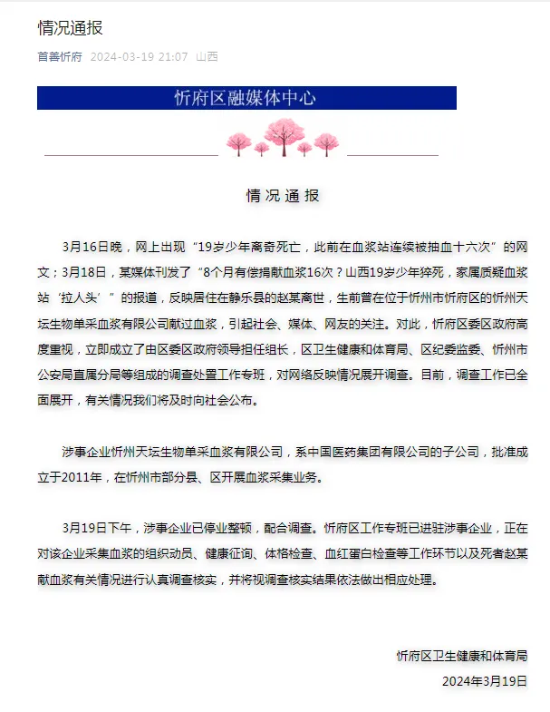 每经编辑:杜宇 天坛生物3月20日午间发布公告称,公司关注到所属忻州天坛生物单采血浆有限公司(简称“忻州浆站”)干系媒体报道。报道中提及的最短献浆隔断天数为12天为不实信息,忻州浆站严酷按照干系规定确保献血浆者两次献血浆隔断不少于14天。 同时,经查询该名献血浆者年岁等根本信息及实在验献浆时干系体检资料,条件符合采浆要求。公司对于一个年轻生命的逝去深感痛心和痛惜,现在,忻州浆站已自动停业,将积极共同忻府区卫生康健和体育局干系观察工作。 制止发稿,天坛生物(600161.SH)报27.18元,涨幅0.07%,市值447.9亿元。 3月19日晚,山西省忻州市忻府区卫生康健和体育局发布情况转达。 据首善忻府官方微信号,转达称,3月16日晚,网上出现“19岁少年古怪殒命,此前在血浆站连续被抽血十六次”的网文;3月18日,某媒体刊发了“8个月有偿募捐血浆16次?山西19岁少年猝死,眷属质疑血浆站‘拉人头’”的报道,反映居住在静乐县的赵某离世,生前曾在位于忻州市忻府区的忻州天坛生物单采血浆有限公司献过血浆,引起社会、媒体、网友的关注。对此,忻府区委区政府高度器重,立刻创建了由区委区政府向导担当组长,区卫生康健和体育局、区纪委监委、忻州市公安局直属分局等构成的观察处置处罚工作专班,对网络反映情况睁开观察。现在,观察工作已全面睁开,有关情况我们将实时向社会公布。 转达表现,涉事企业忻州天坛生物单采血浆有限公司,系中国医药团体有限公司(即央企巨头国药团体)的子公司,允许创建于2011年,在忻州市部分县、区开展血浆收罗业务。 3月19日下战书,涉事企业已停业整理,共同观察。忻府区工作专班已进驻涉事企业,正在对该企业收罗血浆的构造动员、康健征询、体格查抄、血红卵白查抄等工作环节以及死者赵某献血浆有关情况举行认真观察核实,并将视观察核实效果依法做出相应处置处罚。 据新黄河报道,2024年1月15日,家住山西省忻州市静乐县的19岁小伙赵伟在家中忽然逝世。父亲赵志杰在整理其遗物时发现,赵伟在逝世前8个月时间内疑似连续被抽采血浆多达16次,最短的“卖血”隔断天数为12天。 遗物中另有一张赵伟在逝世十天前于本地医院开具的查抄单,诊断表现其重度血虚,疑出现造血功能停滞。 赵伟的手机谈天纪录里,纪录着他被人接送到“忻州血浆站”变卖血浆的过程,“讨论人”每次付出给他260元-300元左右的费用。赵志杰以为,该血浆站需对赵伟的不测离世负责。 据相识,“血浆站”差别于“献血站”,单采血浆站是由血液制品生产单位设置的。所谓“单采血浆”,是把采到的人血经离心机分离,取走血浆后再把红细胞回输给抽血者。2021年9月2日,国家卫生康健委办公厅发布了《献血浆者须知(2021年版)》。此中提到,献血浆者只继续单采血浆机收罗血浆,拒绝手工利用收罗血浆。两次献血浆隔断不得少于14天,一年内累计献血浆次数不得凌驾24次。每次献血浆量不得凌驾600克(含抗凝剂)。别的,上述须知对献血浆者体格查抄和血液检测项目亦有明确要求。 据悉,献血浆现实上是供浆,血浆占人体血液的55%左右,血浆中90-92%因素是水,别的是卵白质、无机盐、脂类等,从血液中分离出淡黄色液体,用于临床救济药品和疫苗等血液制品生产。据新华社报道,单采血浆站一样寻常是由企业设置,它实验呆板收罗单采血浆,不能用于临床,其唯一的供应对象是血液制品生产企业,用于制造血液制品。现在我国还没有干系规定要求收罗血浆必须是无偿的。国际上单采血浆有有偿的,也有无偿的。 赵志杰说,赵伟生前被数次送往名为“忻州血浆站”的地方,以单次260元-300元左右的报酬抽采血浆。有关单子表现,两次抽采血浆的最短纪录仅有12天,赵伟曾一个月内被3次收罗血浆。 据悉,赵伟自2023年5月通过一名吕姓夫君打仗到血浆站,匀称每个月抽2次血浆,每次都可得到金额不等的费用,对方还提供“车接车送”的服务。“这个血浆站属于‘拉人头’宣传,拉一个给100元。”赵志杰说,“他们通过这种方式诱骗这些刚入社会的孩子频仍‘卖血’,导致我儿子长时间高频率抽血,造成血液再生功能疾病末了导致殒命,必须为此负责。” 3月18日,涉事血浆站忻州天坛生物单采血浆有限公司回应称,赵伟符合抽采血浆要求,公司严酷按照国家规定工作,如有贰言眷属可走法律途径。 逐日经济消息综合天坛生物公告、新黄河客户端、首善忻府、新华社 逐日经济消息 |