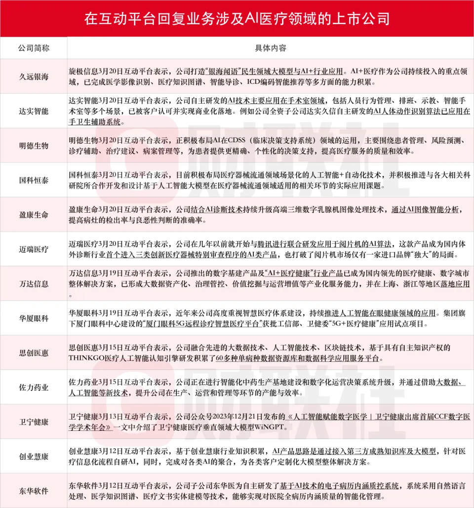 财联社3月20日讯(编辑 俞琪)被英伟达认证是“下一个黄金赛道”的AI医疗正在成为市场核心。诺和诺德背后的企业基金会公布将与英伟达相助,在丹麦制作一台名为Gefion的AI超等盘算机,该盘算机将运行英伟达的AI技能,告急目标是发现新的药物和治疗方法。与此同时,在正举行中的英伟达GTC大会上,有90场运动与医疗保健/生命科学相干,数目凌驾了汽车、云服务、硬件/半导体等热门范畴,位居全部行业之首。 A股市场方面,自主研发NLPearl遗传疾病人工智能临床决议支持体系的贝瑞基因收盘连续三天涨停,积极布局AI等信息技能的塞力医疗亦拿下三连板,拥有多项人工智能医疗服务产物的润达医疗盘中涨停,自行搭建PR-GPT多模态大型语言AI模子的泓博医药盘中最高涨近15%且股价直逼汗青新高;开发建立人工智能药物发现技能平台的药石科技收盘涨超14%。 中邮证券蔡明子等人在3月10日研报中表现,“AI+医疗”是局面所趋,能多维赋能医药全产业链。从发展远景看,AI医疗已步入快速发展新阶段,在AI药物研发、疾病诊断及筛查、AI医疗影像、AI手术呆板人、CDSS与病种质控、医学数据智能平台等细分应用场景全面渗出,且可以或很多维触达医药行业的药品研发、药品生产制造及医院端诊疗等全产业链。根据艾瑞咨询的数据,其市场规模在2025年有望达385亿元,2020-2025年CAGR达46%。 ▌科技巨头牵手药企蔚然成风:诺和诺德携手英伟达之前华为联手中药老字号杀入AI制药 多家A股上市公司麋集回应相干布局 面对AI浩繁应用端,英伟达对AI医疗范畴可谓非常偏幸,掌舵人黄仁勋已多次公开表现“AI+医疗体系/生物学”是“下一场惊人的革命”,而且英伟达仅在客岁就投资了9家专注于药物研发范畴的初创生物科技公司,而此次与诺和诺德基金会的携手意味着英伟达将AI医疗看作“下一个黄金赛道”这一理念得到了来自医药界真金白银的支持。 AI医疗愈发被看好,英伟达自然也不是这条赛道上的独行者,微软、谷歌等也正在将生物技能视为AI的下一个前沿范畴。国内方面,华为、腾讯、百度等科技巨头也均入局,并与医药企业“牵手”相助。此中,华为早在2021年就与数十家医药企业就旗下的医药追溯体系睁开相助,今后华为还与老牌药企云南白药联手签订AI制药范畴的相助协议。别的,百度文心一言首个落地医药行业的产物GBI-Bot正式在本月发布,腾讯早前也发布AI驱动药物发现平台“云深智药(iDrug)”也已问世。 民生证券王班在客岁7月23日研报中表现,头部公司在底子层围绕数据、算法和算力已经构筑了高壁垒,而多数的科技公司在技能层完成上风范畴的布局,终极在应用层实现对医疗服务全范畴的覆盖。在药物研发全产业链中,上游的模子数据集是告急资源、云盘算平台提供算力支持;中游的AI药企通常接纳研发外包情势与卑鄙相助,而IT公司通过AI模子和盘算平台到场到新药发现中;卑鄙传统药企是AI药企的告急相助搭档。 现在,联影医疗,迪安诊断、润达医疗、安必平、金域医学,智云康健,泓博医药、成都先导、药明康德等国内企业均在AI医药范畴有所布局。据财联社不完全统计,停止发稿,包罗长远银海、达实智能、明德生物、国科恒泰、盈康生命、迈瑞医疗、万达信息、华厦眼科、思创医惠、佐力药业、卫宁康健、创业慧康、东华软件等多家A股上市公司近两周在互动平台复兴AI医疗相干业务布局,具体环境详见下图: ▌三大AI医药牛股2月迄今股价强势翻倍 药明康德“蹲”在阳光照不进的角落 资源市场的AI医药海潮亦闻风而逃,停止收盘塞力医疗和贝瑞基因双双斩获三连板,泓博医药本日盘中涨近15%且在周一20cm涨停,8个买卖业务日内的累计最大涨幅达104%。值得注意的是,上述三家上市公司2月迄今股价累计最大涨幅均实现翻倍。 此中走势最强的当属泓博医药,近两个月股价累计最大涨幅达159%。泓博医药上周五在互动平台提到,其早于2019年就建立了CADD/AIDD技能平台,该平台已成为公司新药研发的告急工具。公开资料体现,作为主营药物发现、制药工艺研发及质料药中心体新药研发企业,泓博医药自行搭建的PR-GPT多模态大型语言AI模子告急用于处置惩罚和天生人类语言以及化学分子形貌,PR-GPT在药物计划和化学研究中的应用告急基于其强大的天生和猜测本领。 在泓博医药近两日盘中均涨约15%但离涨停“差口吻”的同时,塞力医疗和贝瑞基因上演涨停接力走出三连板,近两个月股价累计最大涨幅分别为105%和101%。 具体来看,塞力医疗作为以“人工智能+医疗大数据”为底子的智慧医疗综合体系建立供应商,通过创新医废处置惩罚平台与现有“SPD+IVD”双主业形成生态链。据媒体报道,塞力医疗于2月28日和达梦数据正式签订战略相助协议,达梦数据将在SPD医院智慧供应链管理范畴为塞力医疗提供独家定制产物服务。主营基因检测的贝瑞基因曾在互动平台表现,公司的CNVisi利用人工智能深度学习算法,发掘20+权势巨子公共数据库、百万自有CNV大数据以及20多万份CNV-seq临床实践陈诉,构建7大临床解读知识库,精准表明解读、AI智能撰写陈诉,节省临床≥90%的操纵时间。 值得注意的是,近期身陷生物安全法案风波的药明康德亦在AI制药有所涉足。公司在互动易曾多次复兴,AI技能在新药研发范畴具有很多运用场景,公司不绝连续关注和发展与之相干的技能研发和运用。别的,据公开信息体现,