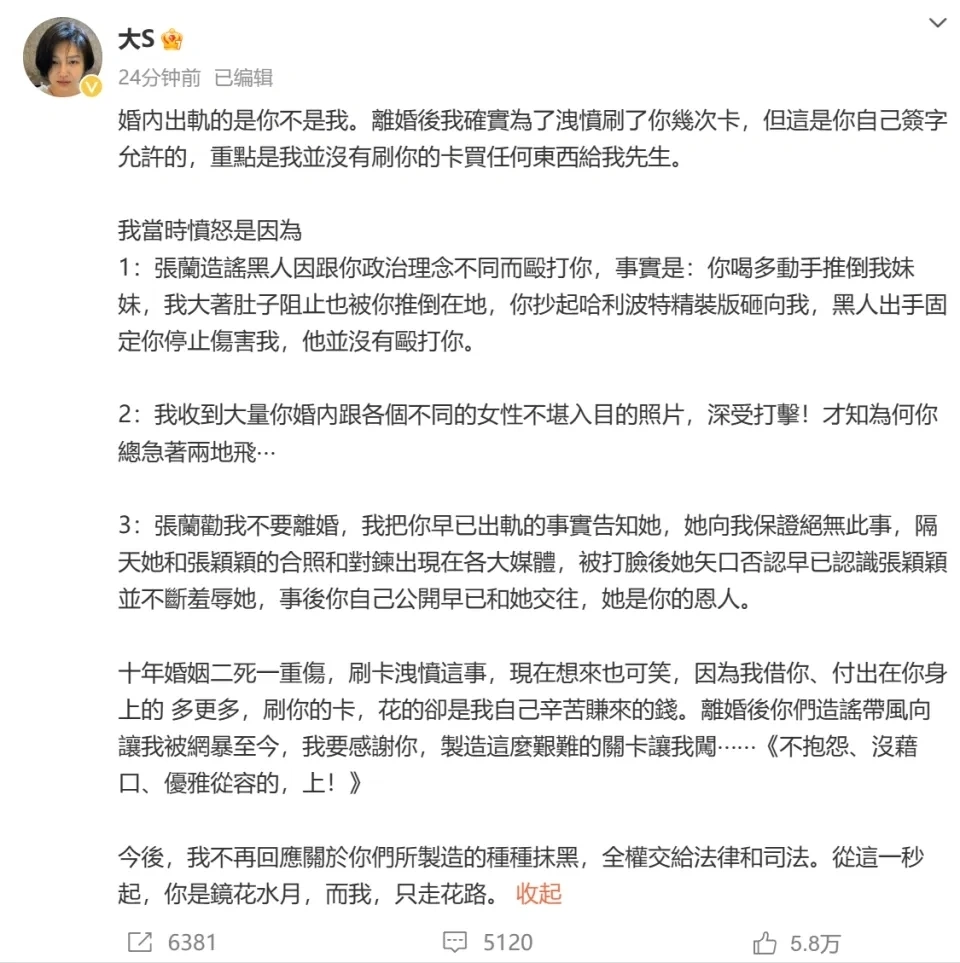 汪小菲跟大S这对昔日怨侣又睁开新剧情了。汪小菲被大S告状泄漏隐私,然后汪小菲在庭上为了证实明净,曝出了大S仳离前寄了270万礼品到韩国,暗示大S出轨,结果引发了一系列互撕。 汪小菲暗示大S出轨,引发了大S的反击,她发文体现出轨的是汪小菲,自己仳离后还刷他的卡是泄愤运动,并体现自己从来没有效前夫的卡,买任何东西给具俊晔。 然后,汪小菲暴怒了,开始了绝地反击,晒出了一系列证据和截图,怒斥大S陵犯光荣权。汪小菲先是发出了三张图,体现其他的在法院说。 他晒出的第一张图是大S2021年8月仳离前,寄往韩国的礼品快递单以及大S安排司机寄出去的谈天截图,这个证据可以说是非常关键。 大S寄往的地方正是韩国忠孝东路某地,疑似寄给了具俊晔。 剩下的两张图分别疑似公证书和房贷付出明细,汪小菲以此表明台湾省的房子是自己购买,房贷也是自己在缴,并非大S方面所说的,房子是大S购买。 接下来就是更关键的内容了 。 汪小菲再次发长文,针对大S称他动手推倒小S,汪小菲举行了否认,体现其时大S不乐意回北京,还不停诋毁我们,小S还不绝煽惑大S仳离,自己气不外。而且自己不但没有家暴,还反被大S家暴,称大S产生幻觉的时间,运动非常疯狂:“用刀、用高尔夫球杆、用红酒瓶打我!证据都有,也有证人,你苏醒后说你忘了,把我当作你爸了,我也从来没说过你一句不对。” 汪小菲对于自己出轨张颖颖的事,没有提及。反而晒出了物流单和时间,喊话大S人在做天在看,她在婚内就跟具俊晔接洽上了:“我选择不曝光,你蹬鼻子上脸,早就跟他接洽上了别不认可!” 末了,汪小菲痛斥大S,不让孩子回北京,怒斥她把不正头脑传输给孩子。自己已经容忍太久了,大S总拿隐私说事,这次自己却被大S陵犯光荣权。 汪小菲还不忘讽刺大S:“你是我孩子妈,我恭敬你,但你们从没恭敬过我,盼望以后有事你们不要再通过别人的嘴巴说!” 汪小菲在配文的同时,还公布了九宫格照片做证据,除了上面说到的快递单和房贷付出之外,尚有跟大S本人的对话截图。 两人针对孩子能不能回北京举行商讨,大S称寒暑假可以带孩子出国,但是不去北京,由于孩子畏惧,并喊话不让张兰见孩子,汪小菲怒斥她灌输不良头脑,大S举行了否认。但是用“出国”形容,还说不能去北京,这味儿真希奇。 尚有大S发孩子跟具俊晔的合影,祝福汪小菲,然后拉黑汪小菲。非常会气汪小菲。 从照片上看,具俊晔跟大S一起过新年,而且还穿着情侣装,孩子们跟具俊晔似乎也相处很融洽。 随后,针对大S求全非难汪小菲动手推小S的事,小S本人也回应了,不外没有正面证实,也没有否认,只是体现谢谢各人的关心:“这几年真的辛劳我姐了。” 闹到现在,局面可谓是丢脸。就盼望两人可以或许看在孩子的份上,少一些针锋相对吧。 |