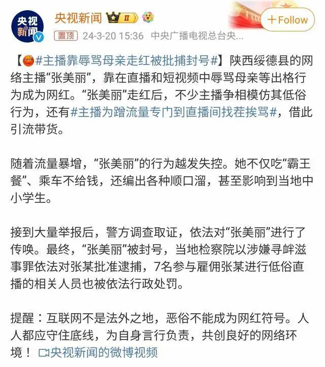 3月20日,央视媒体发布消息,陕西绥德县着名女网红主播“张漂亮”被逮捕,平台干系账号已被封禁。 说到这个网红“张漂亮”,一些网友不怎么看直播的人,大概连名字都没听说过,心想这个长相平平的中年妇女是谁呀? 怎么好好地就被逮捕了呢? 但只要是陕西的网友,尤其陕西绥德那片的网友,肯定对“张漂亮”的这个名字一点不生疏了。 没办法,张漂亮在当地太著名了。 “张漂亮”一开始就是个平凡人,长得不怎么悦目,体型也没有女人味,用如今网红的尺度来说,根本连入门都不算。 乃至她连平凡话都说不清晰,一嘴的当地方言。 可就是这么一个农村女人,却有本身独到的生财之道和成名之路! 一开始的时间,“张漂亮”没什么人气,寻常也都是在平台上发发视频,分享一下一样寻常。 结果有一次,她偶尔发布了一个和本身母亲产生口角的视频,结果就莫名其妙人气就起来了。 尝到优点之后的“张漂亮”,继承如法炮制,接着录制本身唾骂母亲的那种。 你还别说,真的有不少人追捧过来,粉丝也涨了好几万。 过后“张漂亮”一发不可摒挡,趁着人多直接开启了直播生活。 “张漂亮”在直播间里剑走偏锋,不但唾骂本身母亲,乃至还骂网友。 本以为她如许的网红会立马被平台封号和被网友扬弃。 可结果谁能想到,“张漂亮”就是靠着这门独绝本领越来越红,人气越来越离谱。 期间,“张漂亮”不是没有实验过转型,但她正常直播的时间,直播间里只有1000多人。 而只要她一开口骂人,人气立马翻倍,围观的网友起哄打赏不停,“张漂亮”也赚得盆满钵满。 云云一来一回,“张漂亮”算是彻底把握了这些歪门邪道,在骂人直播的门路上越走越远。 当地的一些小网红眼看着名不见经传的“张漂亮”敏捷走红,也选择跟着蹭流量。 早先各人是跑“张漂亮”的直播间自动找骂,通过两人的互动来为相互增长粉丝。 到厥后直接演变成了“张漂亮”收费骂人。 你给我几百块钱,我在直播间里骂你,陪你演戏,为你涨人气。 守旧估计,“张漂亮”光靠收这个“份子钱”,一个月就能赚将近一万块钱 再加上那些网红如众星捧月般围着她转,又是宴客用饭,又是给钱让,“张漂亮”的心田无比膨胀。 不停发酵到末了,“张漂亮”出去用饭的时间都是霸王餐,出门坐车更是不给钱。 别人问她要钱的时间,她直接打开直播,美其名曰帮对方宣传了! 在“张漂亮”人气最高的时间,她走在阛阓里打开直播,自称是陕西绥德“代言人”。 在当时间,她没流量的时间就骂人,有流量的时间就直播带货,而且共同着拍摄一些低俗不雅的视频维持热度。 旁人嗤之以鼻的下三滥本领,在“张漂亮”这里,完全就是捞钱的工具。 小日子过得好不滋润。 所谓常在河滨走,哪有不湿鞋。 大噶?鲻得太过火了,导致在当地各人对于“张漂亮”这个网红嗤之以鼻,却又无可怎样。 一方面,各人不齿于这种低俗运动。 另一方面,人家确实越来越火,赚得越来越多。 于是各人纷纷举报,有关部门加入观察后,直接对“张漂亮”举行了传唤,而且在网上发布公告。 向全社会征集“张漂亮”违法犯罪的证据包罗,但不限于用饭和坐车,以及唾骂她人等等。 终极,“张漂亮”和7名雇佣本身举行低俗直播的干系职员都被依法行政处罚,“张漂亮”的账号也被平台封禁。 说真话,我个人以为平台这个封号封晚了,清朗举措清了那么长时间,正常讨论的平凡人被误杀了不少,反倒是像“张漂亮”如许明火执仗举行低俗直播的网红,全赚得盆满钵满。 寻常各人在网上发个脏话都得鉴戒翼翼,可像“张漂亮”如许的低俗网红,却大把给流量,无形中就让有些人铤而走险,开始效仿,造成烈?恶劣的社会影响。 这次央视消息点名品评,也是为那些没被逮捕的网红提了个醒。 有本领的尽快转型,没本领的也恰到利益,靠骂人这种低俗直播赢利的门路,走不通了。 |
