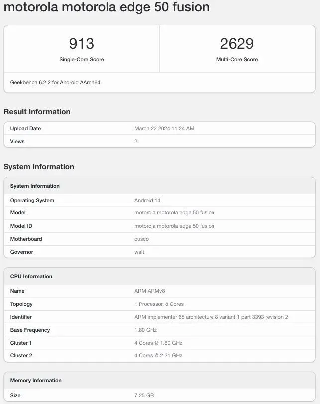IT之家 3 月 23 日消息,摩托罗拉筹划 4 月 3 日发布 Edge 50 Fusion 手机,该机现在已经现身 GeekBench 跑分库,6.2.2 版本单核效果 913 分,多核效果 2629 分。 根据跑分库表现的规格信息,Edge 50 Fusion 手机配备了 4+4 核心设置的八核处置处罚器,此中包罗 4 个时钟频率为 2.21GHz 的性能核心和 4 个时钟频率为 1.8GHz 的服从核心,意味着该处置处罚器为高通骁龙 6 Gen 1。 Moto Edge 50 Fusion 的 Geekbench 列表还表现它配备了 8GB 内存,该机还将预装基于安卓 14 体系的 HelloUI,预装 Moto Secure、Moto Connect、Moto Unplugged 等软件。 IT之家此前援引消息源 @Evleaks 爆料,摩托罗拉 Edge 50 Fusion 将采取 6.7" POLED 表现屏,内置 5,000 mAh 电池,支持 68W 充电。 这款智能手机将到达 IP68 防护品级,配备 5000 万像素主摄像头和 3200 万像素自拍摄像头。 |