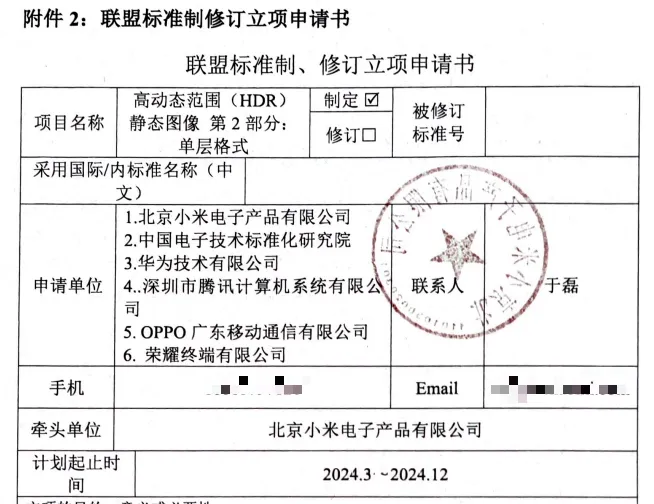 “小米牵头华为、腾讯、OPPO和光彩,团结申请定制单层HDR图像格式标准”。