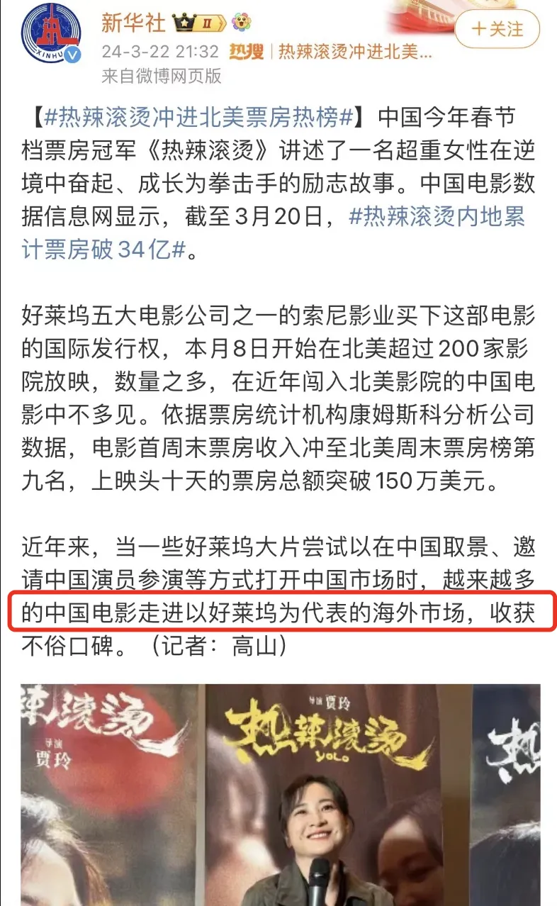 春节档影戏《热辣滚烫》《第二十条》《飞驰人生》等影戏均取得了不错的票房结果。 然而,如果说到外洋的票房结果,《热辣滚烫》还是一骑绝尘的。 看下北美票房。 影戏被索尼买走了版权,200多个影院放映。 如今的票房已经高出了150万美元(人民币1084万)。 也算是这几光阴语片最好的票房了。 同时,贾玲的别的一部影戏《你好李焕英》也被改编成为了美剧,贾玲还到了洛杉矶,做了监制工作。 有一张合影,是贾玲和其他几位国外导演的合照,状态看起来也是很好的。 再来看看马来西亚的票房。 该片上映当天,就摘得了冠军的旗帜。 如今,影戏的票房还高出了大热IP《功夫熊猫》,也成为了首部登顶的中国影戏。 《热辣滚烫》的出海,让中国影戏扬眉吐气。 新华社也发布了一则消息,来评价《热辣滚烫》,此中,有两句话说的很好—— 「越来越多的中国影戏走进以好莱坞为代表的外洋市场,劳绩不俗口碑!」 在已往,中国的影戏要想要得到老外的赞誉,无非是拍摄一些揭破昏暗面的戏份。 依赖装可怜,博怜悯的戏份,拍迎合西方审美的片子。 像这种积极正能量,显现中国女性励志题材的影戏,老外不停是不承认的。 而如今,好的票房也代表了中国影戏的力气。 索尼影业还发布了特殊放映会的资料,贾玲在台上和其他的导演一起言笑风生。 如许的文化输出平庸而有力气,不媚俗,不猎奇,富足感动人。 从《你好李焕英》到《热辣滚烫》,贾玲的影戏不停显现的都很朴素,接地气的情绪。 影戏中的妈妈,姐姐等脚色,也极尽生动和写实。 而这些人类共同的情绪,是高出民族,高出文化的。 就像是国外友人评价的那样—— 「各人都通过影戏看到了弱势群体的力气,看到他们想要提升改变近况的刻意和呼声。」 网友还很疑惑,不知道为什么有人会对该片那么大的恶意,以致在没看完的情况下就给了1星。 网友还提出了疑问——「真的由于它就是一个女性导演拍出来的吗?」 老外的评价固然刁钻,但是也代表了大部分人的见解。 那就是每一个渴望进步,渴望发展和阳光的人,都值得各人的一个掌声,哪怕末了遍体鳞伤,她都已经赢了。 在国外的烂番茄网站上,如今的希奇度为80,爆米花指数为91,观众口碑略好于影评人的口碑。 吴彦祖这几天还专门去看了贾玲。 和贾玲合影,贾玲的「一脸褶子」也遮挡不住心田的高兴,一口白牙笑开了花。 他评价贾玲是多才多艺。 惊人的变化,已经让自己瞠目结舌。 非科班身世,她的密切,朴拙就足以资助她赢得观众们的掌声。 在如今的影戏票房榜单前十名中,贾玲也是唯逐一位女导演,以88亿的结果排在第九名。 片方分账十几个亿,贾玲也是赚得盆满钵满,成为了贸易代价极高的女导演。 在今后的筹划中,贾玲还透露了自己要拍摄的第三部影戏。 一部关于「人类」的影戏,陈诉一位家里的长姐从一个传销的受害者发展成为公理保卫者的故事。 仍然是接地气,有共鸣的实际主义题材。 女性的情绪和厘革将会是又一个看点,同时,她暂时也不会回归《王牌》。可见,贾玲已经正式将重心从综艺变化到了影戏,可以大概看到影戏人的初志和对峙。 信任,34亿也仅仅只是贾玲的开始。 你喜好看贾玲的影戏吗? |