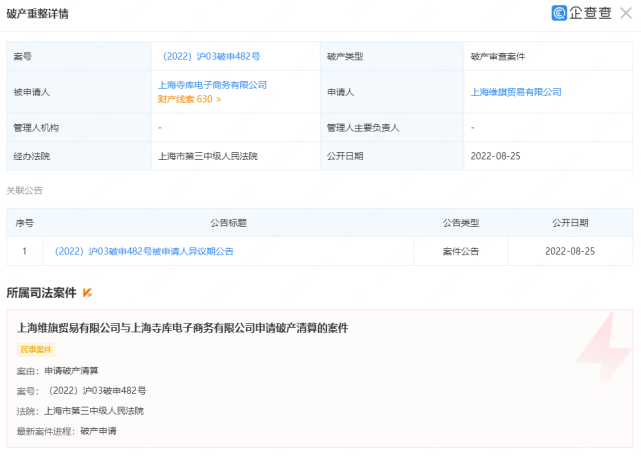 作为“中国奢侈品电商第一股”的寺库,迩来贫困不停。 疑似跑路的听说刚刚平息,克日全资子公司又被申请停业整理。本年以来,寺库已两次被申请停业重组。 着名电商又失事! 全资子公司被申请停业整理 据企查查,8月25日,上海寺库电子商务有限公司新增一则停业检察案件,申请人为上海维旗贸易有限公司,包办法院为上海市第三中级人民法院。 天下企业停业重整案件信息网公示的信息表现,上海市第三中级人民法院这一公告文号为(2022)沪03破申482号。该法院定于9月15日14:30构造线上发言。 资料表现,上海寺库电子商务有限公司建立于2013年9月,注册资源1.2亿人民币,企业范例为有限责任公司(天然人投资或控股的法人独资),法定代表人为孟祥军,由北京寺库商贸有限公司全资持股。 如今,该公司有6条被实验人信息,被实验总金额达2299.80万元。 别的,该公司还存在在其他企业持有的股权被冻结、该公司有股东的股权被冻结的环境。 本年以来,寺库已两次被申请停业重组。 1月5日,柴晨旭曾申请对北京寺库举行停业检察,但越日申请人却撤回了申请。8月10日,天下企业停业重整案件信息网表现,北京寺库商贸有限公司被申请停业检察,申请人为赵冬萍。 人去楼空,疑似跑路? 寺库回应:在岗员工几百人 据悉,寺库网是一家奢侈品电商,旗下设有寺库商城、寺库智能、寺库拍卖和寺库金融四大焦点业务板块,为中国高端斲丧人群提供从奢侈品新品贩卖、判定评估、 售后养护、到奢侈品再流通等全方位的“一站式”奢侈品专业服务。从属于北京寺库商贸有限公司旗下网站。北京寺库的实控人为寺库首创人李日学。 而在此前,有媒体报道称,位于北京三里屯的寺库大厦已空空如也,仅剩5层另有部门工作职员,疑似跑路。此消息一出就登上热搜。 2022年8月17日,北京三里屯寺库大厦一楼已清空 (图片泉源:红星消息) 据红星资源局,寺库公关负责人对此表现,寺库办公室不绝在5层办公,数百名员工没有厘革。该负责人表明,没有续租的面积之前一部门用于堆栈,但由于奢侈品的存放环境要求,已转运至北京的其他堆栈保管。由于条约到期,寺库除5层办公室之外的面积没有续约。 但人们对于寺库的质疑并非空穴来风。寺库也确实开始在线下紧缩。 |