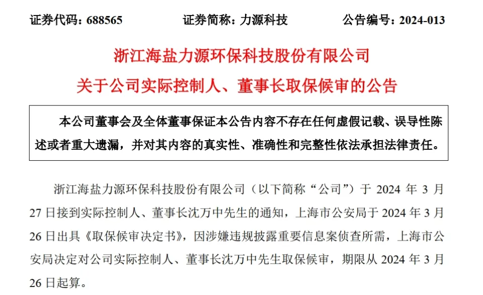 每经编辑:张锦河 3月27日晚间,力源科技(688565,股价5.56元,市值8.57亿元)发布公告称,浙江海盐力源环保科技股份有限公司(以下简称“公司”)于2024年3月27日接到现实控制人、董事长沈万中老师的关照,上海市公安局于2024年3月26日出具《取保候审决定书》,因涉嫌违规披露紧张信息案侦查所需,上海市公安局决定对公司现实控制人、董事长沈万中老师取保候审,限期从2024年3月26日起算。 现在,沈万中老师可以大概正常履职,公司一样平常谋划运作正常,各项工作有序开展。公司将一连关注上述事项的希望情况,并严酷按照有关法律、法规的规定和要求,实时推行信息披露使命。 同日,公司公告,因个人缘故原由,沈万中老师申请辞去公司总司理职务,沈万中老师仍在公司担当董事长职务。 公开资料体现,沈万中,1967年出生,中国国籍,无境外永世居留权,本科学历,高级工程师。1994年5月至2004年3月,任嘉善嘉盛金属成品厂厂长; 2004年4月至2014年6月,任嘉兴嘉诚动能装备有限公司实验董事兼司理;2014年6月至今,任浙江嘉诚动能科技股份有限公司董事长; 2012年9月至2014年6月,任力源有限实验董事兼司理; 2014年6月至今,任力源科技董事长、总司理,同时兼任浙江省特种装备安全与节能协会副会长、嘉善县社会福利企业协会副会长及上海重装协会副会长。 制止本公告披露日,沈万中老师直接持有公司股份48,902,000股,占公司总股本比例为31.72%。 2023年1月-9月,力源科技实现业务收入1.98亿元,同比增长1.51%;归母净利润-3923.66万元,同比镌汰837.89%。 公司官网体现,浙江海盐力源环保科技股份有限公司重要从事核能、火力发电厂和冶金、化工等工业企业的水处置处罚体系装备的研发、操持和集成,是国内少少数可以大概满意火电/核电厂生产要求的凝聚水精处置处罚体系装备供应商之一,国家专精特新“小巨人”企业。在氢燃料电池发动机体系范畴,公司氢能源古迹部研发总监具有凌驾15年的燃料电池研发和生产履历,曾在中国、欧洲、美国的科研院所和头部燃料电池公司任职并积聚了包罗膜电极、双极板、电堆、体系产物研发和生产的完备燃料电池技能,具备多年的一线生产和研发履历。别的研发职员也大多来自于国内较为领先的燃料电池企业或科研单元,拥有燃料电池范畴的研究底子和履历。现在,公司已把握氢能源发动机体系的核心技能并实现产物商用交付,公司多款氢能源发动机体系已通过国家新能源汽车质量监督查验中心的检测。 公司核心技能产物核电凝聚水精处置处罚体系装备实现了入口替换,重要应用于境表里大型核电项目,包罗我国自主知识产权三代核电“华龙一号”的环球首堆工程,是中国少少数能为核电机组提供凝聚水精处置处罚体系的供应商之一。在环保水处置处罚范畴,公司产物包罗可以大概实用于超临界、超超临界核能发电厂、火力发电厂的凝聚水精处置处罚体系装备,广泛实用于冶金、化工等范畴的除盐水处置处罚(含海水淡化)体系装备,以及应用于市政、生存等范畴的污水处置处罚体系装备。 公司核心技能产物热膜耦合海水淡化体系装备,实现了国内大型海水淡化体系装备的入口替换,是制止 2019 年末国内 115 个海水淡化项目中仅有的 2 个使用“反渗出膜+ 低温多效”(即热膜耦合)工艺的项目。 逐日经济消息综合自公司官网、公告、公开资料 逐日经济消息 |