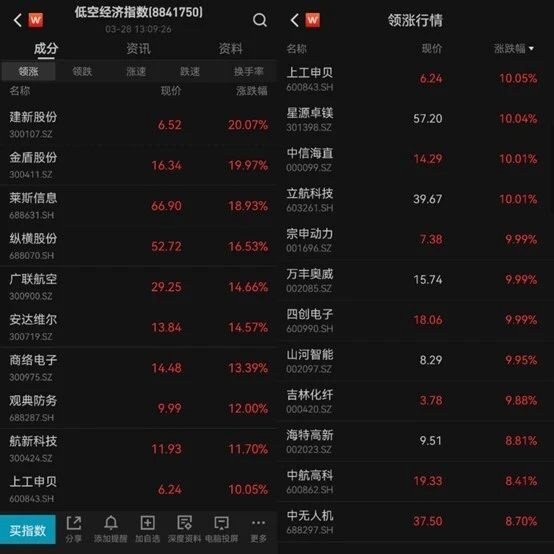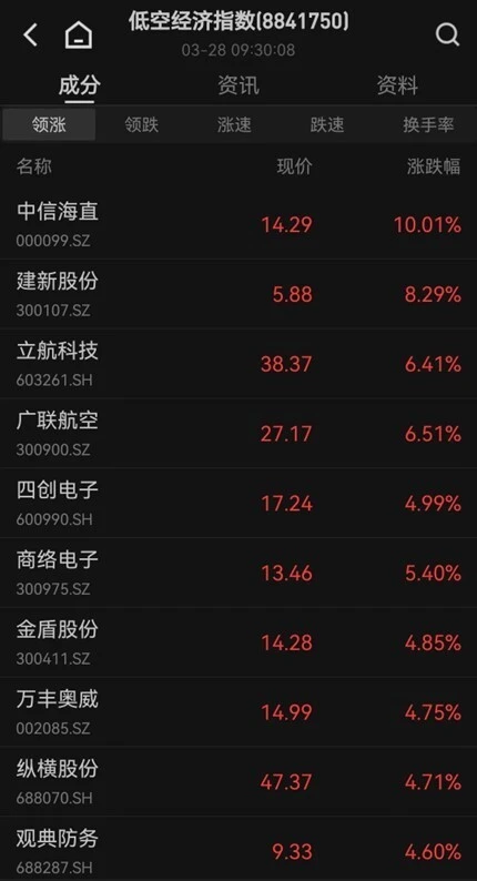 本日,A股三大指数开盘涨跌不一,沪指低开0.15%,深成指低开0.01%,创业板指高开0.04%。 低空经济概念股高开高走,深城交、卧龙电驱、万丰奥威、中信海直、四创电子、立航科技、烽火电子等10余股涨停,金盾股份、莱斯信息等涨超10%。 图片泉源:Wind 消息上,工信部等四部分发布《通用航空装备创新应用实行方案(2024-2030年)》,推进电动垂直起降航空器(eVTOL)等一批新型消耗通用航空装备适航取证。 别的,民航局定于3月29日15:00举行消息发布会,约请干系负责人先容民航局落实中央经济工作会媾和政府工作陈诉精力推进低空经济发展所做工作及下一步思量、比年来通用航空改革发展情况、比年来无人机发展情况及民航局开展的干系工作,并答记者问。 食品、乳业板块开盘领跌,品渥食品跌超9%,盖世食品、熊猫乳品、惠发食品、三只松鼠等多股低开。 卫星导航概念股开盘拉升,恒宇信通、烽火电子、华体科技涨停,纵横股份、神剑股份、四川九洲等跟涨。 环保板块早盘拉升,雪迪龙涨停,复洁环保、聚光科技、青达环保、中兰环保、华控赛格等跟涨。 图片泉源:Wind 消息面上,3月27日,生态情况部召开消息发布会,干系负责人表现,下一步,将连续深化生态情况科技体制改革,协同推进降碳、减污、扩绿、增长,以生态情况科技创新助力改善生态情况质量和漂亮中国创建。 银行板块早盘下挫,光大银行跌超7%,瑞丰银行、农业银行、交通银行、工商银行、创建银行等跟跌。 图片泉源:Wind 消息面上,光大银行3月27日晚间公布的2023年业绩陈诉表现,该行客岁实现归属于该行股东净利润407.92亿元,同比降落8.96%,此中第四序度单季净利润同比减62.24%。 铜缆高速毗连概念股震荡走高,吴通控股涨超15%,瑞可达、金信诺、奥飞数据、长飞光纤等纷纷拉升。 呆板人概念股震荡反弹,南边精工、五洲新春双双涨停,日发精机涨超8%,中大力大举德、步科股份、丰立智能等跟涨。 AI手机、消耗电子板块震荡走高,易德龙涨停,京泉华一度触板,信音电子涨超10%,致尚科技、昀冢科技、光弘科技跟涨。 天风国际证券分析师郭明錤曾在研究陈诉中猜测,假如如今手机市场库存回补需求的强劲态势连续至2024年上半年,华为P70系列整年的出货量有望实现同比增长230%,到达1300万至1500万部。 算力、液冷服务器概念股连续走高,海潮信息涨停,杰创智能涨超7%,紫光股份、锐捷网络、拓维信息跟涨。 图片泉源:Wind 午间休盘,A股三大指数团体上涨,沪指涨1.09%,深成指涨2.1%,创业板指涨1.88%。 低空经济概念午后继承发作,板块指数大涨超9%,建新股份、深城交、金盾股份、蓝海华腾均20cm涨停,神剑股份、四川九洲、中信海直、万丰奥威等近20股封板,莱斯信息、纵横股份、广联航空、商络电子等十余股涨超10%。 图片泉源:Wind 房地产板块震荡拉升,京投发展走出5连板,空港股份涨超7%,西藏城投、大龙地产、张江高科等跟涨。 本日收盘,A股三大指数团体上涨,沪指涨0.59%重回3000点上方,深成指涨1.31%,创业板指涨0.95%;北向资金净买入23.35亿元。 图片泉源:Wind 关注获取更多资讯 |