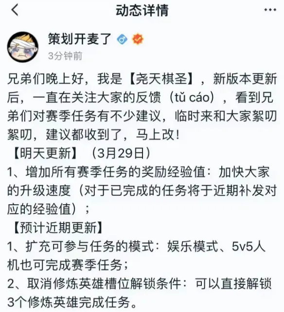 王者光彩自公测到如今已经七年多,如今也上线了100多个豪杰,五百多个皮肤,信任各人对于这款游戏也都非常熟悉了。而在28号,S35赛季也正式开启了,新赛季的开启,也陪伴了许多的改动,此中就包罗了峡谷、豪杰和部分活动等等。 我们都知道,每次新赛季开启之后,都会有新的赛季皮肤同步上线,而S35赛季的赛季皮肤终极由刘邦得到,取名剑破天穹,这款皮肤和以往的赛季皮肤差不多,在殊效方面都不出众,不外作为免费得到的皮肤,各人也不消有太高的渴望了。 信任各人也都知道,获取赛季皮肤的方式非常简朴,最开始的时间,只须要排位赛到达黄金段位就能免费领取了,而后又改成了历练值到达100点就能免费领取了,然而在S35赛季,赛季皮肤的获取方式再次发生了改变。 赛季任务酿成了须要到达10级才华领取到S35赛季的赛季皮肤,刘邦的剑破天穹了,每级须要200点履历,而且新增了修炼任务,每个赛季最多可以选择3个修炼豪杰,利用修炼豪杰举行排位赛、顶峰赛、5V5匹配时,可以积聚修炼任务所需场次,完成修炼任务可得到赛季专属嘉奖,而且选择修炼豪杰之后,就不可以更改了。 简朴来说,就是你在某个位置打满50场可以得到1200点履历,剩下的600点则须要用修炼豪杰去累积了,而最简朴的方法就是利用三个修炼豪杰去打满30场才华拿到赛季皮肤了,如许的难度,想要短时间内拿到赛季皮肤,也险些是不大概了。因此新的赛季任务刚刚上线,也引发了网友们的热议,太难了!有玩家更是构造了五排六分投的玩法,不得不说,玩家们为了一个赛季皮肤,也是蛮拼的。 而在收到玩家们的反馈之后,王者官方也是告急作出了回应:1、增长全部赛季任务的嘉奖履历值,加快升级速率(29号更新);2、扩充任务模式:娱乐模式、5v5人机;3、取消修炼豪杰槽位解锁条件:直接解锁3个修炼豪杰完成任务。等这些条件同步到正式服之后,刘邦的赛季皮肤剑破天穹也将能更快得到了。 如今S35赛季已经开启了,话说,小搭档们,你们有多少人拿到刘邦的赛季皮肤了呢?欢迎留言讨论! |