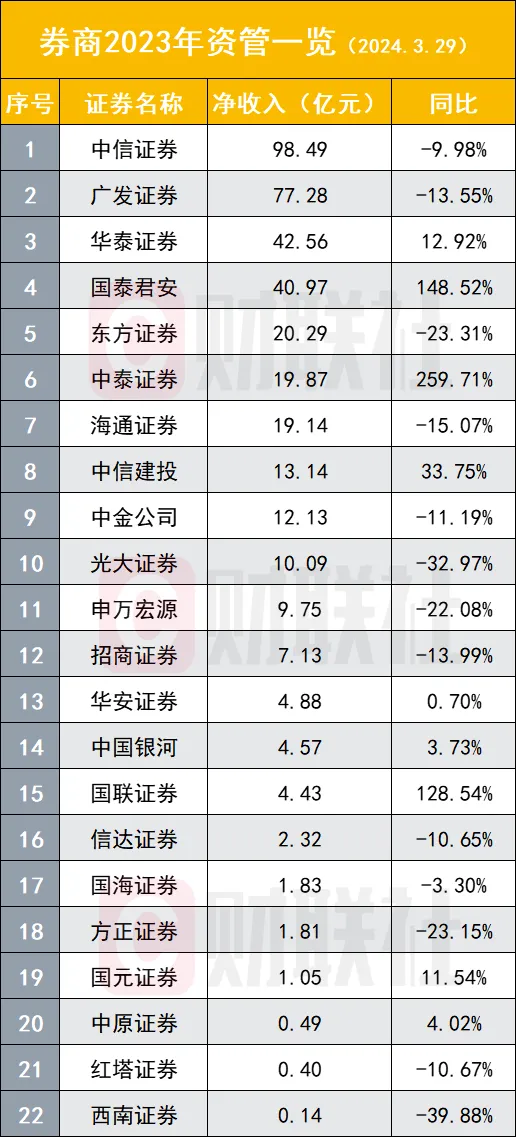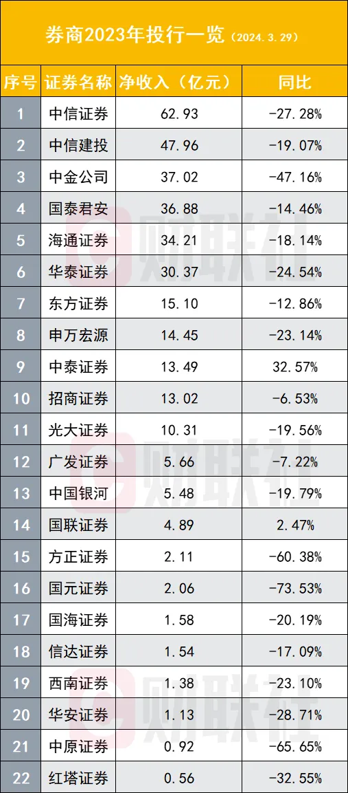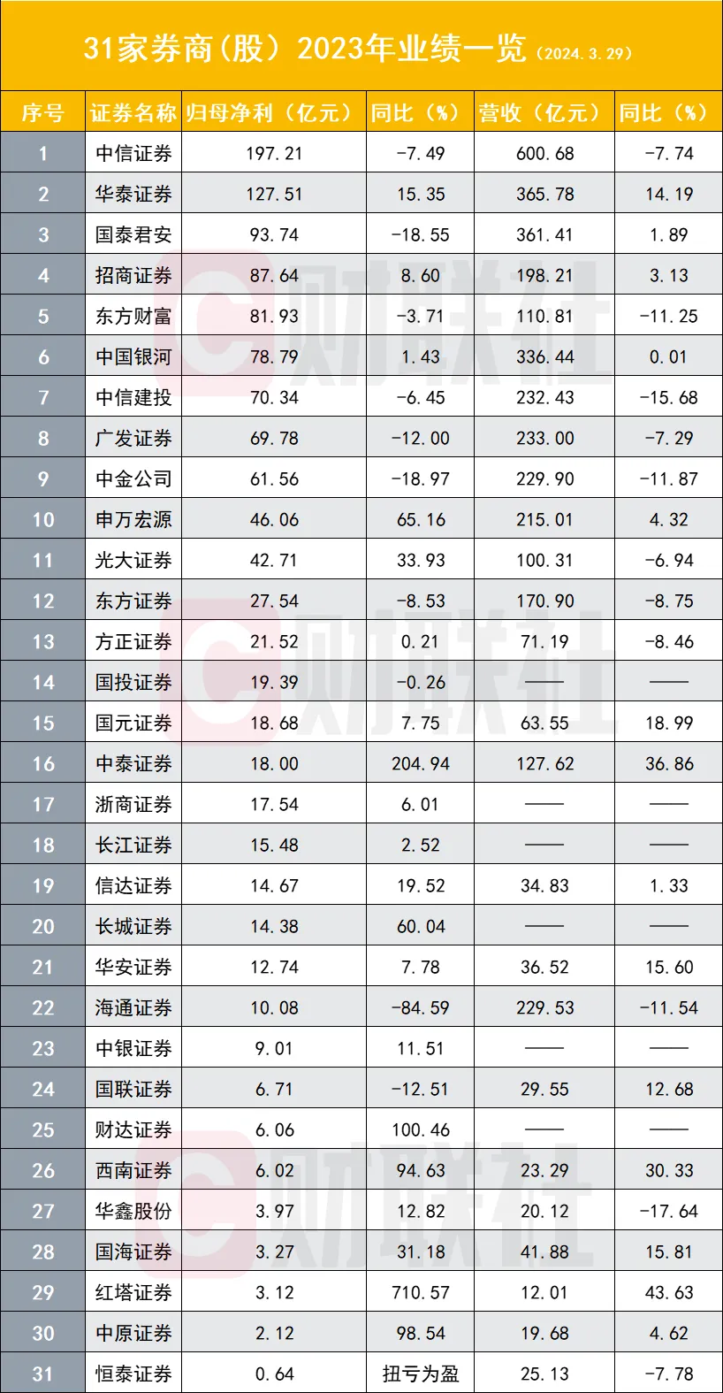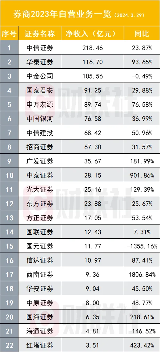 财联社3月30日讯(记者高艳云)券贸易绩的面纱正在渐渐打开。停止3月29日,已有25家A股券商股或上市主体以及1家港股券商恒泰证券披露年报,叠加此前已披露精确净利数据的券商股,总计有31家主体披露业绩,此中头部券商已悉数披露,行业团体体现已较为清晰。 31家券商中21家券商净利增速为正,2023年归母净利排名前十券商依次是中信证券(197.21亿元)、华泰证券(127.51亿元)、国泰君安(93.74亿元)、招商证券(87.64亿元)、东方财产(81.93亿元)、中国银河(78.79亿元)、中信建投(70.34亿元)、广发证券(69.78亿元)、中金公司(61.56亿元)、申万宏源(46.06亿元)。 自业务务依然是券贸易绩的关键“胜负手”,占比86.36%券商增速为正,多家头部券商自业务务高增长,包罗华泰证券(93.65%)、申万宏源(76.58%)、中信建投(50.96%)、广发证券(181.99%)等。 经纪、投行、资管沦为“其他”,尤其是前两个业务体现较差,22家可比数据券商中经纪业务同比增速无一为正,投行业务则仅有2家增速为正,资管业务体现略好,四成券商资管业务增速为正。 七成券商增速为正 就头部券商而言,华泰证券、招商证券、申万宏源是3家营收净利润均保持增长的券商,此中华泰增速较大。 2023年,华泰证券实现归母净利127.51亿元,同比增长15.35%,营收365.78亿元,同比增长14.19%; 招商证券实现归母净利87.64亿元,同比增长8.6%,营收198.21亿元,同比增长3.13%; 申万宏源实现归母净利46.06亿元,同比增长65.16%,营收215.01亿元,同比增长4.32%。 值得关注的是,头部券商的“顶流”中信证券归母净利小幅下滑7.49%,“券茅”东方财产微幅下滑3.71%,别的,国泰君安下滑18.55%,中信建投下滑6.45%,其他排名靠后的头部券商亦有差别幅度下滑。 就31家券商团体而言,归母净利增速为正的有21家,占比为67.74%。增速最大的5家券商分别是红塔证券(710.57%)、中泰证券(204.94%)、财达证券(100.46%)、中原证券(98.54%)、西南证券(94.63%)。 自业务务成关键“胜负手” 如同往年,自业务务是券商客岁业绩体现的关键影响因素,22家可比数据券商中,自业务务增速为正的高达19家,占比86.36%。 头部券商中,自业务务保持同比高增速的有华泰证券(93.65%)、申万宏源(76.58%)、中信建投(50.96%)、广发证券(181.99%),别的5家头部券商也保持了不低的自营增速,分别是中信证券(23.87%)、国泰君安(29.88%)、中国银河(36.99%)、招商证券(31.57%)。别的,自业务务排名稍靠后的中泰证券扭亏为盈,同比增速高达901.86%,光大证券为129.39%。 别的,客岁自业务务净收入增速凌驾一倍以上的还包罗西南证券(1806.84%)、红塔证券(423.42%)、国海证券(218.61%),低基数成为上述券商自业务务增速“浮夸”的重要缘故因由。 相反,自业务务下滑的券商成为“异类”,此中有3家券商客岁自业务务同比增速下滑。 经纪业务、投行业务等一度沦为“其他”,这两大业务客岁团体体现较差。 22家数据可比券商中,经纪业务同比增速无一为正,即便是头部券商也出现团体下滑。 2023年经纪业务净收入排名前十券商依次是中信证券(102.23亿元)、国泰君安(67.90亿元)、华泰证券(59.59亿元)、广发证券(58.10亿元)、中信建投(55.63亿元)、招商证券(55.31亿元)、中国银河(55.02亿元)、中金公司(45.30亿元)、申万宏源(43.34亿元)、海通证券(38.30亿元)。 22家可比数据券商中,仅有2家券商投行业务增速为正,分别是中泰证券(32.57%)、国联证券(2.47%)。头部券商亦未能幸免,以该业务收入排名前两名券商中信证券与中信建投而言,两券商客岁投行业务净收入分别下滑27.28%、19.07%。 2023年投行业务收入排名前三券商分别是中信证券(62.93亿元)、中信建投(47.96亿元)、中金公司(37.02亿元)、国泰君安(36.88亿元)、海通证券(34.21亿元)、华泰证券(30.37亿元)、东方证券(15.10亿元)、申万宏源(14.45亿元)、中泰证券(13.49亿元)、招商证券(13.02亿元)。 并购重组业务被广泛以为是IPO业务紧缩下的投行突破口,中金公司在该业务已有所体现。据Dealogic数据,中金公司业务继承位列中国并购市场首位。2023年,公司已公告并购买卖业务70宗,涉及买卖业务总额约690.56亿美元,此中境内并购买卖业务56宗,涉及买卖业务总额约516.42亿美元,跨境及境外并购买卖业务14宗,涉及买卖业务总额约174.13亿美元。 资管业务方面,22家可比数据券商中,9家客岁资管业务净收入同比增速为正,占比为40.91%,此中有3家增幅翻倍,分别是国泰君安(148.52%)、中泰证券(259.71%)、国联证券(128.54%)。 国泰君安称,重要是由于陈诉期华安基金作为子公司整年纳入归并范围,客岁同期仅归并其2个月的收入;中泰证券称,重要为陈诉期归并万家基金,其收入纳入归并报表。 2023年资管业务净收入排名前十券商依次是中信证券(98.49亿元)、广发证券(77.28亿元)、华泰证券(42.56亿元)、国泰君安(40.97亿元)、东方证券(20.29亿元)、中泰证券(19.87亿元)、海通证券(19.14亿元)、中信建投(13.14亿元)、中金公司(12.13亿元)、光大证券(10.09亿元)。 东莞证券研报称,自业务务是行业业绩增长重要驱动力,2023年A股市场体现好于客岁同期,低基数效应下2023年自业务务实现规复性增长,是业绩增长的重要驱动力。 海通国际同样以为,2023年上市券贸易绩增长的重要缘故因由是权益市场体现好于2022年,自业务务有所改善。 现在,另有25家上市券商未披露正式年报,哪些券商将会在4月带来业绩惊喜,值得关注。 (财联社记者 高艳云) |