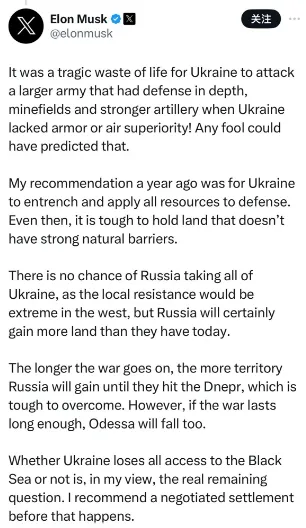 据新华社报道,乌东部最大发电厂、位于哈尔科夫州的兹米耶夫火力发电厂已在俄军22日的导弹打击中被摧毁。俄方现在尚未对此作出回应。 别的,乌克兰国家通讯社当地时间31日破晓报道说,乌克兰全境拉响防空警报。乌克兰空军司令部31日破晓发布消息称,监测到俄军图-95战略轰炸机运动以及导弹威胁。今后不久,乌空军司令部称,部分导弹飞向乌克兰西部地区,包罗伊万诺-弗兰科夫斯克以及利沃夫等地。 对于干系说法,俄罗斯方面现在没有回应。 乌东部最大发电厂被摧毁 中新网消息,《基辅独立报》当地时间30日援引乌克兰能源公司消息,乌东部最大发电厂、位于哈尔科夫州的兹米耶夫火力发电厂已在俄军22日的导弹打击中被摧毁。据报道,当地官员体现,俄罗斯加强了对乌克兰关键底子办法的导弹和无人机打击,摧毁了哈尔科夫州的全部变电站和一座火力发电厂。 陈诉称,俄军导弹打击导致兹米耶夫火力发电厂全部装备受损,大部分装备已无法利用。现在还无法正确评估装备受损水平、修复所需时间和资金数额。 乌能源部长加卢先科在查抄发电厂受损环境时体现,乌能源部将动员统统资源资助发电厂规复运行。 据央视消息,当地时间3月29日,乌克兰空军司令奥列修克在交际平台上发布消息称,当天破晓,乌防空队伍摧毁84个空中目标。俄军对乌克兰燃料和能源部分底子办法发动大规模打击,动用39枚各型导弹和60架攻击型无人机,乌防空队伍摧毁此中58架攻击型无人机和26枚导弹。 乌内务部长克利缅科当天体现,俄军当天破晓用导弹和无人机打击该国10个地区,导致多处能源底子办法、私家住宅等受损,造成6人受伤。 乌总理什梅加尔在交际平台上体现,俄军当天对乌发动大规模打击导致第聂伯罗彼得罗夫斯克州、文尼察州、伊万诺-弗兰科夫斯克州等6个地区的能源底子办法受损,部分地区实行告急断电步调。 马斯克发起乌尽快会商 “傻瓜都能预推测”反攻悲剧结果 埃隆·马斯克3月31日突然在交际媒体发文品评俄乌局面,引发关注。3月31日,马斯克在交际媒体X发文写道:“在缺乏装甲或空中上风环境下,乌克兰攻击一支拥有纵深防御、雷区和更强盛火炮的更强雄师队,这是在悲剧性地浪费生命!任何傻瓜都能预推测这一点。” 截图自马斯克交际账户 “一年前,我曾发起乌克兰防守并将全部资源用于防御。即便云云,要守住没有坚固天然屏蔽的地盘还是很难。” 马斯克说:“战争一连的时间越长,俄罗斯得到的国土就会越多,直到他们推进到第聂伯河为止,第聂伯河很难越过。然而,如果战争一连时间富足长,敖德萨也会陷落。在我看来,乌克兰是否会失去全部通往黑海的通道才是真正标题。我发起在此之前通过会商办理标题。” 值得注意的是,据参考消息网,俄新社3月30日报道,乌克兰总统泽连斯基初次体现,纵然不规复1991年的乌克兰界限,莫斯科和基辅也可以开始清静会商,现在他品评的是2022年的俄乌界限。 然而眼下泽连斯基在继承美国哥伦比亚广播公司消息部的采访时说,如果乌克兰能规复2022年特殊军事办法开始前的界限,俄罗斯就将“乐意对话”。报道引用泽连斯基的话说:“我们不必通过纯军事本事来夺回全部国土。我信托,当他(俄罗斯总统普京)失去从2022年起夺走的东西时,他就乐意对话了。” 编辑|王月龙盖源源 校对|段炼 逐日经济消息综合自新华社、央视消息、参考消息、公开信息 逐日经济消息 |