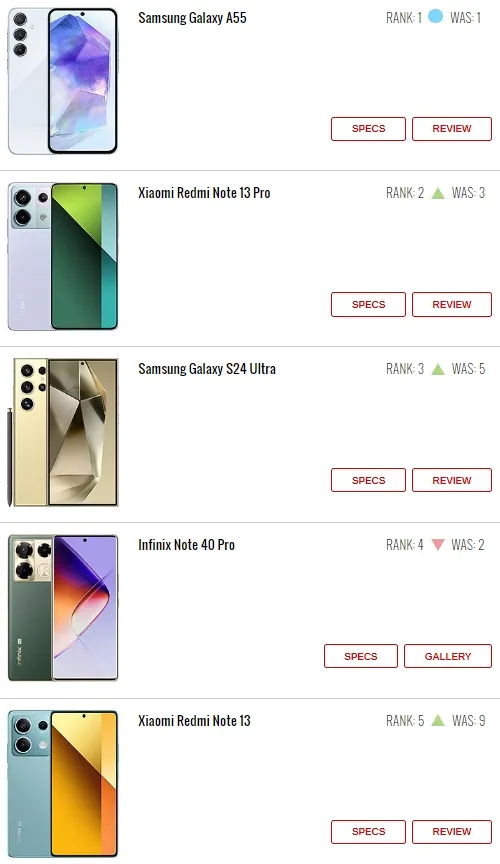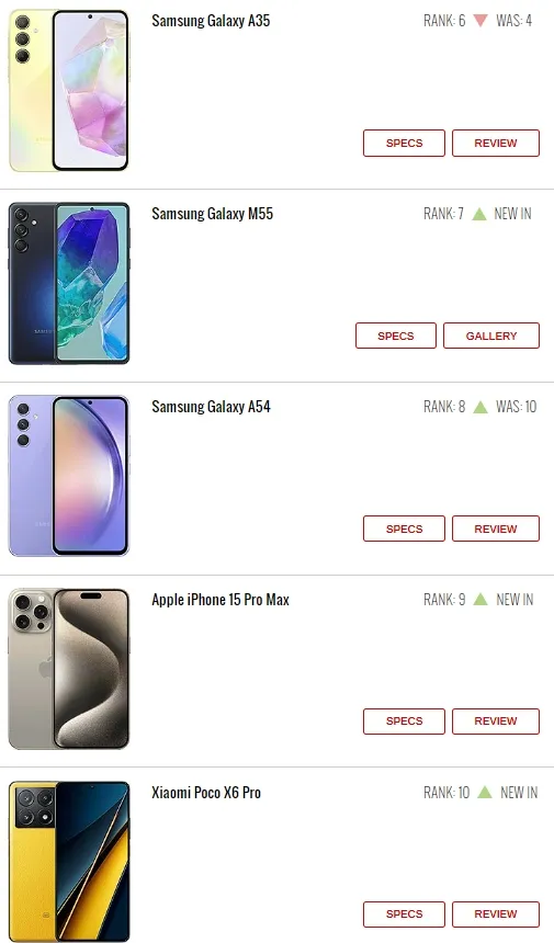 【CNMO科技消息】4月1日,CNMO相识到,外媒GSMArena发布了最新一期的热门手机排行榜。在这份榜单中,三星再次显现其强大的气力,独占五席,稳坐领先职位。小米也不甘示弱,依附三款良好机型,乐成得到三席。同时,传音Infinix和iPhone亦依附各自的精彩表现,各有一款机型跻身前十之列。 详细来看,三星A55位居第一。新机配备了一块6.6英寸AMOLED表现屏,分辨率为1080×2340像素,支持最高120Hz革新率,高亮度模式(HBM)下可以到达1000尼特的峰值亮度;前置3200万像素摄像头,后置5000万像素广角摄像头+1200万像素超广角摄像头+500万像素微距摄像头的组合,支持OIS光学防抖、最高10倍数码变焦;内置5000mAh电池,支持25W充电功率。 紧随厥后的Redmi Note 13 Pro、三星S24 Ultra、传音Infinix Note 40 Pro、Redmi Note 13,分别排名第二、第三、第四、第五。这些机型在市场上也有着不俗的表现,深受斲丧者喜好。 别的,进入前十的另有三星A35、三星M55、三星A54、iPhone 15 Pro Max、小米Poco X6 Pro这五款机型,分别排名第六、第七、第八、第九、第十。 |