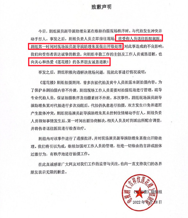 视频:《莲花楼》剧组打人变乱官方致歉!打人者已开除,成毅或将受牵连,时长约1分2秒 8月28日,娱乐圈再曝打人变乱,不外这次并不是哪个明星动粗,而是《莲花楼》剧组的工作职员在拍摄现场殴打了“代拍”(在剧组、机场等运动现场代粉丝拍摄偶像照片从而牟利的饭圈职业),敏捷登上热搜引发网友极大关注。 由于网上曝光的视频都是片断式的,以是现在还不清晰发生殴打变乱的具体缘故起因。但从视频画面来看,一名头戴玄色棒球帽的《莲花楼》剧组工作职员正在挥拳殴打一名代拍,而且挥拳相当用力。除了暴力殴打之外,该工作职员还不绝说脏话对其举行咒骂,举动非常恶劣。 在颠末多次被锤头、打脸之后,该代拍已显着受伤,鼻子里鲜血直流。眼见形势愈发不乐观,该代拍直接哀求现场其他职员资助,让各人帮助报警。 而在视频末了,《莲花楼》该工作职员还一度将代拍甩飞,将其重重摔在地上。幸好代拍受伤不严肃,本身尚能独自起立。 稍后,另一段殴打视频也被曝光,《莲花楼》工作职员将代拍职员重重压在城墙上,欲将其从城楼上丢下去。其举动相当恶劣,如果未被及时克制,恐将发生更严肃的变乱。 对于《莲花楼》工作职员殴打代拍一事,网友看后纷纷留言:“固然代拍不对,但真没须要打这么狠”“这不停打,太可骇了,打人就不对了吧”。 很快,被殴打职员就诊陈诉单被曝光,上面表现鼻骨右侧骨折,可以说是非常严肃了。 值得一提的是,自《莲花楼》开机以来,这已经不是第一次场务和代拍发生辩说了,之前一次恰好被身为主演的成毅碰上,当时一身古装出镜忙着拍戏的成毅变身热心市民将工作职员拉开,还一边奉劝“别打架”“别打架”。 由于《莲花楼》为成毅主演,以是很多账号在转发这条视频的时间都带上了成毅的话题,也让成毅一度受到牵连。 但粉丝们看后纷纷留言作出表明:“那也没须要带成毅超话吧,是剧组职员弄的”“想黑成毅大可不必”“听说已经报警了,那就交给警方处置惩罚吧,吃瓜群众也没法隔着网线断案”。 据悉,《莲花楼》这部剧由成毅、曾舜晞、陈都灵等领衔主演,于6月26日开机,而从《莲花楼》官微分享的最新动态来看,现在已经有部门演员告竣。 此前,网上还曝光过成毅等人拍摄路透照,照片中,成毅一袭白色古装出镜,帅气有气质,代入感十足。不外,现在在告竣之际却传出剧组打人的变乱,这部戏的宣发多多少少都会受到一些影响吧。固然,现在掖掖仪网上的一些爆料,至于原形怎样还是等候剧组的一个官方回应吧。 刚刚,《莲花楼》发布致歉声明,称打人者是演员副导演助理,当时未能控制住感情,产生了不良的影响,剧组已将受伤职员送往医院,并第一时间开除了打人者。声明中还非难了代拍和黄牛走漏该剧拍摄内容。 多说一句,即便真如爆料所言剧组工作职员打人,但与演员无关,以是各人还是理性吃瓜,不要伤及无辜! 【免责声明:文中图片泉源网络,如有版权请接洽删除】 |