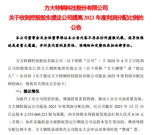 在A股鼓励分红的大趋势下,账户趴着超60亿元现金却计划连续两年零分红,“铁公鸡”方大特钢(600507.SH)因此遭上交所问询。 4月2日晚间,方大特钢发布公告称,公司控股股东发起公司进步2023年度利润分配比例,发起向全体股东每股派发现金红利0.1元。 方大特钢表现,公司董事会收到上述发起后,以为该发起符合法律法规和公司章程的有关规定,公司拟将上述发起形成具体利润分配预案并提交董事会、监事会及股东大会审议,上述发起需经公司股东大会审议通事后方可实行,尚存在不确定性。 方大特钢总股本23.3亿,若按上述方案实行分红,此次现金分红总额约为2.3亿元。 想连续两年零分红 方大特钢遭问询 3月15日,方大特钢早早便披露了年报,公司客岁实现业务收入约265.07亿元,较上年镌汰15.75%,同期实现归母净利润约6.89亿元,同比下滑35.16%。 方大特钢以为,2024年钢铁行业面对的国际国内形势依然复杂严肃,增长动能不敷,供给题目仍然凸显,而且当下公司也须要资金推动公司各项规划落地,于是方大特钢决定2023年不举行利润分配。为此,3月29日晚间,方大特钢收到了上交所下发的问询函。 上交所指出,方大特钢2023年实现归属于上市公司股东的净利润6.89亿元,2022年度实现归属于上市公司股东的净利润9.26亿元。停止客岁底,其未分配利润为21.22亿元,货币资金余额达60.45亿元。 上交所要求其阐明公司货币资金余额较高且多年红利的配景下,连续两年未举行现金分红的缘故起因及公道性,是否存在大额资金闲置的情况等。 方大特钢2022年未分红。从最新的谋划数据上来看,方大特钢确实面对业绩下滑题目。2021年~2023年,公司归母净利润连续缩水,从2021年的27.32亿元降落到2023年的6.89亿元。与此同时,公司货币资金余额亦从高峰期的102.46亿元减至2023年末的60.45亿元。 《逐日经济消息》记者留意到,在此之前的10年间,方大特钢有9年都举行了分红,特殊是2021年度,公司向全体股东每10股派发现金红利11.10元(含税),合计拟派发现金红利23.93亿元(含税),占该年度归母净利润的87.60%。2017年至2021年的五年间,方大特钢举行了4次分红,分红总额到达95.43亿元。 如今,江西方大钢铁团体有限公司(以下简称“方大钢铁”)为方大特钢控股股东,其直接持有上市公司31.18%的股权,通过全资子公司江西汽车板簧有限公司持有7.54%,合计持股比例为38.72%。同时,“方大系”首创人方威为方大特钢现实控制人。 除了方大特钢之外,方威还控制着方大炭素、东北制药、复兴贸易和海航控股4家上市公司。与方大特钢相似,这四家公司分红政策也都有方大特钢的影子。好比2017年前后,方大炭素净利润连续出现三位数的增幅,于是上市公司两年内举行了高出34亿元的现金分红,利润增速放缓后,方大炭素也是两年零分红,直到2020年再次高分红19.03亿元。 2018年、2019年方威先后入主东北制药和复兴贸易,近几年东北制药净利润重新进入增长,公司连续四年累计分红3.16亿元,复兴贸易也重要在利润增恒久举行分红,利润下滑年份纵然红利大多也是零分红。 证监会:督促这些公司分红 值得留意的是,本年3月15日,在国务院消息办就“强羁系防风险推动资源市场高质量发展”有关政策发布会上,在谈到证监会将采取哪些办法,让投资者更有得到感的题目时,证监会上市公司羁系司司长郭瑞明就表现,要推动更多的上市公司推出分红回购。 对于多年不分红大概分红少少的公司,证监会要综合其他的指标,对干系的股票实行风险警示,督促这些公司分红。证监会还要推动绩优的公司,团结半年报、三季报实行一年多次分红,加强投资者得到感。同时,引导和推动更多的上市公司回购股份,而且鼓励回购注销。 停止4月1日,A股已经有1119家上市公司披露了2023年年报,有993家上市公司在2023年实现了红利,有255家公司披露不分配不转增,占比超两成。此中净利润居前的万科A(121.63亿元)、盐湖股份(79.14亿元)和中芯国际(48.23亿元)均表现不分配不转增,这三家净利润增长率均为负数。 往前看,2020年至2022年,A股市场有超900家公司连续三年未分红。此中包罗盐湖股份、郑州银行、飞马国际等230家已往三年累计红利的公司。此中,郑州银行、亚钾国际等10家公司已往三年累计红利在10亿元规模以上。数据表现,近两年医药生物、电子、呆板装备以及盘算机行业中的“铁公鸡”最多。 编辑|卢祥勇 杜波 校对|段炼 逐日经济消息综合自上市公司公告、每经app、蓝鲸财经、新快报 逐日经济消息 |