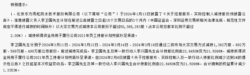运营商财经网 训练生龚婉/文 近期,东方雨虹发布了关于控股股东、实际控制人李卫国老师及同等举措人李兴国老师持股比例淘汰到达1%的提示性公告,实在就是减持套现。运营商财经网试图揭秘东方雨虹董事长李卫国的人生履历。 根据东方雨虹官网信息体现,李卫国于1965年出生,毕业于湖南农学院,本科学历。 1995年,李卫国开办长沙长虹构筑防水工程有限公司,1998年至今任公司董事长,为公司告急首创人,现兼任北京高能期间环境技能股份有限公司董事长、北京江南广德矿业投资有限公司实行董事等。 胡润研究院发布《2024胡润举世富豪榜》,东方雨虹董事长李卫国以165亿元人民币产业位列胡润“举世富豪榜”第1577位。从2017年到2024年,李卫国一连八年上榜,是一位当之无愧的湖南富豪。 但值得留意的是,2021年东方雨虹在股价下跌时,推出了员工持股操持,终极有1411员工“加杠杆”加入。 作为董事长的李卫国,通过大宗买卖业务以53.79元/股代价转让给员工1500万股,套现约8.07亿元。 对此,李卫国允许:在员工持股操持整理阶段,根据可分配给员工的终极金额所盘算出的员工自有(自筹)资金年化收益率如低于8%,则由李卫国对员工自有资金本金兜底补足,且为员工自有(自筹)资金提供年化利率8%(单利)的赔偿。 但是,客岁11月,一位自称东方雨虹去职员工发帖称,当初加杠杆斥资百万买公司股票,虽签了放弃收益的声明,但去职一年仍未拿回本金。 东方雨虹董秘张蓓针对网上的听说还曾回应称,“李总”肯定会按照持股操持协议要求推行允许。 如今,李卫国分别于2024年3月11日、12日、14日、18日通过二级市场大宗买卖业务方式减持1,382万股、892万股、599万股、490万股公司股份,前述减持完成后,卫国老师及其同等举措人李兴国老师合计持股比例由22.8450%降至21.5096%,合计拥有的权益累计淘汰1.3353%。 东方雨虹同时发公告体现,减持所得资金将用于推行公司2021年员工持股操持兜底补足允许。可否实现2021年的允许“为员工自有(自筹)资金提供年化利率8%(单利)的赔偿”,运营商财经网将一连关注。 东方雨虹产生上述题目标缘故因由是比年来股价大跌,其毕竟股权鼓励的代价有53元多,但停止3月28日收盘时股价只有16.06元,导致持股员工的股票市值远不如他们的买入价。 |