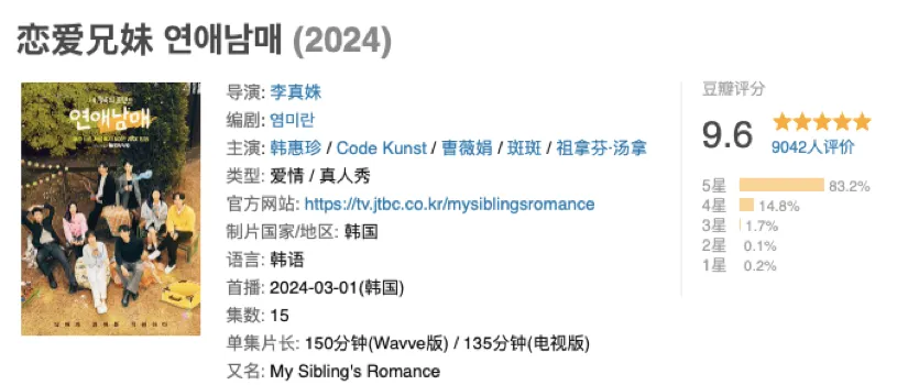 韩国爱情综艺一直以标准大著名,这几年出了不少令只身男女欢呼尖叫的作品。 好比,已经分手的恋人在《换乘爱情》的修罗场中相遇,当着前任的面与其他人擦出火花; 俊男靓女在荷尔蒙拉满的《只身即地狱》中拉扯摸索,张力十足; 尚有跨过爱情直接进入刺激婚后生存的《我们完婚吧》,个个标准违规。 这不,又出了一档亲生兄妹一起上爱情节目标综艺——《爱情兄妹》。 不要误会了,它并不是让亲生兄妹谈爱情,而是让他们在对外保密关系的情况下看相互找对象。 这个设定非常奇妙,对高朋们而言,在自己谈爱情的同时,还要做好伪装,须要时为手足的爱情奉上助攻。 对毫无知情的观众来说,嗑cp的快乐里还掺杂着推断兄妹关系的悬疑感。 这档噱头和希奇感拉满的综艺一上线立即在韩国引爆收视率,现在豆瓣评分9.6,评分和热度逾越了该节目制作人真姝的另一征象级作品《换乘爱情》。 节目组共约请了四对亲兄妹/姐弟,打乱次序先后进场。 率先辈场的是男一宰亨,颜值很高,孔刘平替。 松弛的他好奇地看遍了屋子后,玩起了自拍。 接着,女一世承推门而入,氛围变得玄妙了起来。 两人规矩地打着招呼,搏命找话题尬聊,如同刚晤面的生疏人般不知所措。 但实在,这两人是一对如假包换、从小打到大的兄妹! 刚晤面,妹妹世承就为敷衍了事的哥哥狠狠捏了一把汗,按照韩国的传统,哥哥应该在问候生疏人说敬语,没想到下意识说了平语。 不外由于两人演技精深,并没有人在意这个袒露关系的小细节。 接下来进场的三对兄妹,也各有各的反差和萌点。 不擅言辞的正燮是个姐控,从鄙视着大提琴家姐姐允荷一起拿奖,崇拜之情溢于言表。 气质出众的龙宇被以为欠好靠近,性格高冷,现实上在离异家庭中长大的他非常早熟体贴,尽努力掩护妹妹珠妍长大。 与龙宇兄妹的相处模式雷同的,尚有初雅和哲贤这对“美强惨”姐弟。 两人的对话隐晦地透袒露父亲家暴、母亲早逝的信息,当初姐姐初雅为了照顾病重的母亲一度放弃学业,比及弟弟在首尔扎根,才大胆寻求自己的生存。 四对兄妹上场完毕,好戏也随之登场,第一个送表明信的环节布满了各种搞笑桥段和偶合。 女高朋们必要根据自己的观察和推断,把手写表明信送到心仪男生的手足手里。 不出不测,帅气男高朋龙宇的妹妹珠妍收到了三位女生的表明信,这此中就有龙宇一见钟情的初雅。 然而现实上,初雅的心动男高朋并不是龙宇,她只是推断错误了兄妹/姐弟关系。 故意思的是,面对着三封字迹迥异的表明信,龙宇依附直觉拿到了初雅那一封,乐成约会。 短暂的相办事后,原来对龙宇无感的初雅渐渐产生了进一步交换的欲望,两人感情不停升温。 过程同样偶合的,尚有世承和正燮这一对,原来和初雅双箭头的正燮误打误撞与单向喜好的世承约会。 随着相识的深入,两人都有种相知恨晚的感觉。 与偶合相伴的尚有很多笑剧人时间,在发送心动短信环节,别人都是盼望与对方再次晤面,转达温暖信号。 只有世承的哥哥宰亨发了一条“谁吃了我的香蕉”信息,收信的女生一脸问号。 饭后休闲环节,各人纷纷走到院子活动,只有宰亨与各人隔窗相望,丝毫没有活动的欲望。 终于等他想打羽毛球时,还没打两下又滑倒在地上,为了不延长各人,他独自前去医院就诊,人送称呼“脆皮少爷”。 一天折腾下来,游离于团队之外的宰亨喜提妹妹口中的“0票男”称呼。 最搞笑的还是宰亨的妹妹世承,当其他女高朋把造作自拍的宰亨误以为新的男高朋时,世承搏命压住心田对哥哥的嫌弃和讽刺,用尽毕生演技附和着各人。 固然节目主打爱情,但由于引入了亲兄妹的设定,雌竞雄竞以致狗血的剧情大大镌汰,出现出和已往标准超大的恋综完全差异的画风。 比起猜疑、渴望关注和盘算自己的民气胸,亲兄妹一起上恋综更多的是相互关心与爱护。 当各人发送完心动短信陶醉在甜蜜的氛围中,正燮得知了无人对姐姐允荷心动的信息时,心情刹时坠到了谷底。 复杂的感情中有难以置信,也混合着对在场男高朋的不满,但更多的还是对姐姐的担心。 面对着镜头时,正燮表现甘心自己没有人选择,也不盼望姐姐受到伤害。 兄妹之间的友谊始终贯穿着节目,当各人翻着自己的发展相册时,末了一封来自手足的先容信弄哭了每一个人。 在别人眼里,哥哥龙宇大概是一个理性阳光的人,但在妹妹珠妍心田,哥哥总是善于伪装,从很小年岁开始他就故意识地克制心田的痛楚和感性,把快乐和笑容留给别人。 对此,珠妍感到愧疚,假如没有哥哥,她不大概拥有一个布满爱意、无忧无虑的童年。 看上去很佛系的宰亨也有数解对着妹妹流袒露爱意,他称呼妹妹像“从蒸笼里拿出的包子一样白白的”,自大地夸耀着妹妹取得的效果。 值得一提的是尚有节目中相称松弛的亲子线,几对兄妹们入住的第一天,各自的家长们都预备好了小菜送到现场,让各人一起分享。 聚餐竣事后,世承爸妈还专门打过电话来问候孩子,如同朋侪般关心和挂念。 节目中放出的布满着欢声笑语的家庭录像和父母访谈,也刹时把观众拉回到了一个爱意汹涌的家庭乌托邦里,恣意绪受同等温馨的亲情氛围。 最让人印象深刻的还是幼年时履历父母离异的龙宇,在谈到脱离的父亲时他竟然没有一句悔恨,反而朴拙地祝福对方,云云开阔的性格与他心田丰盈富足的爱意有关。 正如网友所说的那样,“纵然没有收到爱