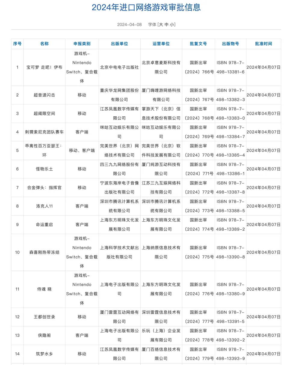 2024年第二批入口游戏版号公示,《宝可梦 走吧!伊布》《乖离性百万亚瑟王:环》《洛克人11》等14款游戏过审,此中包罗多款国行NS游戏,如《宝可梦 走吧!伊布》《森喜刚热带冻结》《侍魂 晓》。 |
