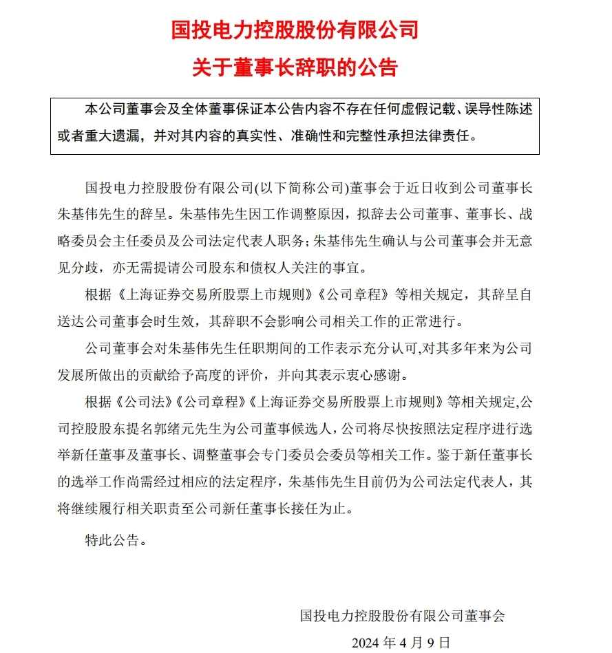 每经编辑:张锦河 4月9日晚间,国投电力(SH600886,股价15.09元,市值1124.8亿元)发布公告称,公司董事会于克日收到公司董事长朱基伟老师的辞呈。朱基伟老师因工作调解缘故原由,拟辞去公司董事、董事长、战略委员会主任委员及公司法定代表人职务;朱基伟老师确认与公司董事会并偶尔见分歧,亦无需提请公司股东和债权人关注的变乱。 根据《上海证券生意业务所股票上市规则》《公司章程》等干系规定,其辞呈自送达公司董事会时见效,其辞职不会影响公司干系工作的正常举行。 公司董事会对朱基伟老师任职期间的工作体现充实承认,对其多年来为公司发展所做出的贡献给予高度的评价,并向其体现衷心感谢。 根据《公司法》《公司章程》《上海证券生意业务所股票上市规则》等干系规定,公司控股股东提名郭绪元老师为公司董事候选人,公司将尽快按照法定步调举行推举新任董事及董事长、调解董事会专门委员会委员等干系工作。鉴于新任董事长的推举工作尚需颠末相应的法定步调,朱基伟老师如今仍为公司法定代表人,其将继续推行干系职责至公司新任董事长接任为止。 据国投团体官网此前消息,3月14日,国家开发投资团体有限公司召开领导班子(扩大)集会,决定朱基伟同道任国家开发投资团体有限公司副总司理、党构成员。 图片泉源:国投团体官网 国投团体官网“管理团队”一栏体现,朱基伟信息已更新。 图片泉源:国投团体官网 公开信息体现,朱基伟,男,大学本科,工程师。历任厦门中原国际电力发展有限公司总司理、党委书记,国投电力控股股份有限公司总司理、党委副书记,国投电力控股股份有限公司董事长、党委书记。 2023年前三季度,国投电力营收425.49亿元,同比增长11.47%;归属于上市公司股东的净利润约60.52亿元,同比增长46.7% 1月12日晚间,国投电力发布业绩预报,预计2023年度实现归属于母公司全部者的净利润57.23亿元到68.6亿元,与上年同期追溯调解前相比,将增长16.44亿元到27.81亿元,同比增长40.29%到68.16%。与上年同期追溯调解后数据相比,将增长16.45亿元到27.82亿元,同比增长40.35%~68.24%。业绩变动重要缘故原由是,陈诉期内,公司电量等同比增长,售电收入增长。 公司官网体现,国投电力控股股份有限公司(简称国投电力)是国家开发投资团体有限公司(简称国投团体)的控股企业,是国投的电力业务投资平台。 国投团体创建于1995年,是中央直接受理的国有告急骨干企业,2022年6月正式转为国有资源投资公司。国投注册资源338亿元,制止2023年末,团体资产总额8383亿元,员工约5万人。2023年团体实现业务总收入2140亿元,利润总额252亿元。 国投团体拥有全资及控股子公司17家,全资及控股投资企业477家,此中包罗9家控股上市公司,在资源市场上形成了有肯定影响力的“国投”品牌。 国投电力是国家开发投资团体有限公司的控股企业,创建于1996年,已在上海和伦敦两地上市。公司注意科技创新,多次得到中国土木工程詹天佑奖、国家科学技能进步二等奖、中国电力优质工程奖、天下企业文化良好结果奖、菲迪克工程项目奖等殊荣。 国投电力拥有投资企业100多家,员工约9000人,业务涉及水电、火电、光伏、陆上风电、海上风电、储能、售电及综合能源服务等范畴,项目分布于中国23个省、市、自治区以及“一带一起”沿线及OECD沿线的5个国家。 公司装机布局以干净能源为主,电源布局精良,如今已投产控股装机容量约4089万千瓦,干净能源占比69%,此中,水电总装机2128万千瓦,占比约52%,风电、光伏装机约699万千瓦,占比17%;火电总装机1251万千瓦,占比31%。如今公司在建及拟建的电力项目总装机容量高出3000万千瓦,此中新能源超1000万千瓦、水电及抽水蓄能超1000万千瓦,别的尚有部分高效火电项目。公司总资产约2700亿元。 制止9日A股收盘,国投电力股价上涨0.20%。 逐日经济消息综合自国投电力官网、国投团体官网、公开信息 |