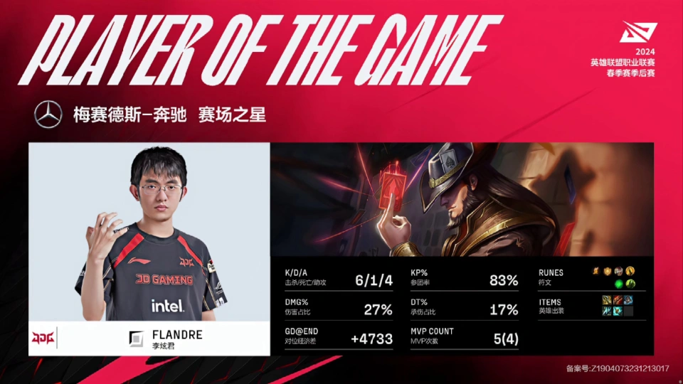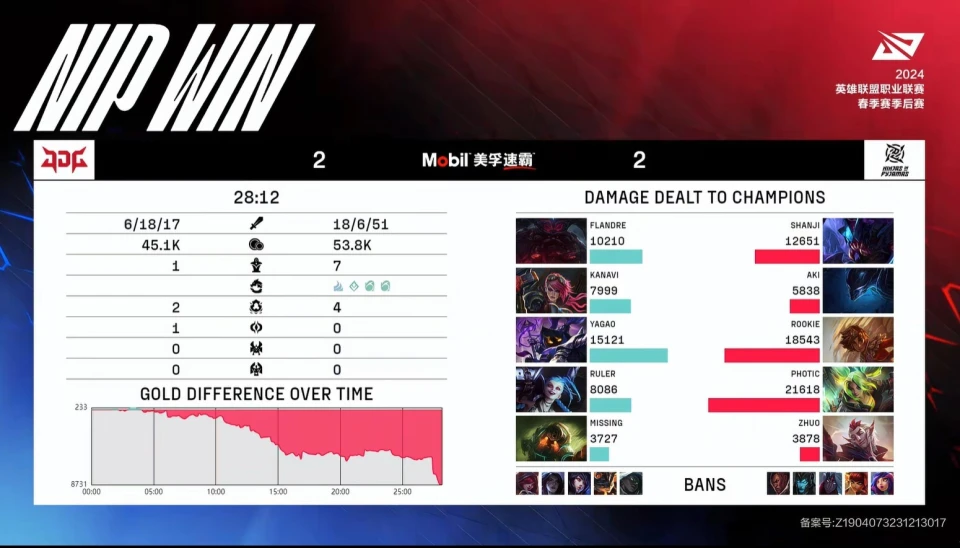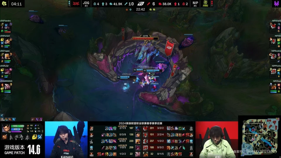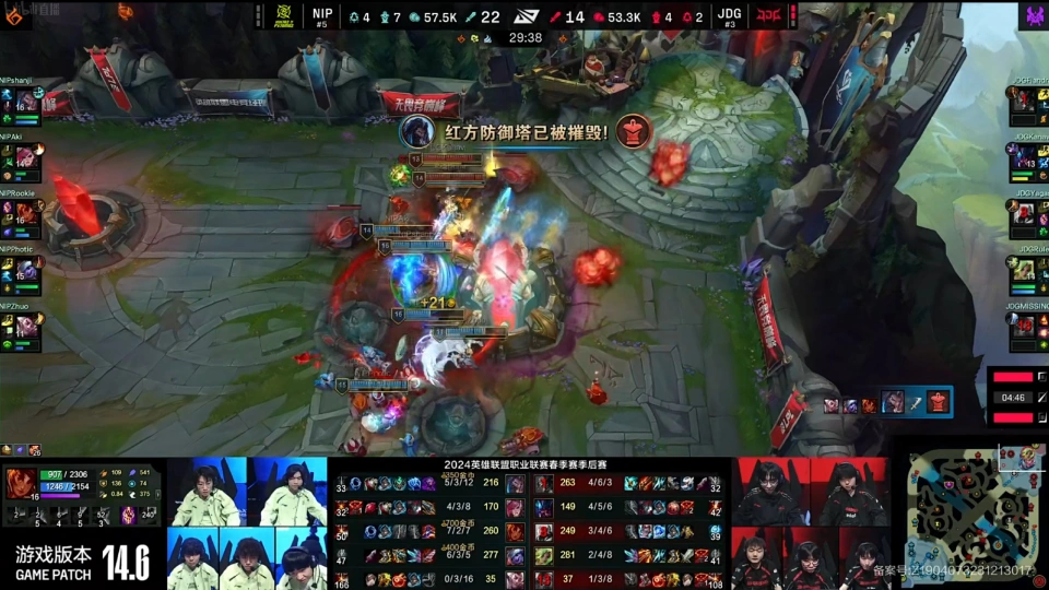 LPL春季赛季后赛败者组JDG和NIP的比赛,两边大战5局之后,JDG以3-2的战绩镌汰NIP,晋级败者组决赛! 第一局JDG上单发掘机,打野蔚,中单沙皇,下路滑板鞋加艾希;NIP上单乌迪尔,打野赵信,中单岩雀,下路金克丝加泰坦。开局NIP上下路换线,shanji乌迪尔在下路被越塔击杀,kanavi蔚拿下了一血。3分钟Aki赵信在野区单杀kanavi蔚。6分钟NIP推掉了上路一血塔。前期两边经济根本持平。中期22分钟两边夺取小龙,NIP完善拉扯,photic金克丝收割,NIP击杀JDG四人后,拿下第一条大龙。23分钟JDG拿下听牌龙。28分钟JDG拿下风龙魂。后期30分钟zhuo泰坦在中路被击杀后,JDG拿下第二条大龙。31分钟photic金克丝在中路被开到,JDG直接越塔击杀NIP三人后,拿下第一局的胜利。首局Ruler滑板鞋打出全场最高伤害。 第二局NIP上单狗头,打野猪妹,中单岩雀,下路韦鲁斯加艾希;JDG上单卡牌,打野贾克斯,中单扇子妈,下路泽丽加泰坦。5分钟Aki猪妹抓上,击杀圣枪哥卡牌,山鸡狗头拿下了一血。12分钟kanavi贾克斯抓上,越塔击杀山鸡狗头,JDG推掉了上路一血塔。前期JDG经济领先1K。中期18分钟两边中路混战,NIP开团失败,JDG反手开团,但是Rookie岩雀抬到2人,NIP击杀JDG四人后,拿下听牌龙。24分钟NIP拿下炼金龙魂,不外JDG乘隙偷下第一条大龙。后期30分钟NIP开泰坦,JDG反手开到photic韦鲁斯,圣枪哥卡牌拿到三杀,JDG团灭NIP后,突然拿下第二局的胜利。MVP给到了圣枪哥卡牌。 第三局NIP上单乌迪尔,打野蔚,中单岩雀,下路小炮加洛;JDG上单卡牌,打野发掘机,中单沙皇,下路泽丽加泰坦。开局两边野区混战,打出1换1,NIP拿下了一血。9分布在shanji乌迪尔在上路单杀圣枪哥卡牌。11分钟两边野区混战,zhuo洛开团失败,JDG反打乐成四打五团灭NIP。前期JDG推掉了2座防御塔,经济领先4K。中期23分钟Rookie岩雀神级发挥,抬到圣枪哥卡牌,共同队友在野区团灭JDG后,NIP拿下听牌龙。29分钟两边野区混战,JDG开Rookie岩雀失败,NIP反打乐成团灭JDG,随后拿下第三局的胜利。 第四局JDG上单奥恩,打野蔚,中单小法师,下路金克丝加泰坦;NIP上单发掘机,打野梦魇,中单岩雀,下路泽丽加洛。6分钟Rookie岩雀抓下,击杀missing泰坦,photic泽丽拿下了一血。12分钟NIP推掉了上路一血塔。随后Rookie岩雀随处抓人,前期NIP经济领先5K。中期18分钟NIP拿下听牌龙。24分钟两边夺取小龙,JDG先手开团,AKi梦魇大招反手,但是photic泽丽收割豪取4杀,NIP团灭JDG后,拿下水龙魂。27分钟NIP大龙坑匿伏,JDG赶来后,包夹团灭JDG,拿下第四局的胜利。这一局伤害最高的是Photic泽丽。 第五局JDG上单发掘机,打野赵信,中单沙皇,下路洛与霞;NIP上单兰博,打野蔚,中单飞机,下路泽丽加泰坦。4分钟Aki抓下,击杀missing洛,NIP拿下了一血。14分钟NIP推掉了下路一血塔。前期NIP经济领先1K。中期22分钟两边夺取小龙,固然NIP拿下小龙,但是JDG打出团灭,随后拿下第一条大龙。26分钟JDG拿下听牌龙。终极28分钟,JDG在高地击杀NIP五人后,拿下比赛的胜利。 那么,对于这场比赛,你们有什么想说的吗?欢迎在批评区留言探究。 |